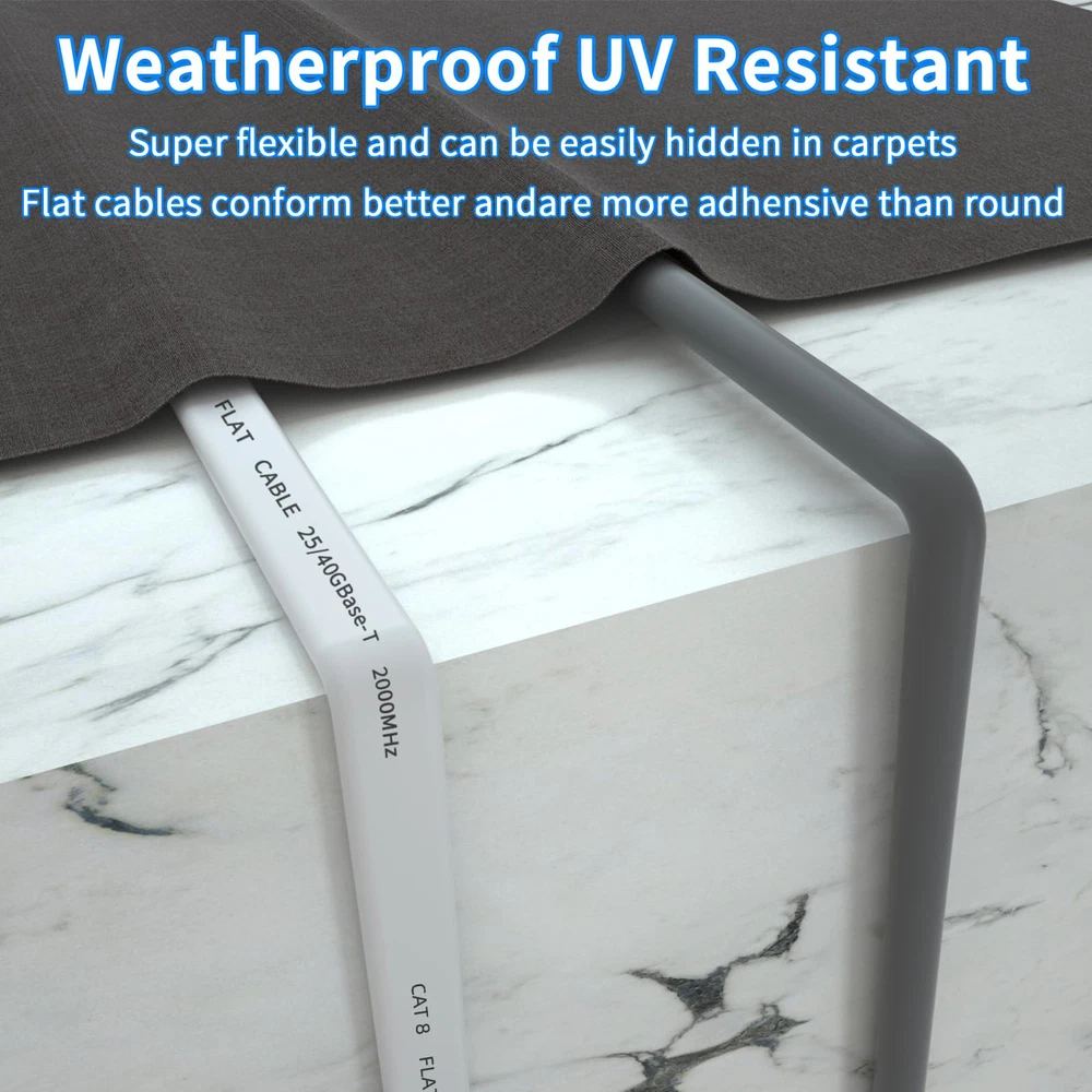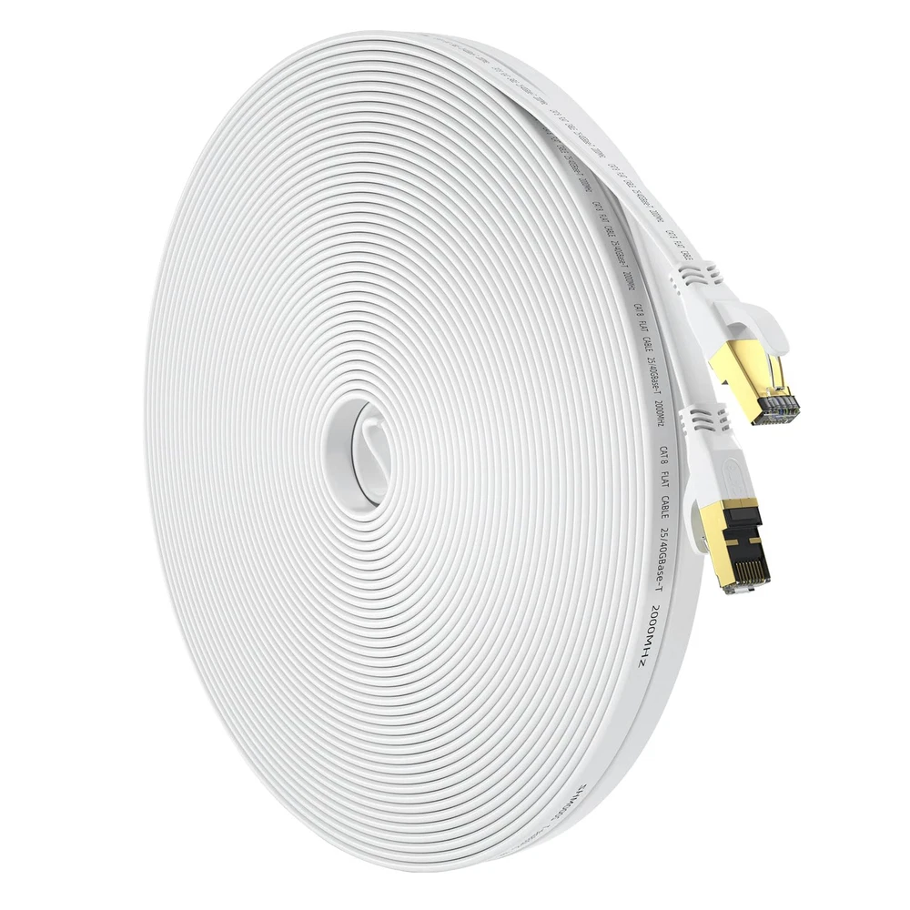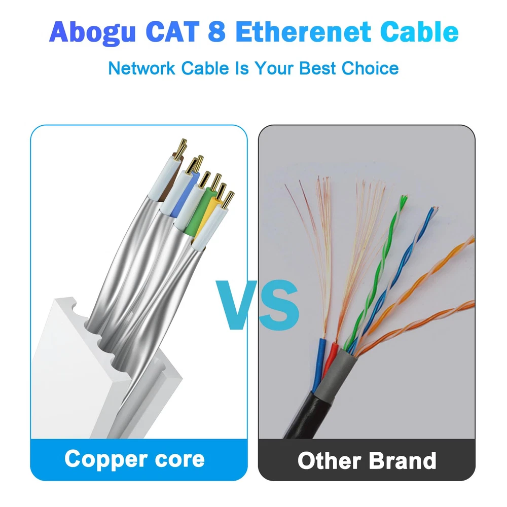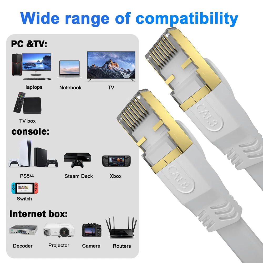 Cat8 Ethernet Cable has a transmission rate of up to 40Gb/s and a working frequency of at least 2000Mhz, which is four times the working bandwidth of Cat6. It is suitable for short distance transmission and short distance connection in data centers, computer rooms, cloud computing computers.It is the first choice to replace SFP Optical module. Cat8 internet cable is compatible with Cat5, Cat5E, cat6, cat6A and Cat7 devices, and is applicable to network switches, routers, modems, PS3, PS4, X-boxes, patch panels, servers, network printers, laptops, couplers, hubs, Smart TV and any other devices with RJ45 connectors.The external material is made of environmentally friendly PVC, which meets the EU REACH and ROHS environmental regulations. The flat design makes the Ethernet cable more flexible during installation. It can pass through various complex environments such as wall corners, carpets, door seams, and windows. If you don't need the entire length, you can easily curl it into a loop without occupying space. Keep the room and usage area clean and tidy. The internal structure of Cat 8 network cable is composed of copper core, ground wire, and aluminum foil multi-layer shielding, consisting of 4 pairs of 100% 30AWG shielded twisted pair (STP) copper wires. It adopts a three-pronged structure chip, and the contact points are tightly connected to the wire core, with wear resistance, oxidation resistance, and RJ45 connector to ensure stable data transmission. We have professional customer service personnel. If you encounter any problems when purchasing and using the product, you can provide us with feedback at any time. Our customer service personnel will quickly and effectively answer and solve your questions, bringing you a satisfactory shopping experience.