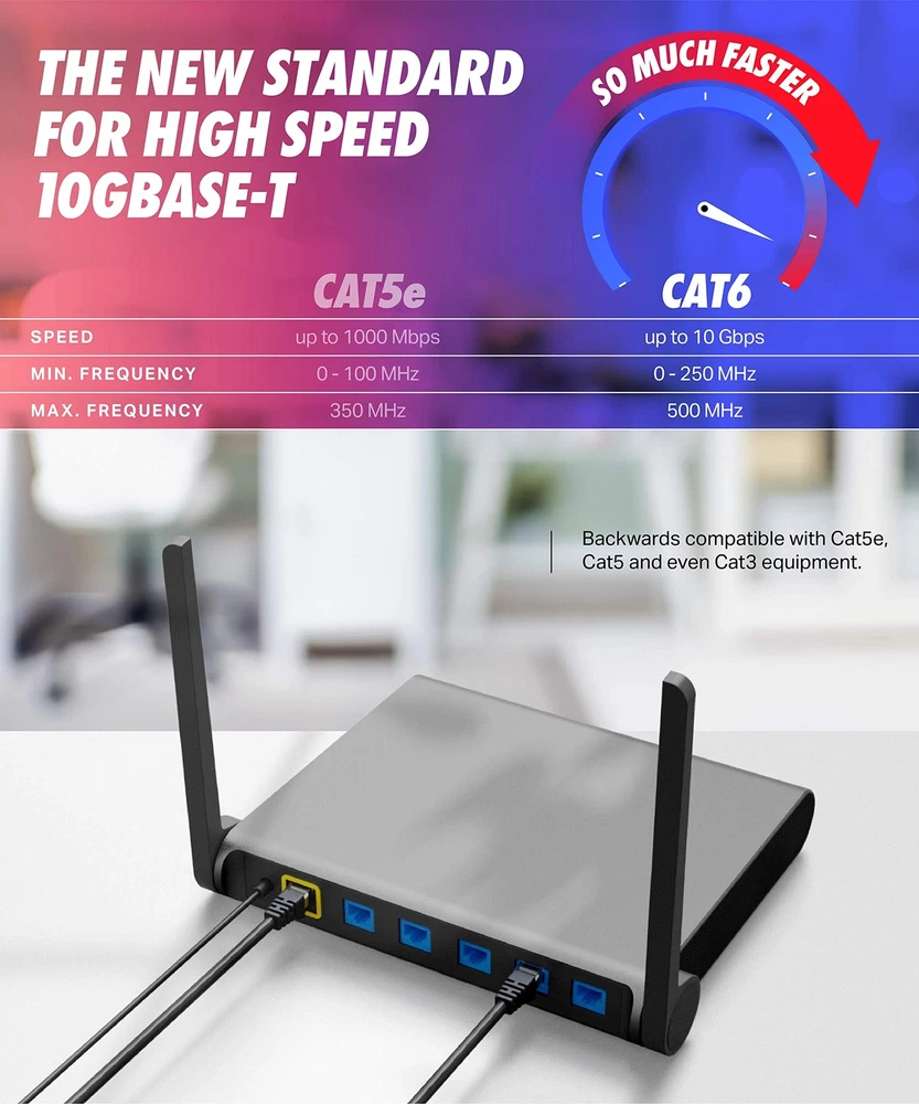 For those who want to future-proof their residential or commercial network as much as possible without a significant cost increase, the Cat 6 internet cable is a great choice. Cat6 cables are used for wired home and office networks, data transfer and phone lines and have been designed specifically for Gigabit ethernet applications. They perform at high-data transfer rates, provide exceptional transmission performance with low signal losses, support frequencies of up to 500 MHz, and are suitable for high-speed 10GBASE-T internet connection for LAN network applications such as PCs, servers, printers, routers, switch boxes, and more, while remaining fully backward compatible with your existing network. ALL our cat6 ethernet cable features 8 Flexible solid copper conductors 24 AWG. Each of the 4 unshielded twisted pairs (UTP) are separated by a PE cross insulation to isolates pairs and prevent crosstalk and covered by a 5.8mm PVC jacket with RJ45 connectors and gold-plated contacts. complies with TIA/EIA 568-B.38, is ETL verified and RoHS compliant. QUALITY CONTROL - Each Cat 6 internet cable 50 ft goes through rigorous testing to ensure a secure wired internet connection with exceptional speed and reliability PERFORMANCE -High performance Cat6 ethernet patch cables are designed with extremely well-matched components for outstanding uniform impedance and very low return loss, providing lower crosstalk, and a higher signal-to-noise ratio; They support frequencies of up to 500 MHz and are suitable for high-speed 10GBASE-T internet connection for LAN network applications such as PCs, servers, printers, routers, switch boxes, and more, while remaining fully backward compatible with your existing network CERTIFICATION - Cat6 Ethernet cable with CM grade PVC jacket complies with TIA/EIA 568-C.2, is ETL verified and RoHS compliant CONFIGURATION - The 15 feet cat 6 ethernet patch cable features 8 solid copper conductors 24 AWG; Each of the 4 unshielded twisted pairs (UTP) are separated by a PE cross insulation to isolates pairs and prevent crosstalk and covered by a 5.8mm PVC jacket with RJ45 connectors and gold-plated contacts; The molded strain relief boots help avoid snags that will damage your cables; They are molded for flexibility and resist common wear and tear