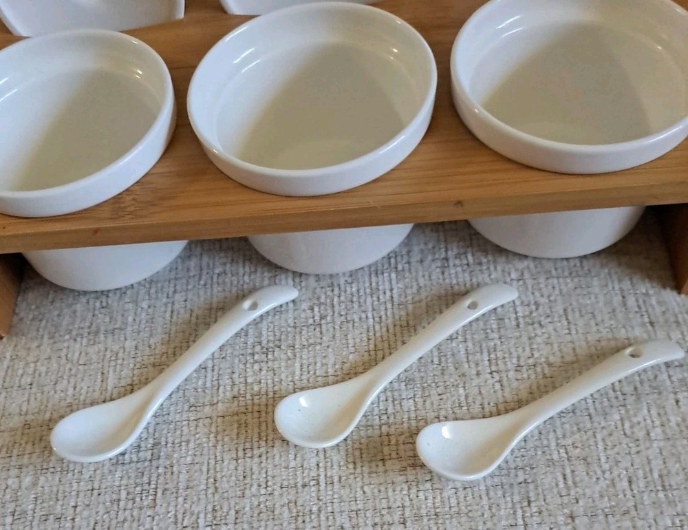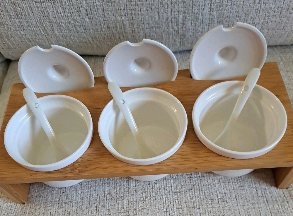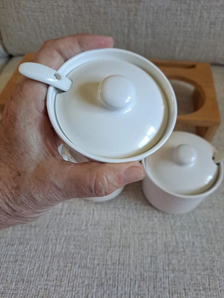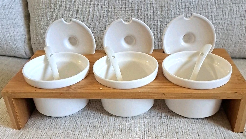 Welcone to my adventure in downsizing. This set has been used once, washed, and stored. A Ceramic Condiment 10 piece Set by Semito , includes three round white ceramic jars with lids and spoons, perfect for organizing your kitchen storage. The set also features a drop-in bamboo display rack, adding a stylish touch to your kitchen decor. Made in China, this set is a practical and elegant addition to any home kitchen.
