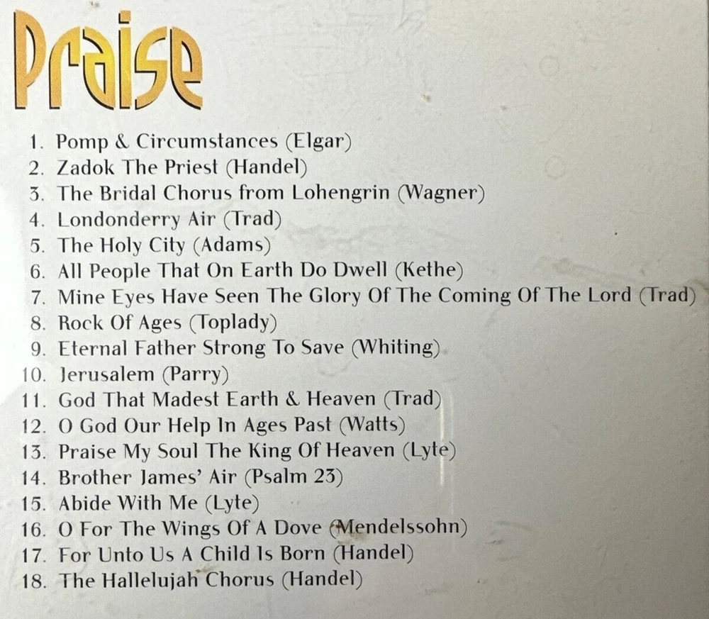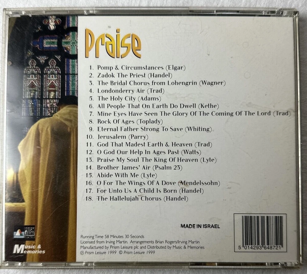 Hello and welcome to our listings. Don't you love it when you find a GREAT DEAL? I have to sell a bunch of my Christian artist CDs so grab as many as you can. I'll combine the shipping to save you some money. Today I am offering you this amazing CD "Praise" featuring 18 beautiful songs by the London Philharmonic Choir accompanied by The National Philharmonic Orchestra. This CD would be a great addition to any music collection. 1 Pomp And Circumstance 2 Zodok The Priest 3 The Bridal Chorus 4 Londonderry Air 5 The Holy City 6 All People That On Earth Do Dwell 7 Mine Eyes Have Seen The Glory 8 Rock Of Ages 9 Eternal Father Strong To Save 10 Jerusalem 11 God That Madest Earth And Heaven 12 O God Our Help In Ages Past 13 Praise My Soul The King Of Heaven 14 Brother James Air 15 Abide With Me 16 O For The Wings Of A Dove 17 For Unto Us A Child Is Born 18 The Hallelujah Chorus These CDs are in excellent Condition with minor surface scuffs. They'll play back perfectly. I have other GREAT stuff up for auction so please check them out. Domestic Winners pays ONLY $5.98 SHIPPING. All items are packaged safely and securely. Please email me with any questions you might have.