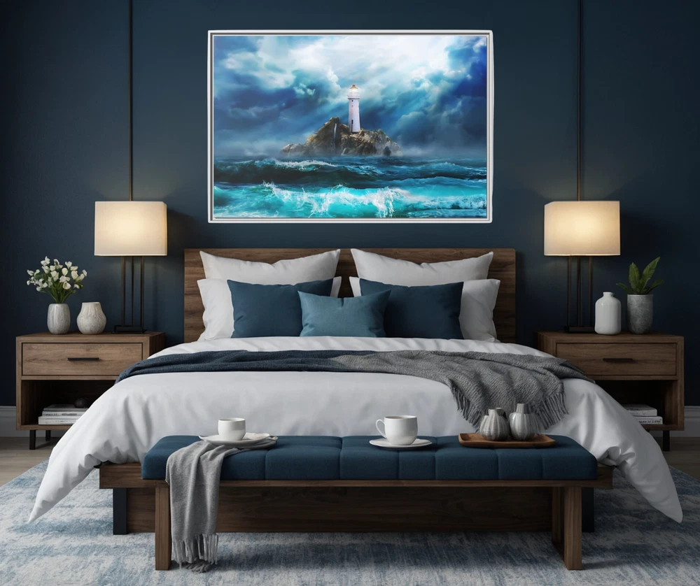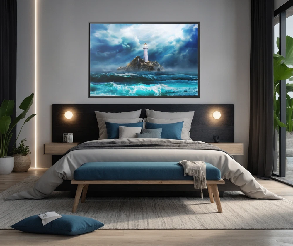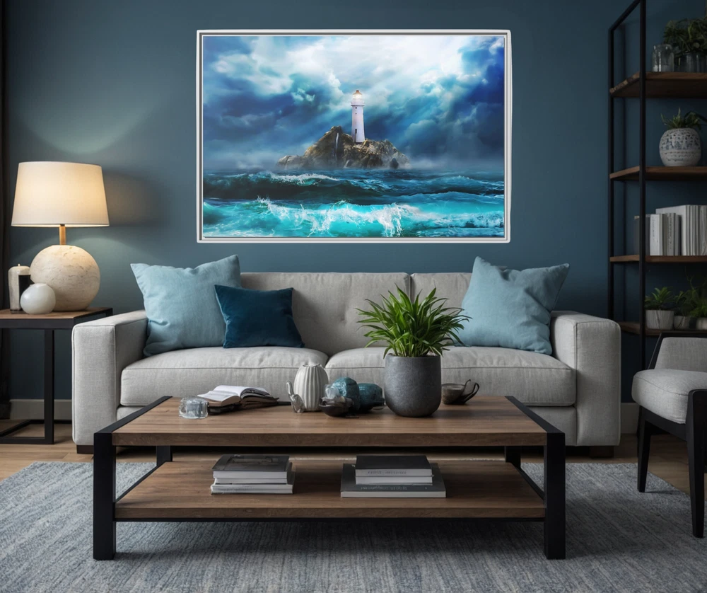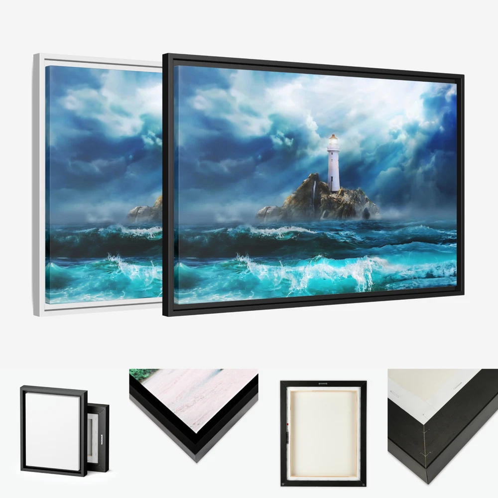 Cinematic Coastal Lighthouse Illustration by Hypnotik Creations Product Description: Immerse yourself in the serene beauty of the coast with this cinematic coastal illustration by Hypnotik Creations. This enchanting artwork features a picturesque white lighthouse perched atop a rocky island, complemented by a cascading waterfall and a mesmerizing blue surf seascape. Sunbeams pierce through dramatic clouds, casting a radiant glow across the scene, evoking a sense of nautical charm and tranquility. Expertly printed on museum-quality cotton-polyester composite gallery-wrapped canvas , this artwork boasts vibrant colors and remarkable detail, protected by a special proprietary matte finish coating for lasting brilliance. The high-definition imagery is produced using UL-certified Greenguard Gold inks and latex inks that are non-hazardous, non-toxic, and non-flammable. Encased in a 1.25" solid pine wood frame , available in white or black, the frame enhances the artwork with a modern floating effect. Sustainably sourced and Forest Stewardship Council certified , the frame is an eco-friendly choice, perfect for any interior space. The canvas comes ready to hang straight out of the box , equipped with sawtooth hanging hardware for hassle-free installation. Please note: slight size deviations may occur due to the production process (+/- 1/8", or 3.2mm). To maintain its pristine condition, simply wipe the surface gently with a clean, damp cloth if it gathers dust. Key Features: Cinematic Illustration: Features a lighthouse on a rock island, a small waterfall, blue surf, and sunbeams breaking through clouds. Premium Printing: Expertly printed on museum-quality cotton-polyester composite canvas with vibrant, long-lasting colors. Eco-Friendly Materials: Made with sustainably sourced Forest Stewardship Council-certified pine wood . High-Quality Inks: Utilizes UL-certified Greenguard Gold inks and latex inks that are safe, non-toxic, and non-flammable. Modern Framing: 1.25" solid pine wood frame in black or white with a floating effect. Ready to Hang: Equipped with sawtooth hardware for easy installation. Durable and Low Maintenance: Matte finish coating protects against dust and fading; clean gently with a damp cloth as needed. Size Tolerance: Minor size deviations (+/- 1/8", or 3.2mm) due to the production process. Frame Color Options: Black & White. Size Options: 30x20, 36x24 & 48x32 Enhance your home or office with this nautical masterpiece , blending natural beauty with timeless coastal charm. * Shipping to Alaska, Hawaii, and unincorporated territories of the United States can take additional 7 ? 12 business days, weather permitting.