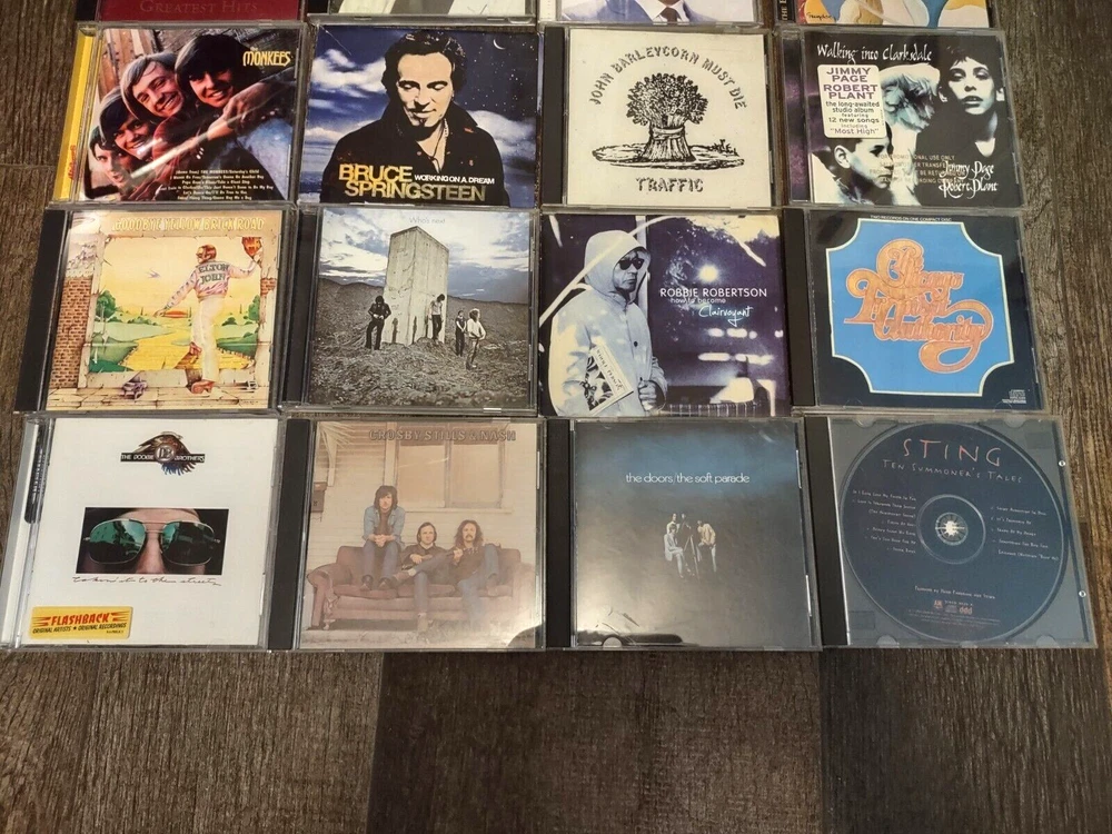 20 release CD lot includes: Jimi Hendrix - Smash Hits" 1972 Reprise 075992723824 Derek & The Dominos "Laya & Other Assorted LOve Songs" 1970 Polygram UPC 731453182028 The Beatles "1" 2000 Capitol / Apple Records UPC 724352932528 The Doobie Brothers – "Takin' It To The Streets", 1976, Warner Bros, 081227991241 Queen – "Greatest Hits", 1992, Hollywood Records, 720616126528 David Bowie - "ChangesBowie" 1980, RykoDisc, Music Club version Bruce Springsteen – "Working On A Dream", Columbia, 886974135524 Cheap Trick "At Budokan" EPIC Records 07464357952 The Who "Who' Next" MCA 008811126926 Traffic "John Barleycorn Must Die: Island BMG Music Club edition Crosby Stills & Nash "Crosby Stills & Nash" Atlantic 075678265129 Elton John "Goodbye Yellow Brick Road" Polydor 020831471060 (Columbia House Record Club version) Jimmy Page & Robert Plant – "Walking Into Clarksdale", 1998, Atlantic Records, 075678309229 (promotional copy) George Thorogood & The Destroyers – "Bad To The Bone", 1982, EMI/Manhattan, 077774608329 Robbie Robertson – "How To Become Clairvoyant", 2011, 429 Records, 795041782120 Monkees - "The Monkees" 1994 Rhino 0208311027223 Columbia House Record club version Sting - "Ten Summoner's Tales", 1993, A&M Records (No art work - CD in case only) Chicago - "Chicago Transit Authority" 1969 Chicago Records 703404300126 Doors - "Soft Parade" 1975 Elektra Records 075596067323 Buddy Holly - The Best of 20th Century Masters 1999 MCA Records 008811195625