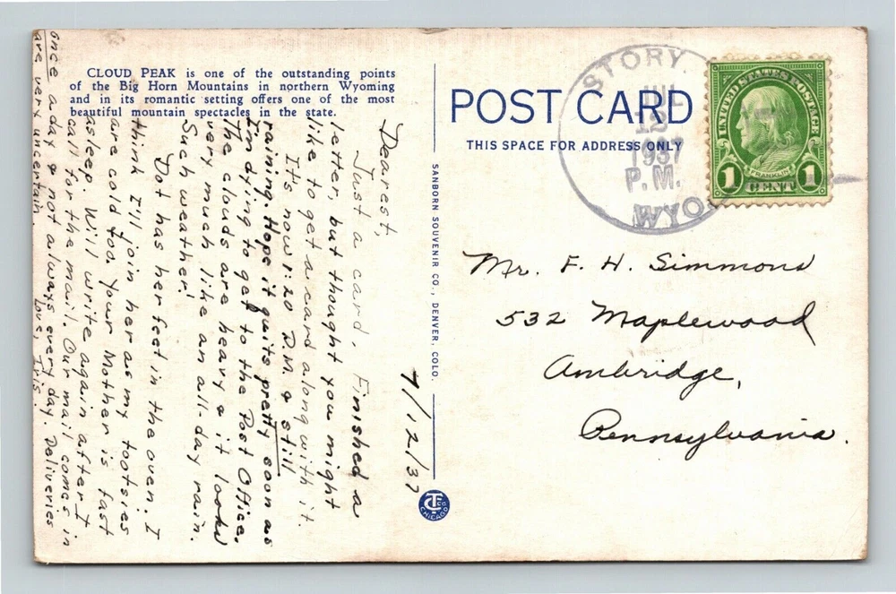 Original/Licensed Reprint: Original Country: See Postcard Scan Type: Printed (Lithograph) City/Region: Big Horn Mountains Postage Condition: Posted Era: See Postcard Scan Continent: North America Circulated: Yes Unit of Sale: Single Unit Theme: Cities & Towns City: See Postcard Scan Subject: See Postcard Scan Region: See Postcard Scan Country/Region of Manufacture: Unknown