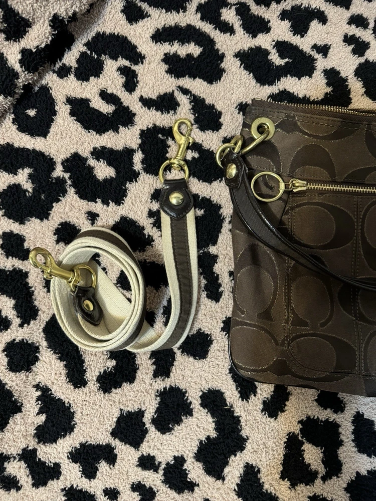 This Coach Poppy crossbody/handbag is a must-have for any fashion-forward woman. The metallic exterior material gives the bag a unique and stylish look, while the black and brown color combination adds a touch of classic elegance. The bag features a zip closure and a thin design, making it perfect for everyday use. With a size of 12 inches in width and 10 inches in height, this medium-sized bag is spacious enough to carry all your essentials. The bag also has a black lining color and features the Coach Poppy logo pattern, adding a designer, Y2K, and punk vibe to the overall look. The strap drop measures 7 and 23 inches, making it convenient to carry on your shoulder or across your body. This Coach Poppy crossbody/handbag is a perfect addition to any collection and is sure to make a statement wherever you go.