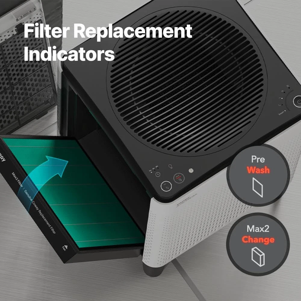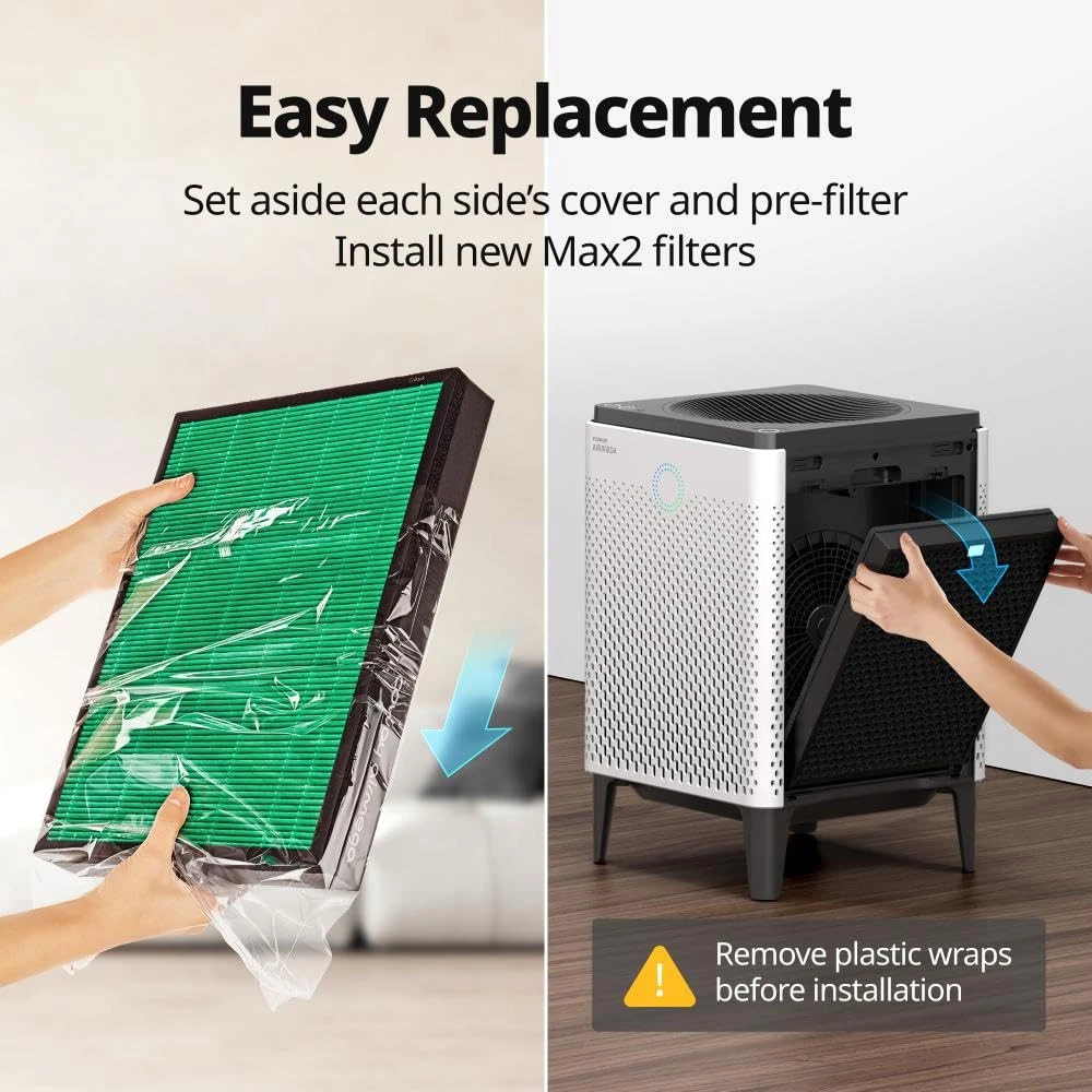 The Coway Airmega Max2 filter-combined activated carbon and Green True HEPA filter-captures. Reduces up to 99.99% of 0.1 micron particles in the air, including pollen, pollutants and other allergens. It also reduces volatile organic compounds by more than 99% and reduces fumes such as NH3 and CH3CHO. Design to fit Coway Airmega 400/400S Series The Coway Airmega Max2 filter is an all-in-one HEPA filter system that combines Green True HEPA filter technology with an Activated Carbon filter. True HEPA filter captures and reduces up to 99.99% of 0.1-micron particles in the air, including pollen, pollutants and other allergens and reduces fumes such as NH3 and CH3CHO. Activated Carbon filter reduces more than 99% of odor from food, cigarette, and pets as well as volatile organic compounds. Coway Airmega Max2 filter has an average of 12-month lifespan with 1560 sq.ft. coverage.
