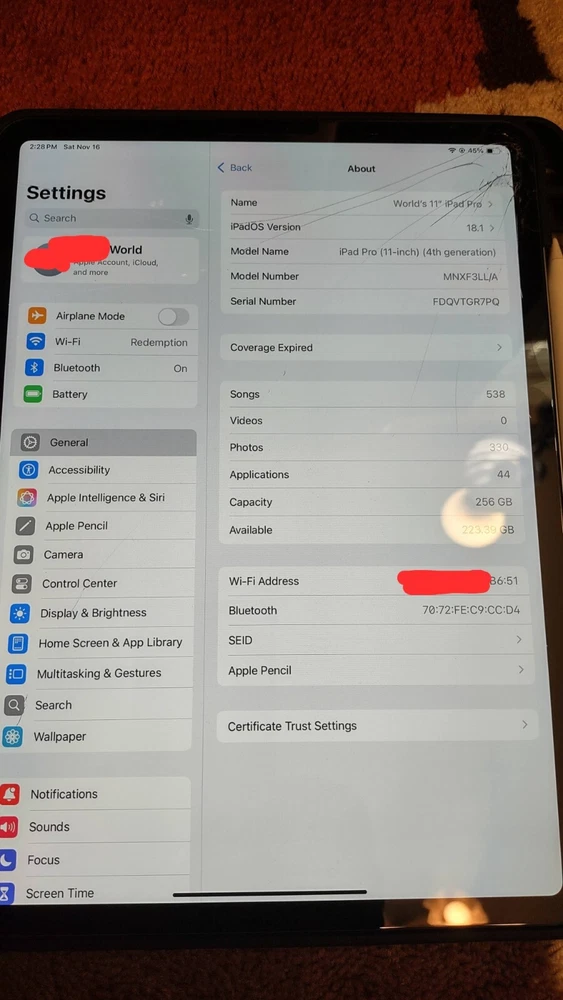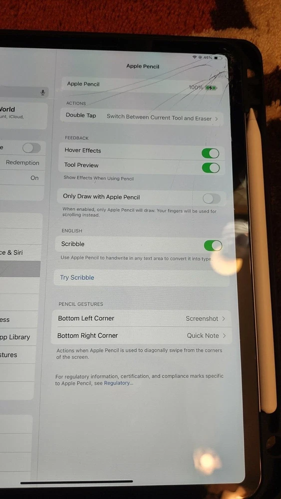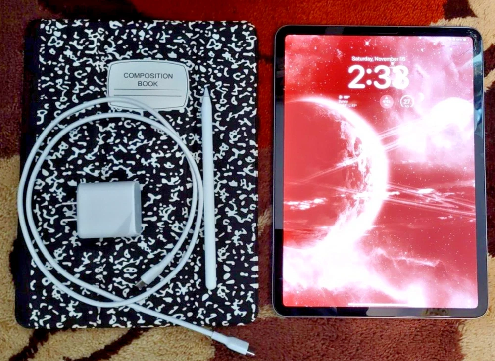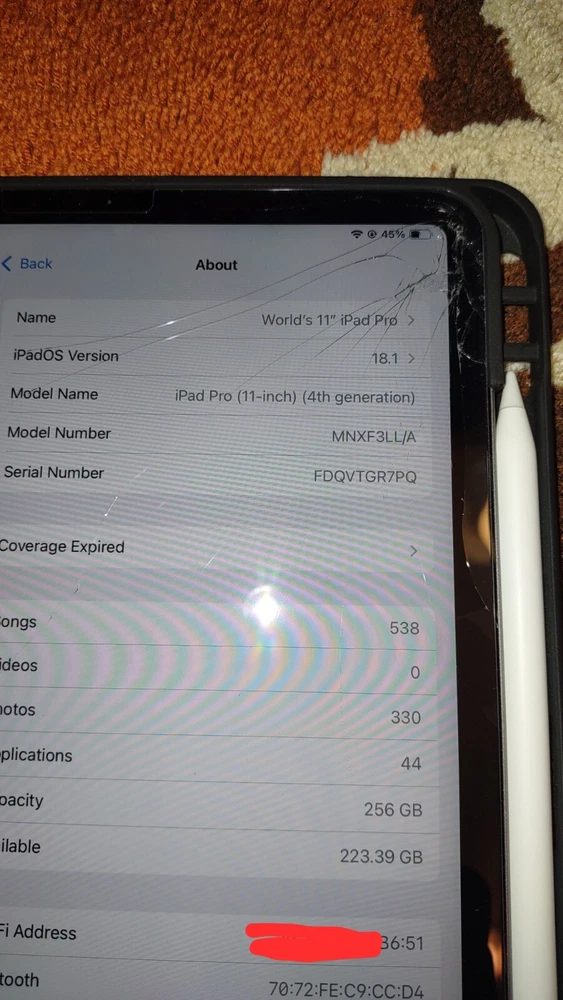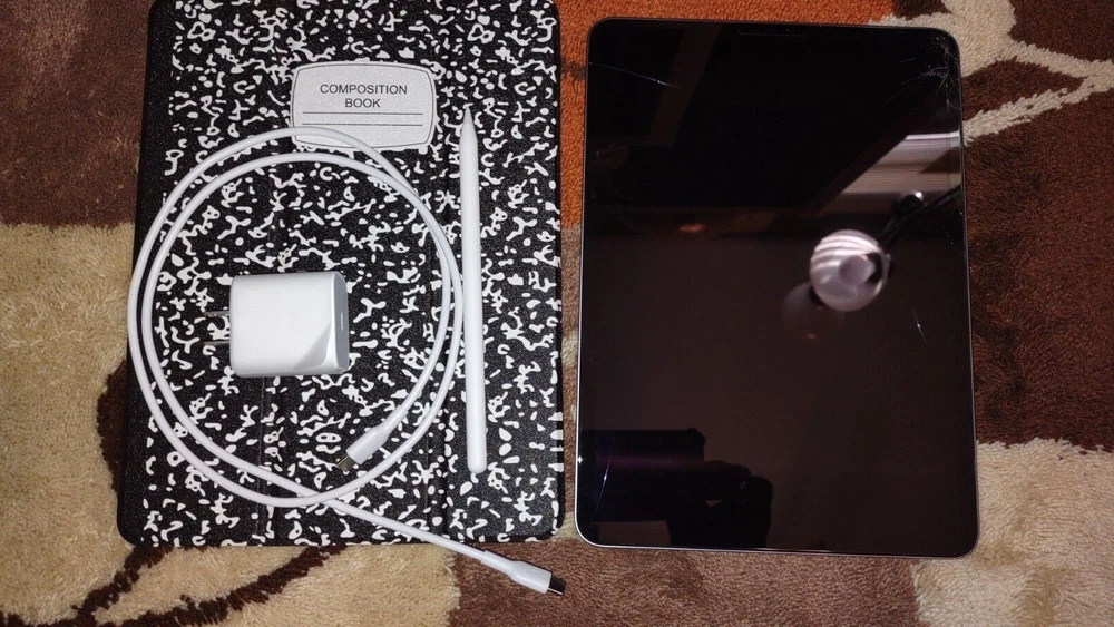 The iPad works as should (audio/wi-fi/bluetooth/front and rear camera/touch screen operation/apple pencil gliding); but the screen is cracked. The rest of the iPad's body is imperfection-free. You will receive the 4th gen iPad pro, 2nd gen Apple pencil, the power/sync cord, 20w power adapter, and the 'composition book' ipad case. A glass screen protector has been installed over the cracked screen. Battery life is great. Apple 2nd Generation pencil works as should;and the battery life is also, great. No box is included, sorry.