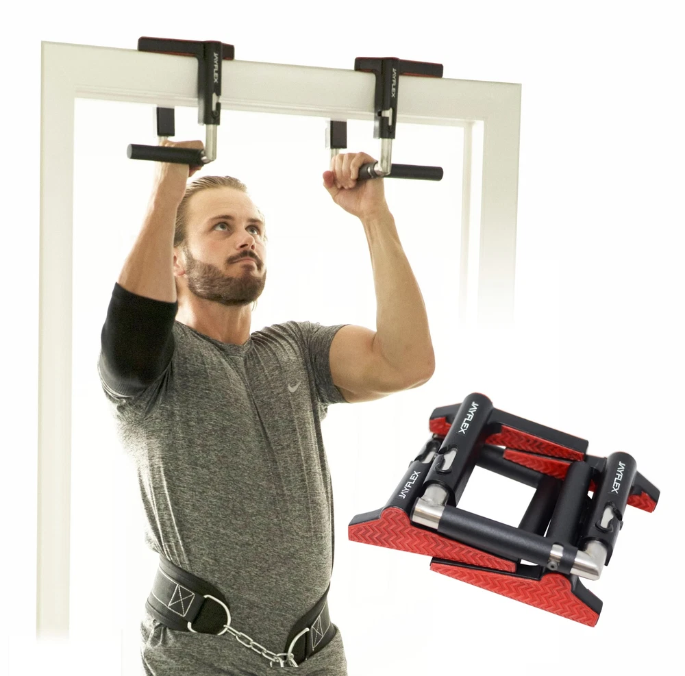 PORTABLE DOORWAY GYM: Work from home fitness has never been easier with CrossGrips - portable pull up bar handles. Transform any doorway into an at-home pull up bar with these door frame pull-up bar. FULL UPPER BODY WORKOUT: Get a complete upper body workout with this pull up bar for doorway - adjust to narrow, wide, and neutral grips for pull-ups, chin-ups, push-ups, and dips. Strengthen with one of the best strength training pull ups bars available. EASY SETUP: The no screw door pull up bar is ready for use in 15 seconds - no tools needed. These doorway pull up bars are foam-lined, interlock for easy storage, and boast a 250 lbs capacity. SECURE AND ADAPTABLE: Our chin up bar doorway design is patented and securely fits on doors with 2-4" molding and 4.5-7.5" frame thickness. Portable pullup bar for doorway or over door pull up bar, the CrossGrips hanging bar is perfect for your door gym. TRAVEL COMPANION: This doorframe pullup bar with no screw needed design is lightweight and portable. Use it as hanging bar for exercise equipment at home and take it with you for a workout on the go - perfect for home exercise equipment or strength training equipment.