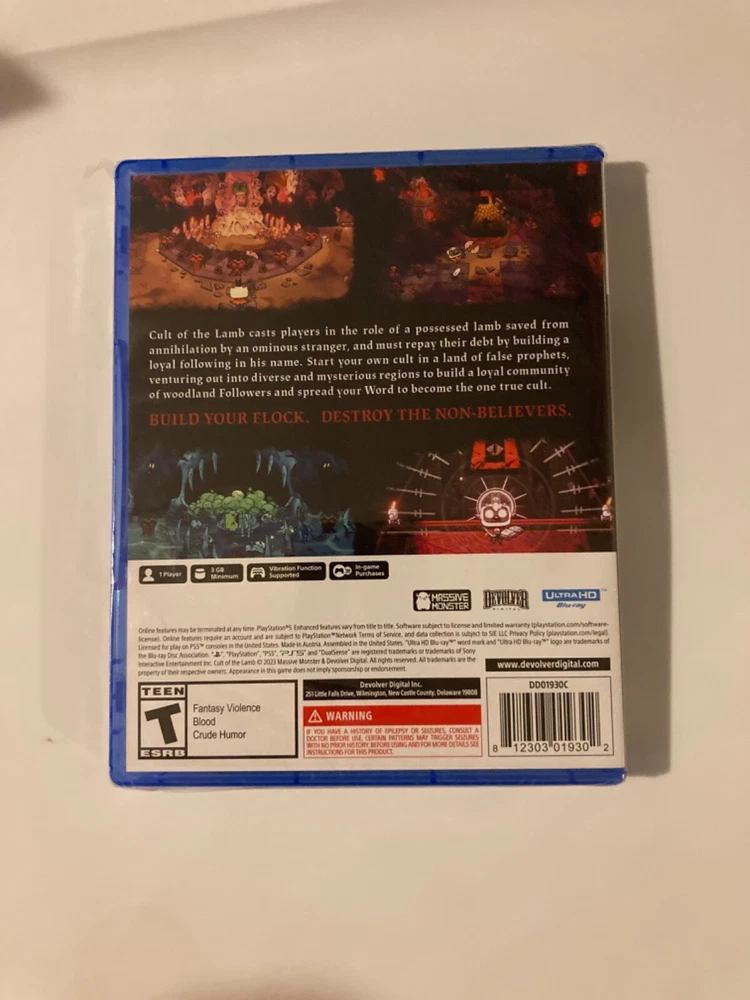 Video Game Series:Cult of the LambPlatform:Sony PlayStation 5gtin13:812303019302MPN:DD01931Region Code:Region FreeGenre:Action & Adventure, Strategy, Roguelike, IndieRating:T-TeenFeatures:Physical Edition, Standard EditionPublisher:SonyUPC:812303019302Release Year:2023Game Name:Cult of the LambCountry/Region of Manufacture:United States