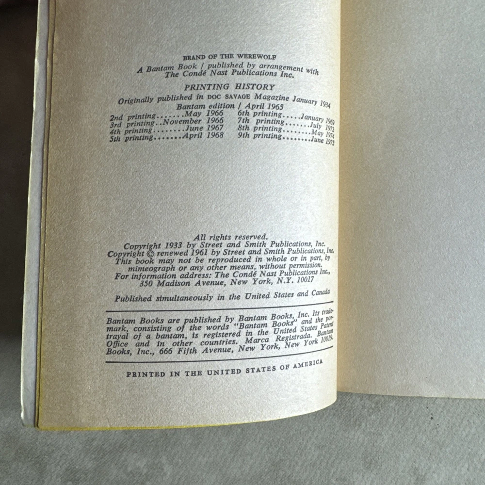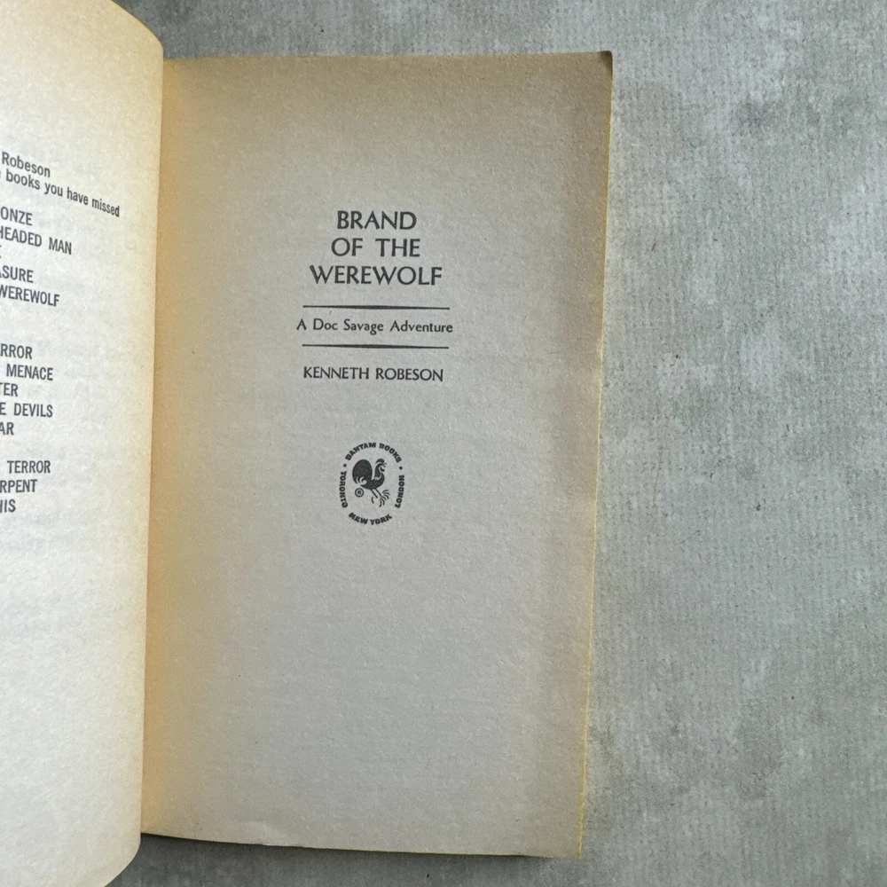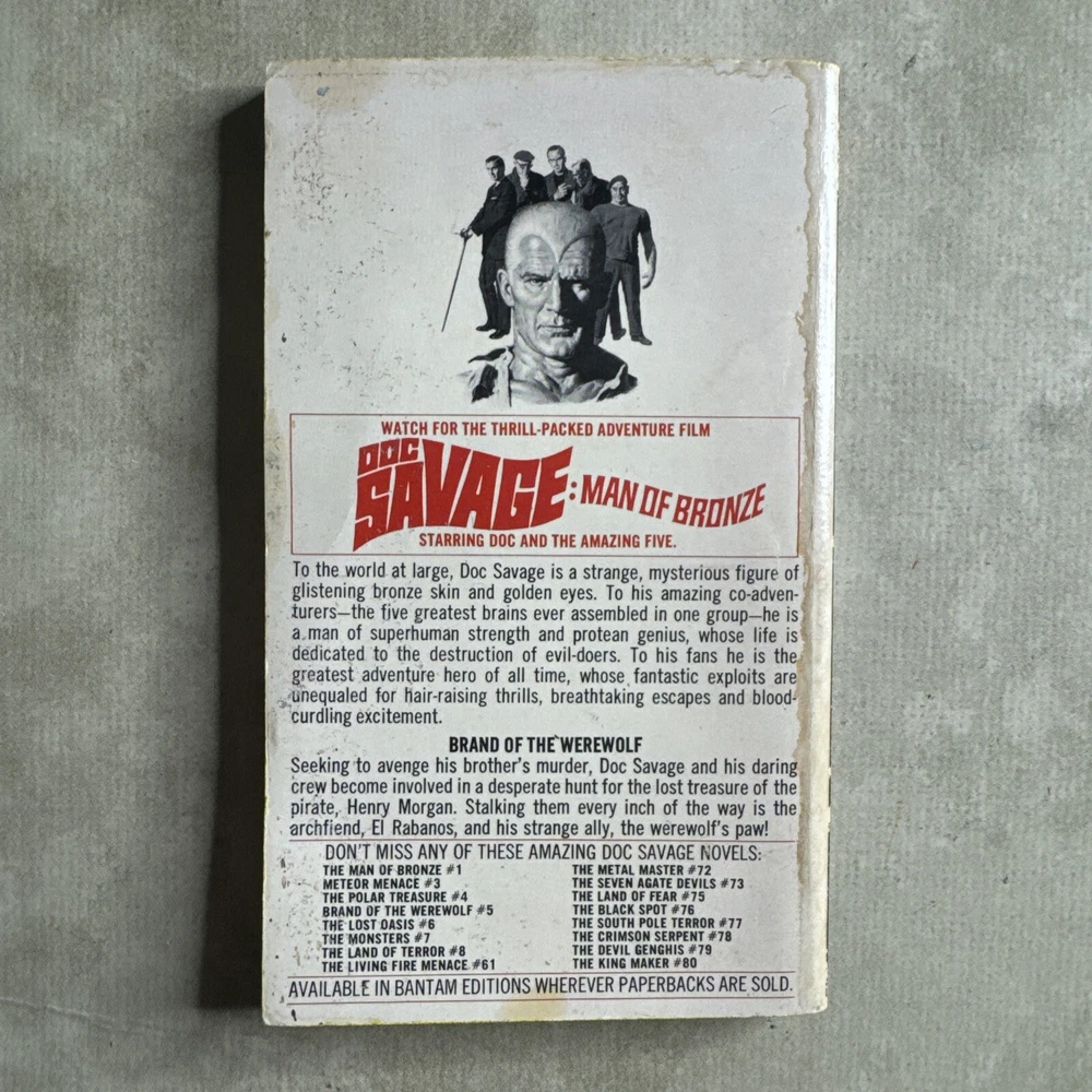Genre:Actiongtin13:n/aPublication Year:1965Topic:actionAuthor:Kenneth RobesonBook Series:Doc SavageLanguage:EnglishISBN:n/aBook Title:Doc Savage brand of the werewolfVintage:YesPublisher:Bantam BooksFormat:Paperback