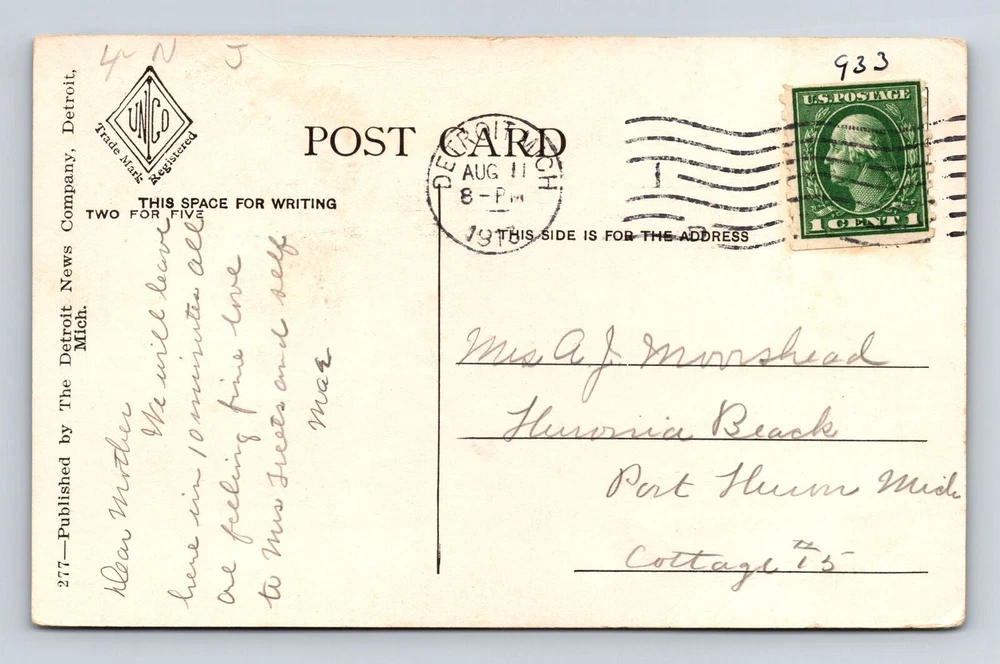 Country/Region of Manufacture: Unknown Subject: Cities & Towns Country: USA Unit of Sale: Single Unit Type: Printed (Lithograph) Region: Michigan Original/Licensed Reprint: Original Postage Condition: Posted City: Detroit Era: Vintage Theme: Cities & Towns