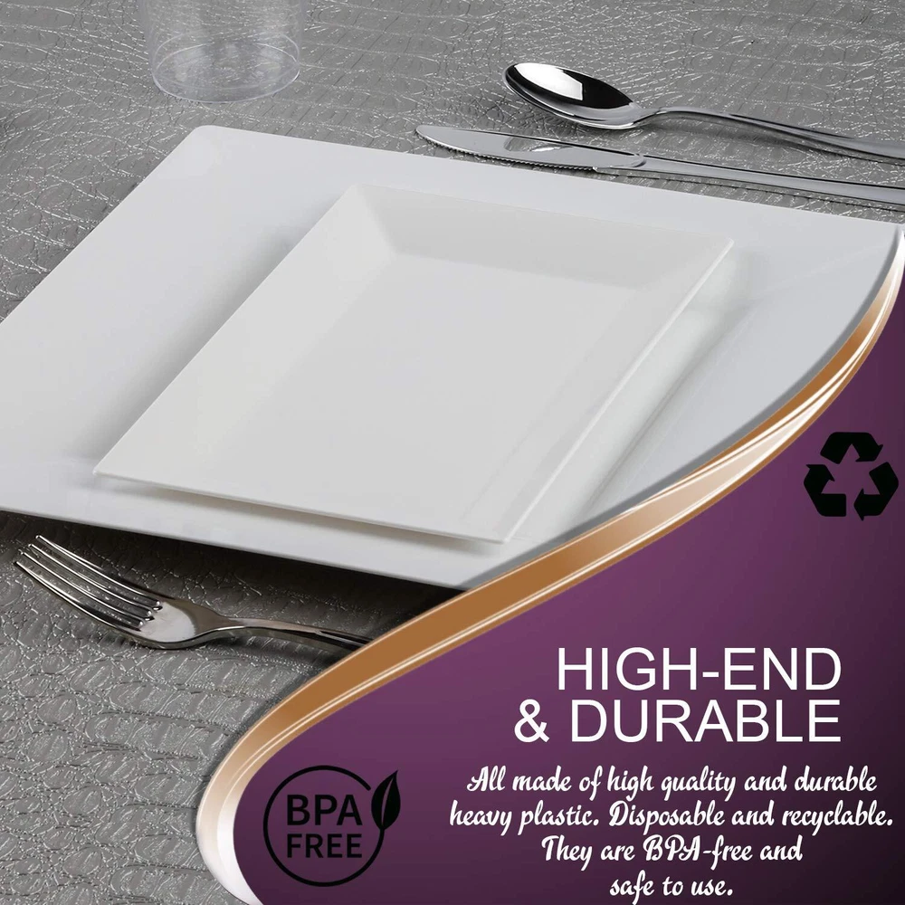 FANCY AND ELEGANT DESIGN – These rectangle white plastic dessert plates add sophistication to weddings, birthdays, and all events. Perfect for serving salads, appetizers, or cakes with style. SERVES 120 GUESTS – This set includes 120 plastic plates, perfect for large gatherings. These party plates make hosting easy with enough dessert plates for every guest. DURABLE AND HEAVY-DUTY – Crafted from premium materials, these plates are disposable yet sturdy enough to handle heavy portions. Say goodbye to flimsy, low-quality plastic plates! CONVENIENT AND DISPOSABLE – Save time and effort with these disposable plates. Enjoy your party without worrying about dishwashing – just toss them after use! PERFECT FOR ALL OCCASIONS – Ideal for weddings, birthdays, and parties, these plastic plates for party settings bring elegance and convenience to your table.