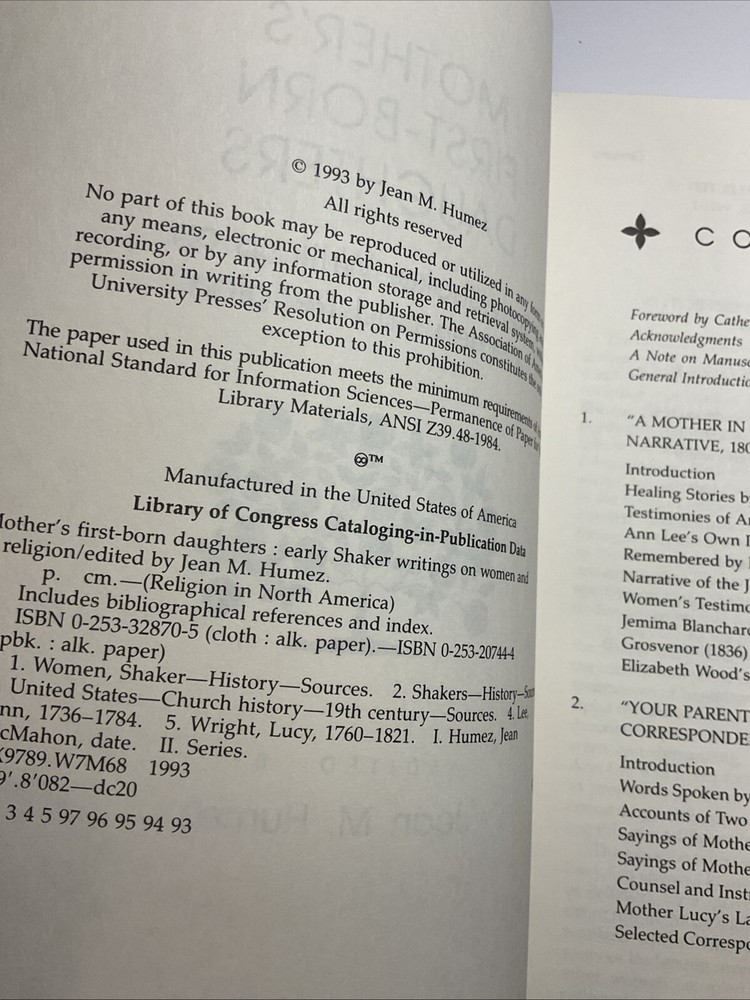 ISBN-13: 9780253207449 Format: Trade Paperback Book Title: Mother's First-Born Daughters Item Width: 6.1 in Item Length: 9.3 in Type: Textbook Subject: Christian Church / History, Religious, General, Christianity / Shaker, Women's Studies, United States / General Item Weight: 19 Oz Publication Name: Mother's First-Born Daughters : Early Shaker Writings on Women and Religion Number of Pages: 336 Pages Item Height: 0.6 in Author: Jean M. Humez Language: English Publisher: Indiana University Press Subject Area: Religion, Social Science, Biography & Autobiography, History Publication Year: 1993 ISBN: 9780253207449 gtin13: 9780253207449 Series: Religion in North America Ser.