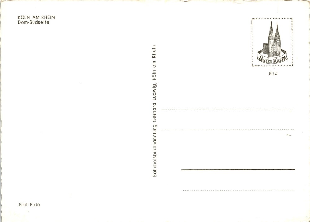 MAKE AN OFFER. THE MORE YOU BUY THE BETTER DEAL I WILL ACCEPT This postcard is a real photo of the south side of the Cologne Cathedral (Dom) in Cologne, Germany, along the Rhine River. It features the Bahnhofsbuchhandlung Gerhard Ludwig, a bookstore located in Cologne. The postcard is from the Bales series, numbered 80a.