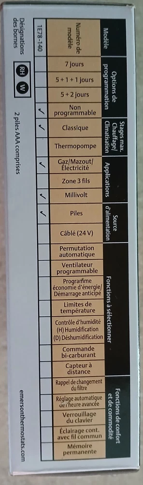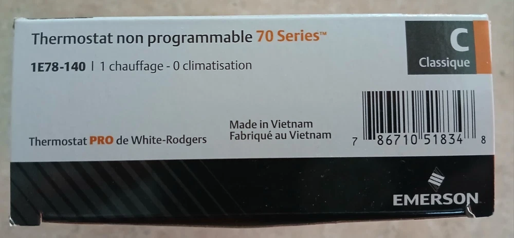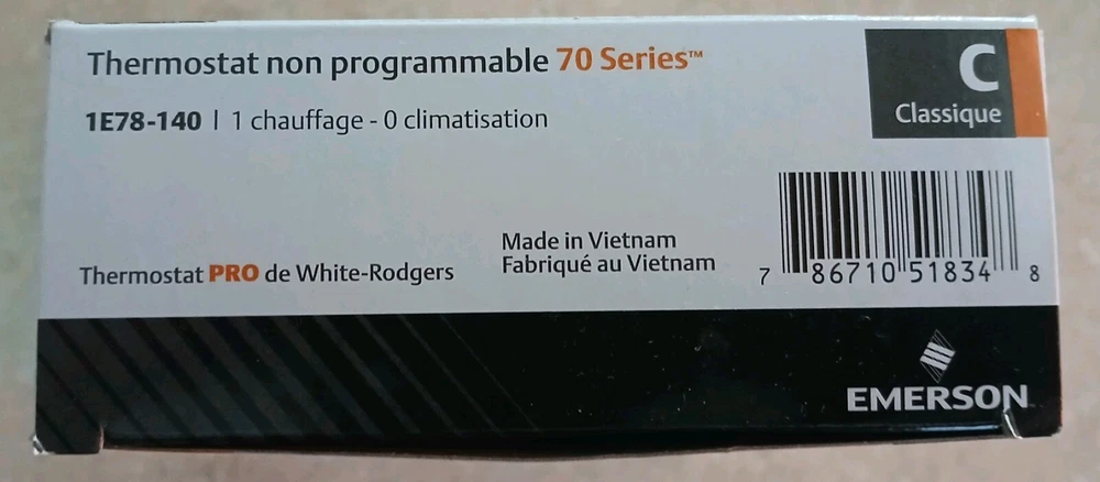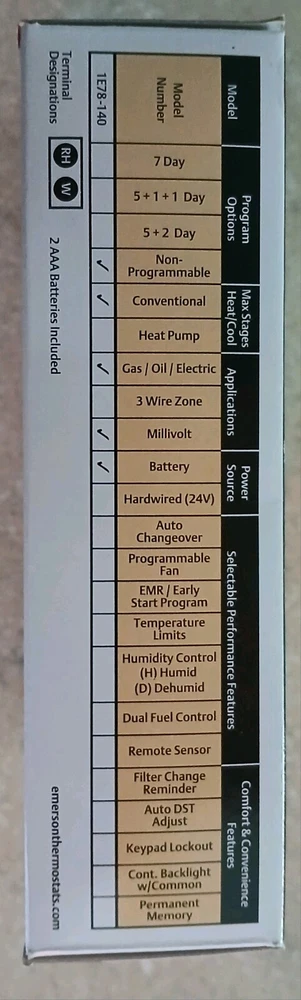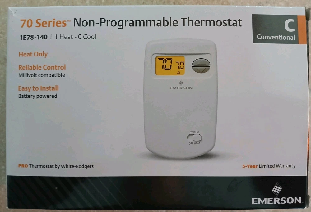 New in box Emerson Non-programmable Thermostat 70 Series 1E78-140 Heat Only, reliable control, Easy Install. Ships quickly to you by the next business day. Designed to work with single-stage heating systems only is the Emerson 1E78-140 thermostat. Use it with 24-volt and millivolt systems. It is not compatible with electric baseboard heat. Easy-to-read digital display with backlight Non-programmable thermostat Compatible with single stage heat only systems Precision control of plus/minus 1F Vertical profile Millivolt compatible Please see the pictures for all the details listed on the box.