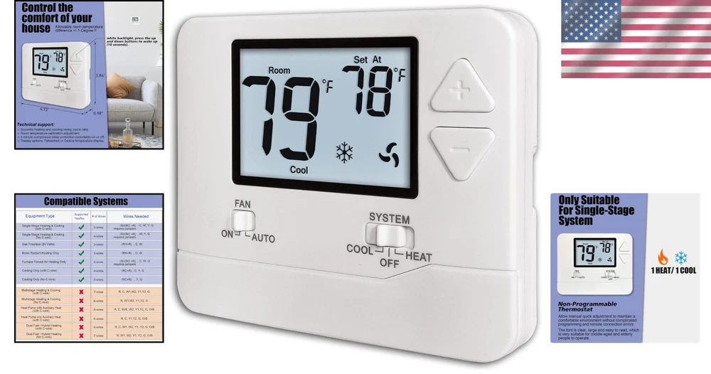 Energy-Saving Non-Programmable Thermostat for Home Heating and Cooling Control ‹ › ‹ › ‹ › ‹ › ‹ › ‹ › ‹ › ‹ › ‹ › ‹ › ‹ › Energy-Saving Non-Programmable Thermostat Your ideal solution for efficient home heating and cooling control. Product Overview: Designed for compatible systems: Single-Stage Heating & Cooling, Gas/Oil/Electric Furnace, Boiler Radiant, and more. Not suitable for Multistage Heat & Cooling, Heat Pump Systems,Mini Split Systems, and other specific types. Specifications: Accurate temperature control of +/- 1-Degree F for consistent comfort. Room temperature display range: 41°F to 95°F. Temperature control range: 44°F to 90°F. Support for both 24VAC Power or 2 AAA Batteries. No Common Wire (c-wire) required on most single-stage systems. Features: Separate Heating and Cooling Swing (Cycle Rate) to optimize energy usage. Low battery indicator with an accessible change reminder. 5-minute compressor delay protection (Selectable on or off). Large, clear backlit digital display for easy reading, perfect for middle-aged and elderly individuals. Why Choose Our Thermostat? Seeking a seamless way to regulate your home’s climate while reducing energy costs? Our Energy-Saving Non-Programmable Thermostat is precisely engineered for single-stage systems, helping maintain the ideal temperature with exceptional accuracy. Enjoy the benefits of reduced energy usage and lower annual heating and cooling expenses — all while benefiting from ease of installation and usage. With customer care at our forefront, we support you with a 30-day free return policy and a 2-year worry-free warranty. Experience the difference today — control your comfort more efficiently and effortlessly. Important Precautions: Verify compatibility with your heating/cooling system before purchasing. Measure the size to ensure it covers any marks left by your previous thermostat. If you encounter any issues, feel free to contact us — we are here to assist you within 24 hours! Shipping Free & Fast Shipping - We offer free shipping to most of the USA with a normal delivery time of 3-7 days. However, due to the current situation, additional delivery time (up to 3 weeks) may be required for some items. Alternative Carriers - We may use alternative carriers (e.g. USPS, FedEx, UPS, etc.) to ensure your package arrives safely and on time. Due to the use of multiple carriers, we are unable to provide a tracking number automatically. Handling Time - Orders are processed and shipped within 1-2 business days of receiving cleared payment. Shipping Restrictions - Shipping to Alaska, Hawaii, Puerto Rico, Guam, and other US territories may incur shipping charges or delivery restrictions. Please contact us before ordering, or your order can be refunded/cancelled. State Restrictions - There may be restrictions based on your state of purchase. For example, certain items may not be shipped to California due to state regulations. Contact for Tracking Updates - If you require tracking updates or have any concerns about the delivery of your order, please feel free to contact us, and we will be happy to assist you. Return 30-Day Hassle-Free Returns - We want you to be completely satisfied with your purchase. If you are not, you can return the item within 30 days of receiving it for a full refund or exchange. Easy Return Process - To start a return, simply contact us and we will provide you with a prepaid return shipping label and detailed instructions. Restocking Fee - There are no restocking fees for returns. However, the buyer is responsible for return shipping costs if the return is not due to a seller's error. Refund Processing Time - Refunds will be processed within 5 business days of receiving the returned item in its original condition. Payment We accept all major credit cards, PayPal, and Apple Pay for your convenience. Your payment information is secure and encrypted to ensure a safe and seamless transaction. Please complete your payment within 3 days of purchase to avoid any delays in shipping. Feedback Your feedback is extremely important to us. We strive to provide the best products and customer service possible. If you are satisfied with your purchase, please take a moment to leave us a positive review. If you have any concerns or issues with your order, please contact us before leaving negative feedback. We are committed to resolving any problems and ensuring your satisfaction. Contact Us If you have any questions or concerns, please feel free to reach out to our customer support team. You can contact us through the eBay messaging system. We are available Monday to Friday, 9:00 am to 5:00 pm EST, and we will do our best to respond to your inquiry within 24 hours. Buy it now and enjoy a pleasant shopping experience! UPC: Not Set Model: Non-Programmable Thermostat Unit Quantity: 0.4 Control Style: Push Button Power Source: Battery,Corded Electric Compatible Product: Central Air Conditioner,Central Furnace,Gas/Oil/Electric Furnace,Boiler Radiant,Furnace Forced-Air,Gas Fireplace Smart Home Compatibility: Universal Smart Home Protocol: None Compatible Model: Heagstat H701 Material: Plastic Mounting: Wall-Mounted Features: Low Battery Indicator Items Included: Heagstat H701 Thermostat,Two Screws and Anchors,Installation Manual,Cable Label Protection Properties: None Resistance Properties: None Brand: Unbranded Color: White Backlight Thermostat Shape: Rectangular Programmability: Non-Programmable Cool Stages: 1 Voltage Type: Low Voltage Voltage: 24 V System Switching: Heat-Cool-Off Sensor Technology: Temperature Battery Size: AAA MPN: Not Set Display Size: 3 in (7.62 cm) Compatible Brand: Not Set Number of Periods per Programmable Day: 1 Wire Configuration: 2-Wire Heat Stages: 1 Year Manufactured: Not Set Country/Region of Manufacture: Not Set Manufacturer Warranty: Not Set Unit Type: lb