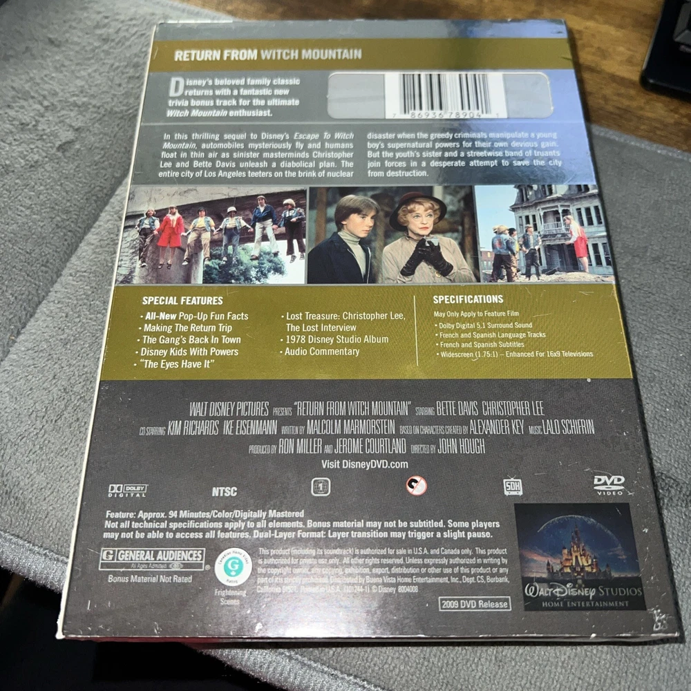Movie/TV Title:Return from Witch MountainSub-Genre:Live-ActionActor:Bette Davis, Christopher Lee, Ike Eisenmann, Kim RichardsDirector:John Houghgtin13:0786936789041UPC:0786936789041Rating:GFormat:DVDGenre:Children's & FamilyRelease Year:2009
