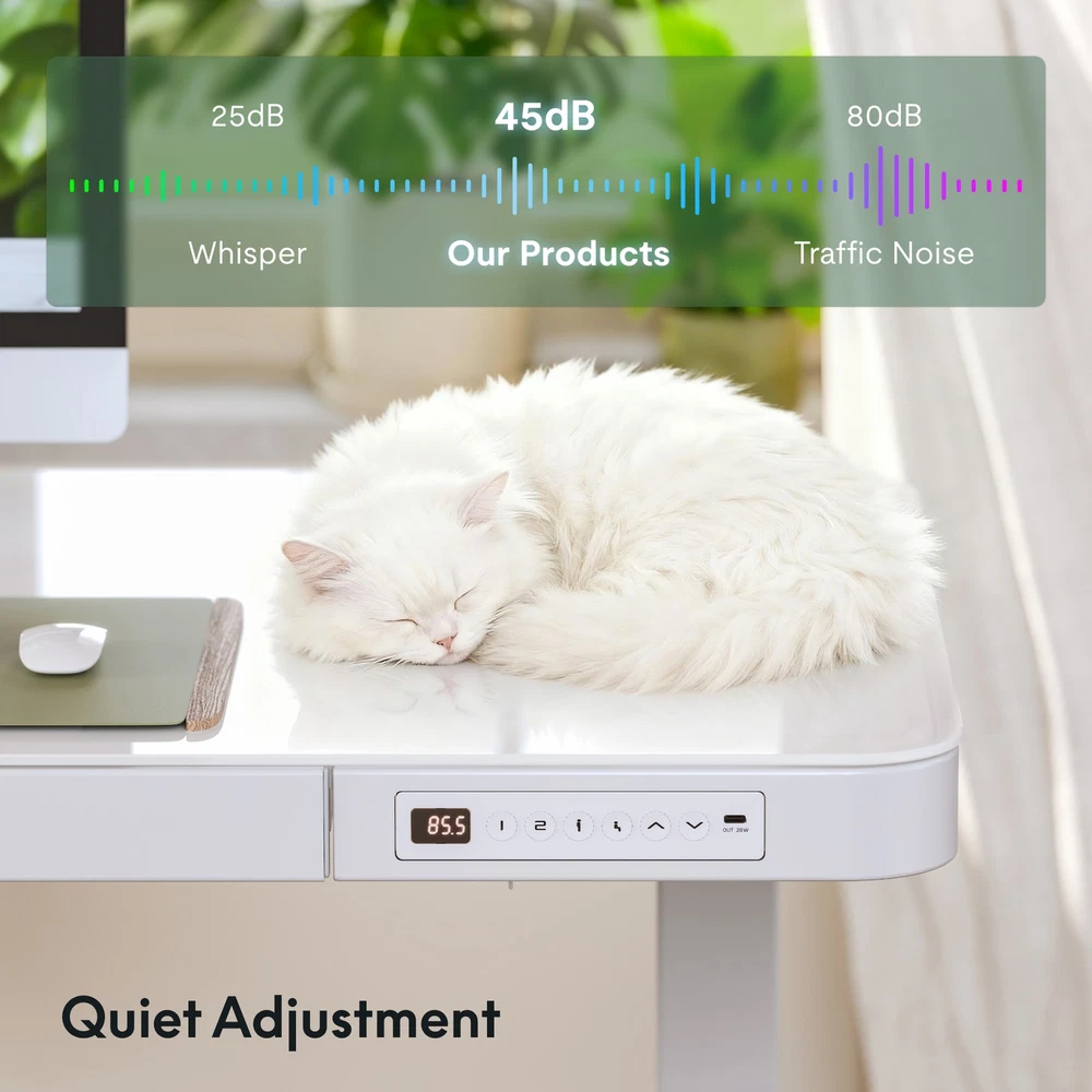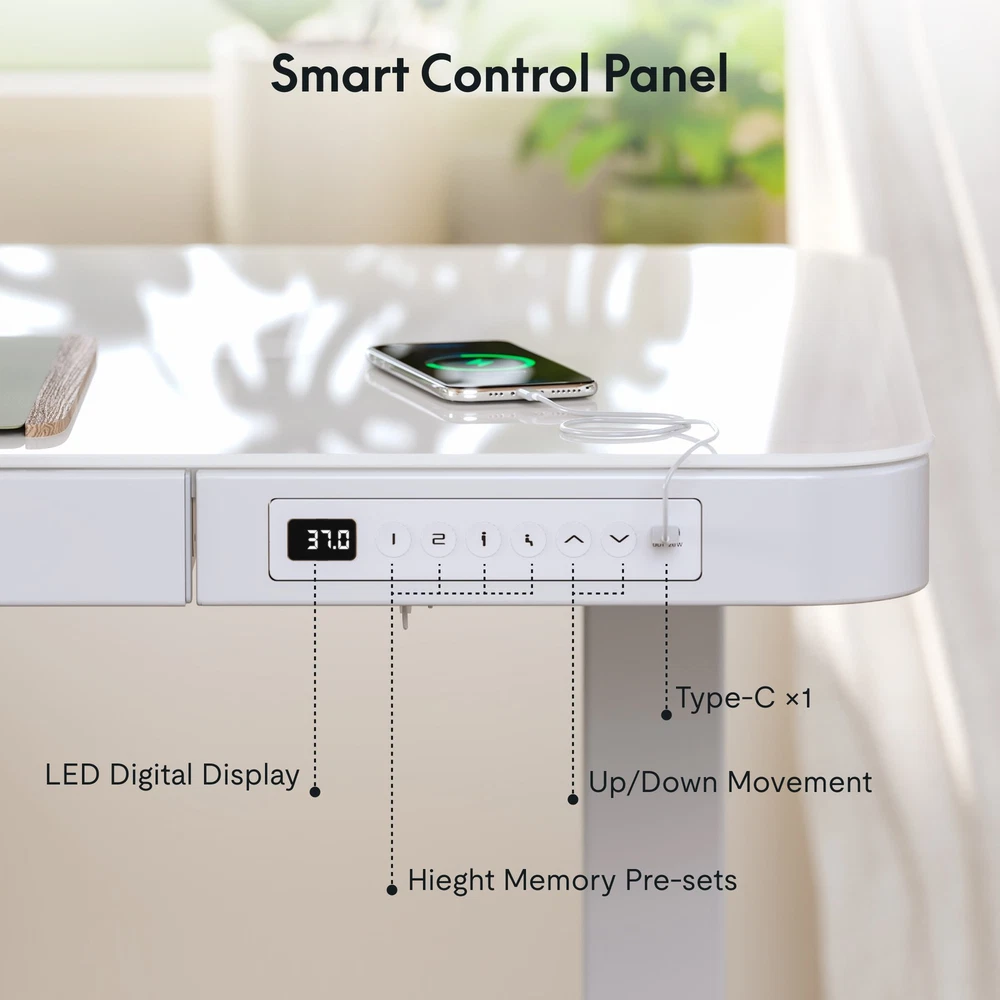 Home Payment Shipping Return Policy About Us Contact Us Feedback Title Other Standing Desk Desk Riser & Desk Converters Desk Bike Ergonomic Office Chair Fitness Upgrade your workspace with FlexiSpot electric height adjustable standing desk featuring a powerful motor for smooth transitions from 28.9” to 46.5” at the touch of a button. The sleek tempered glass desktop offers a modern look with rounded edges for added safety and durability. Designed for convenience, the desk includes four programmable height presets, a child lock, built-in USB-A and USB-C charging ports, and a hidden pull-out storage drawer to keep your workspace organized. With a 110 lb weight capacity, this standing desk is ideal for home offices, study rooms, and modern workspaces. (Note: Clamping monitor arms are not recommended for glass desktops.) Electric Height Adjustment: Switch from sitting to standing in seconds! Our standing desk features a robust motor that enables smooth, easy transitions from 28.9" to 46.5"(with 2.6” thickness of table top included) with the press of a button, and a weight capacity of up to 110 lbs. Tempered Glass Table Top: Work in style on a modern tempered glass desk top finished with rounded edges for superior safety, comfort, durability, and elegance. Do not use Clamping Monitor Arm on the Glass top. Embedded Multiple Functions: Easily save multiple with four programmable height presets, a child lock button helps prevent accidental touch. Charge up to three devices with integrated USB ports (Type-C output: 5V3A/9V2.2A/12V1.67A,MAX20W) without mess & hassle. (Note: USB ports may pause charging while adjusting desk height, Laptop charging is not supported) Convenient Storage Drawer: A convenient pull-out drawer embedded in the desktop provides seamless integrated storage space for your home office supplies. The modern design blends in perfectly with the rest of the structure while keeping your belongings out of sight and neatly put away! Please Note: Avoid using a clamping monitor arm on the glass top to prevent damage. For safe transport, the glass desktop and frame are shipped in separate packages, which may arrive on different days. Specifications: Color: Glass+white Item Weight: 70.55 LBS Weight Capacity: 110 LBS Product Dimensions: 24.33"D x 47.95"W x 29"H Number of Drawers: 1 Base Material: Metal Style: Modern Room Type: Bedroom, Study Room, dressing room Recommended Uses For Product: Office, Working, Writing Special Feature: Electric Height Adjustment, Built-In Type-C Charging Port, Anti-Collision Safety System, Compartmentalized Drawer