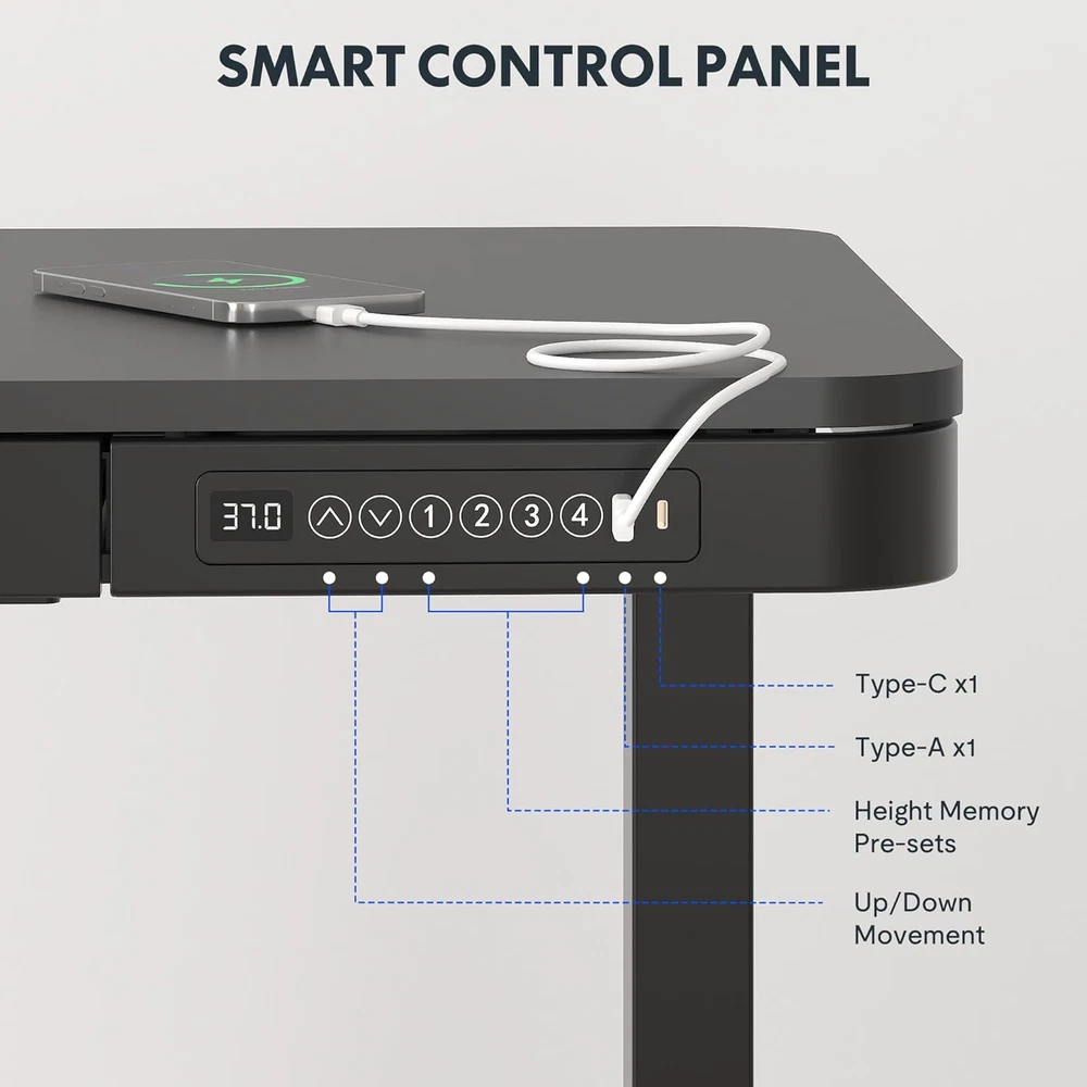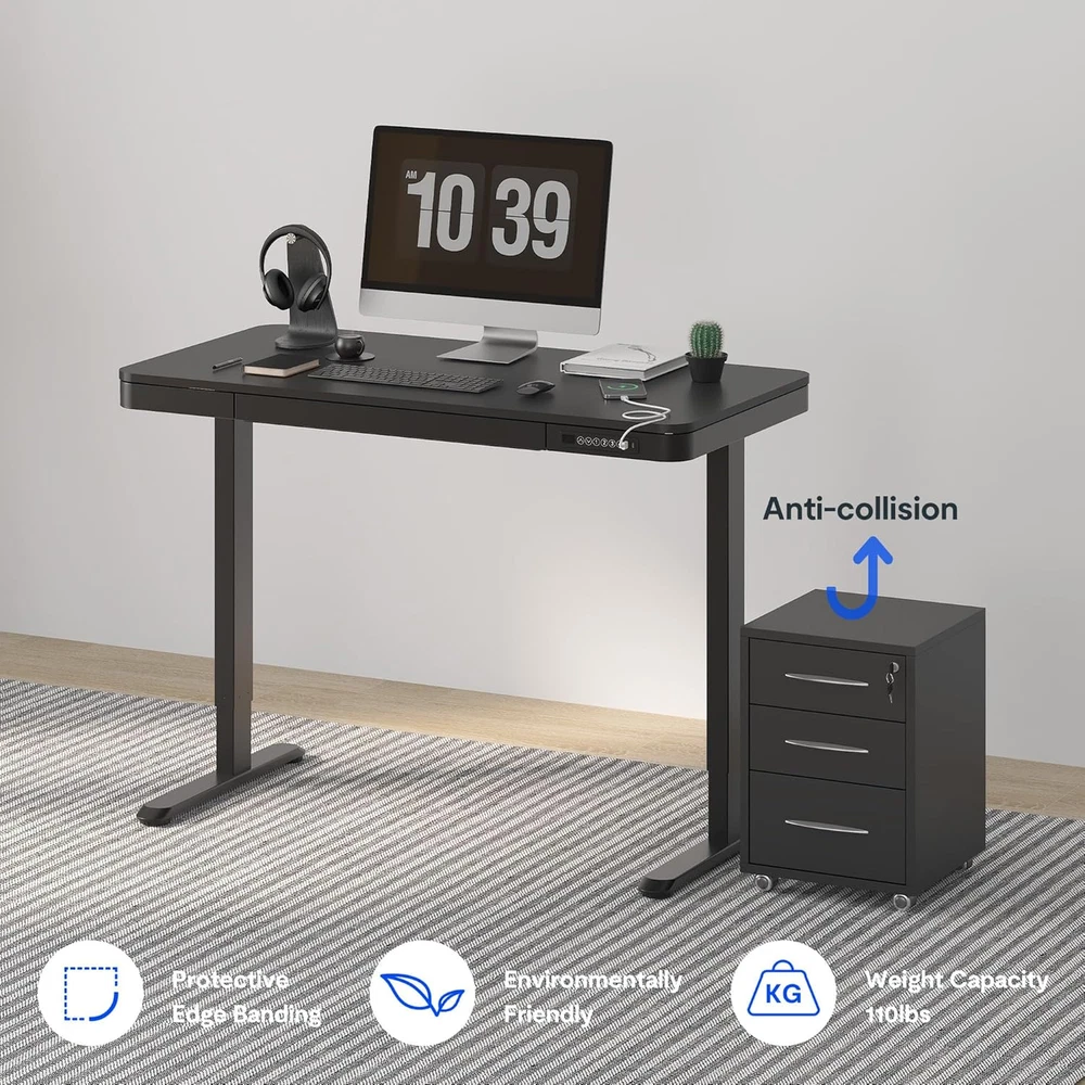 Furniture Leg Material:MetalDrawer Glide Mechanism:Ball-bearing or under-mount slideTabletop Thickness:2.6 InchesNumber of Shelves:1Type:Does not applyIncludes All Assembly Tools:YesStyle:ModernUL Listed:NoIs Customizable?:YesDesk Design:Standing DeskFinish Types:Powder CoatedStorage Volume:10 LitersDrawer Type:Single drawerRoom Type:OfficeCountry of Origin:ChinaMaximum Height:45.4 InchesItem Width:Does not applyFinish Type:Powder CoatedMaximum Weight Recommendation:1.1E+2 PoundsSpecial Feature:Electric, Adjustable Height, Built-In USB Outlet, StorageItem Height:Does not applyIs Electric:YesTop Color:BlackRecommended Number of People for Assembly:2Manufacturer:FLEXISPOTBrand:FLEXISPOTRecommended Uses For Product:WorkingAdditional Features:Electric, Adjustable Height, Built-In USB Outlet, StorageColor:Does not applyUPC:7445018286221Number of Height Positions:4Item Type Name:deskItem Length:Does not applyDrawer Glide Material:MetalItem Weight:41 KilogramsBrand Name:FLEXISPOTModel Name:Standing DeskModel Number:M-Flex-ElectStanDDWUSB-BLKMinimum Height:25.7 InchesBase:Metalgtin13:7445018286221Warranty Type:LimitedNumber of Drawers:1Base Color:BlackAge Range Description:AdultRequired Assembly:YesHas Finished Back:NoShape:Rectangular