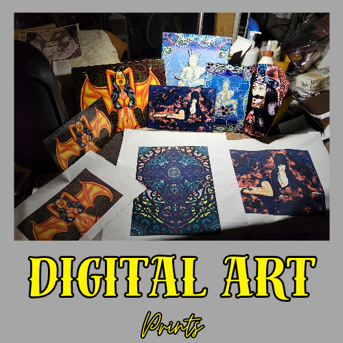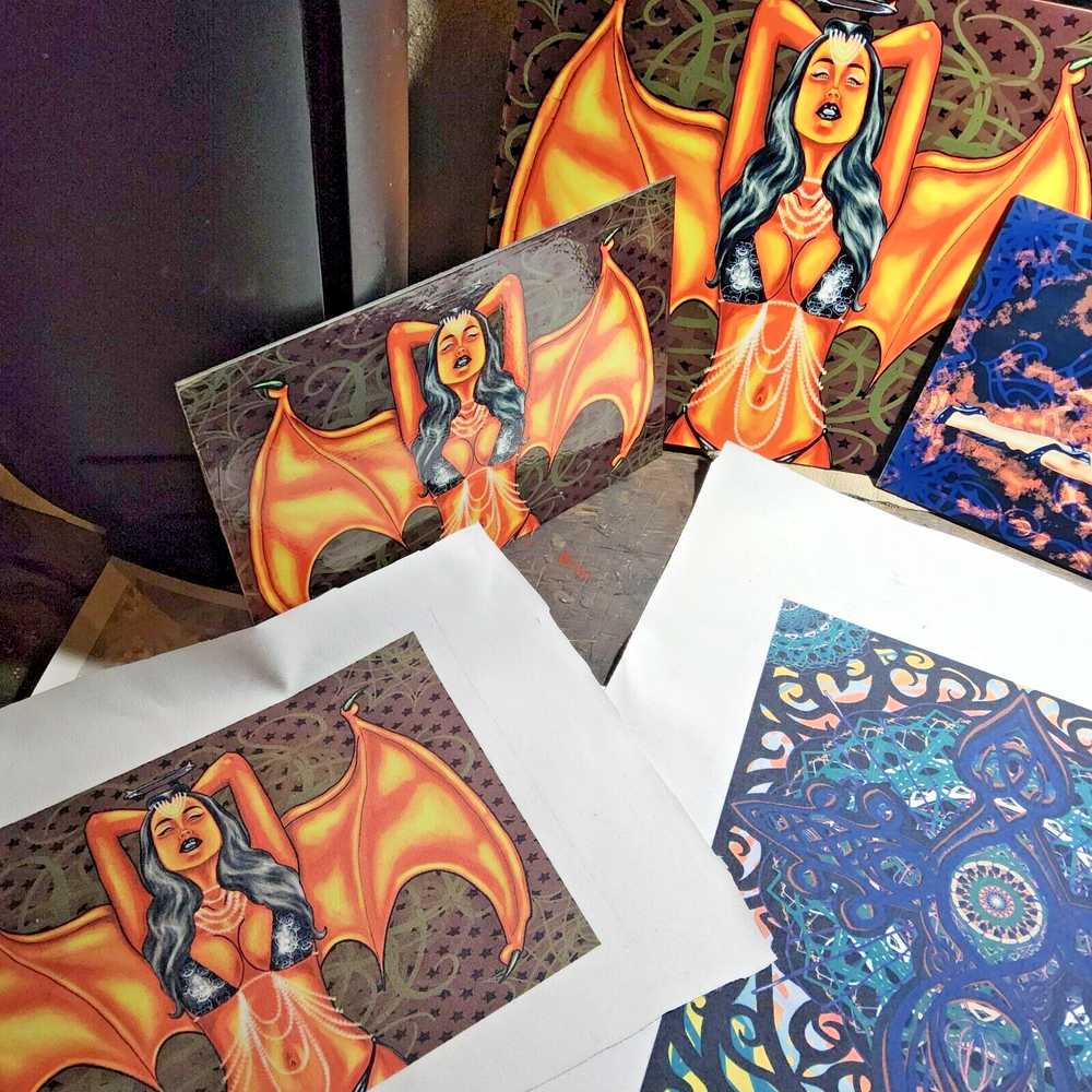 ***Treasure Suite offers you many pieces of my art prints now*** ###This section is for large sized sublimation prints of my digital art. measurements are 15"hx12"w. ### Sublimation print on polyester canvas of a red devil temptress beckoning you with her womanly wares. She's powerful i tell ya. Had to wear sunglasses while drawing her so she couldn't stare into my eyes. She a baddie. True story. *Welcome to my unique collection of digital art, where creativity meets craftsmanship! Each piece in this category features my original designs, heat pressed into vibrant sublimation prints on polyester canvas material. These art pieces are not just decorations, they are collectibles that bring a touch of gothic, rock and roll, horror, pin-up, and lowbrow art into your space. *I leave extra fabric border so you can gallery wrap on frame,cut to size, or sew onto clothes. Sublimation printing is what's done on clothing, like all over sweaters,tshirts,banners,etc. So that means it can be used on clothing and washed. If print gets wrinkled, you can steam it. *These pieces are perfect for adding a distinctive edge to your home or office, and they make fantastic gifts for art enthusiasts and collectors alike. Who doesn't enjoy vibrant digital art of out of this world space huntresses, demon witches, cyberpunk vixen cyborgs, spooky mistresses,and so on?