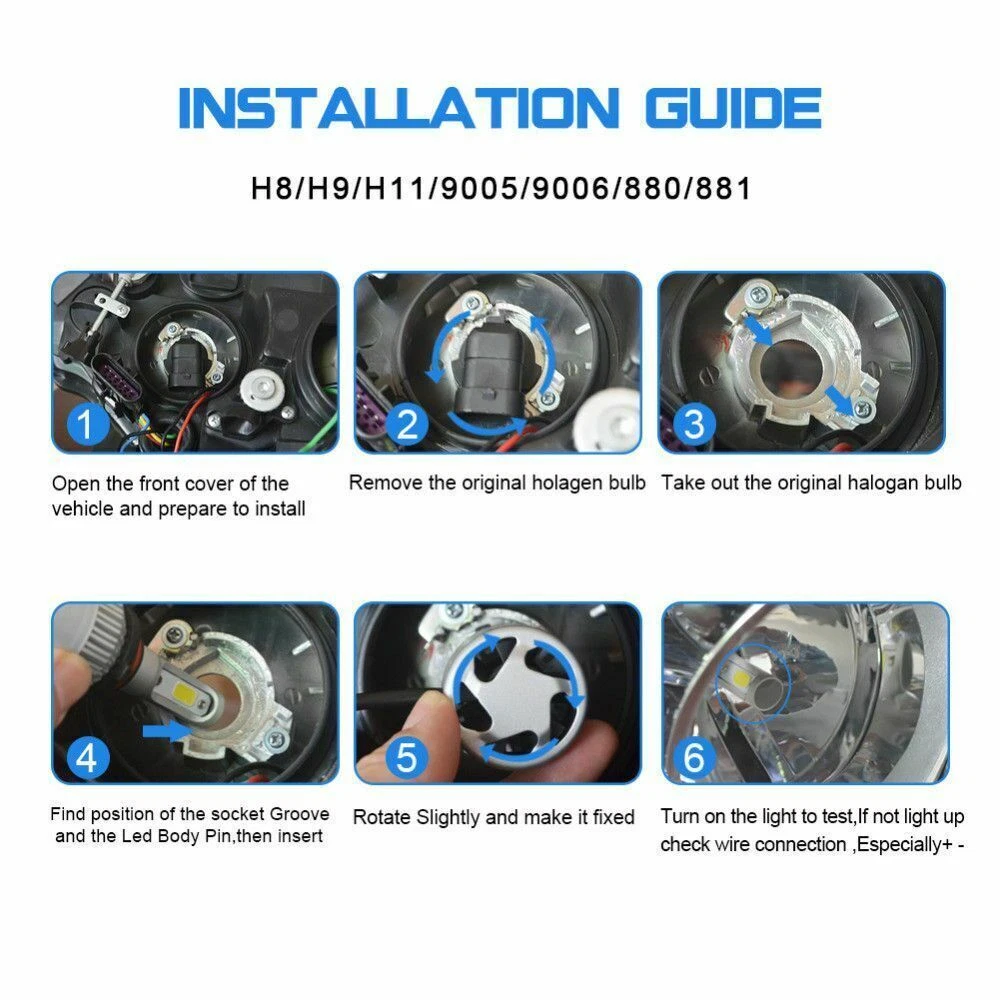 This listing includes 3 pairs of 6000K White LED Bulbs combo fit For Headlight + Fog Light This complete headlight package includes High Beam Headlight + Low Beam Headlight + Fog Light . Ultra Bright LED Bulbs, 2 - 3 times brighter than traditional bulbs Easy plug and play, safe connection Done long testing to make sure it fits your car!! When compared to OEM yellowish halogen lights, these LED bulbs are in a brightness HID matching xenon white color to give your car an awesome look! LED Headlight Bulb: Plug Type: High-Low Beam Voltage: DC 9V-36V(fit 12V,24V vehicles) Color Temperature: Pure White 6000K - 6500K IP67 rated water and dust seal,over 30000hrs lifetime Beam Angle: 270 degree@low beam,360 degree@high beam Material: Magnalium, Aluminum Operating Temperature: -40-80 degree Celsius Usage: Headlight (2pcs/set) High-Low Beam LED Headlight Conversion Kit Customized COB chip light source, 2 luminous faces(270/360 degree) no blind zone Engineering beam pattern design throw more light on road evenly at appropriate angle without foggy light Xenon white light reflect road paint/signs better to show clearer road situation during night driving 270 degree low beam angle with cut-off line,will not dazzle oncoming traffic All-in-one heat conduction+high speed mute fan system keep the light bulb in appropriate working temperature Built-in constant current CPU, instant full brightness without start-up relay Two-way heat dissipation channel All-in-one Magnalium Aluminum alloy profile as heat conduction system, 360 degree heat radiating Fog Light Bulb: Plug Type: Fog Light Voltage: DC 9V-36V(fit 12V,24V vehicles) Color Temperature: Pure White 6000K - 6500K Lifespan: >30, 000 hrs Light Color: White This new product has high luminous efficiency, low power consumption and long service life. 360 degrees illumination with magnified projector lens Heat resistant, prevent overheat problem Easy installation, Direct plug in and play. Best used for Fog/ Driving lights Faster on/ off response time Energy saving, environmental protection, Stable performance, through strict test, Use safer driving Package Included: 2 x 9005 HB3 LED high beam bulbs 2 x 9006 HB4 LED low beam bulbs 2 x 880 LED fog bulbs On Sep 25, 2024 at 23:45:23 PDT, seller added the following information: