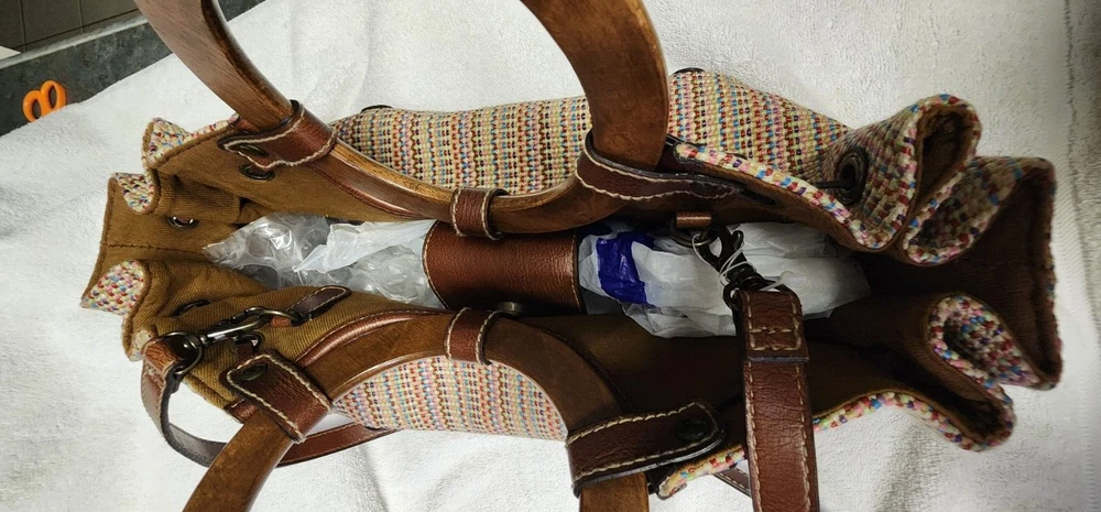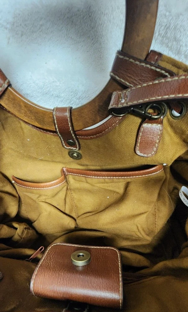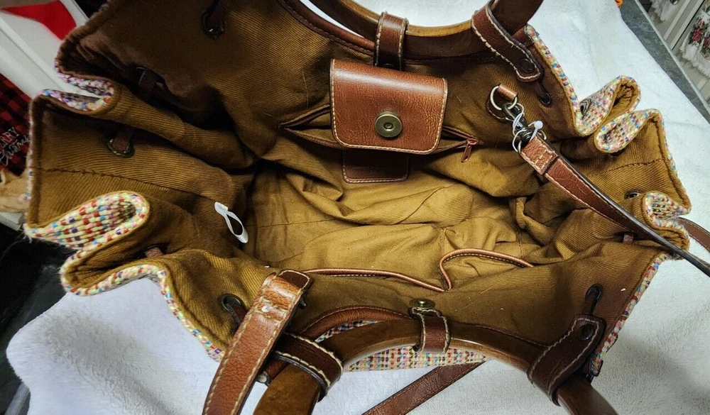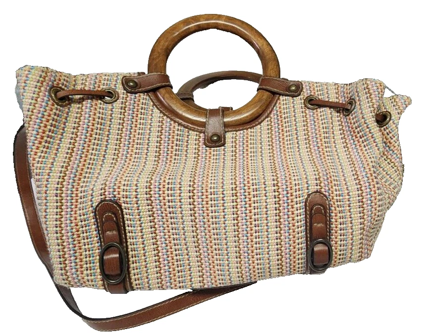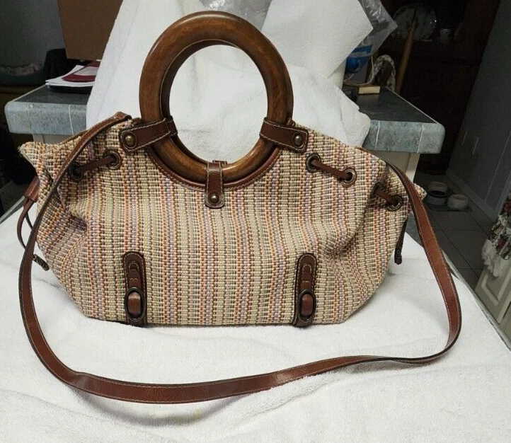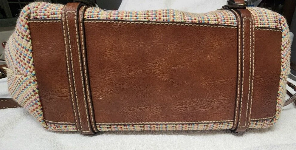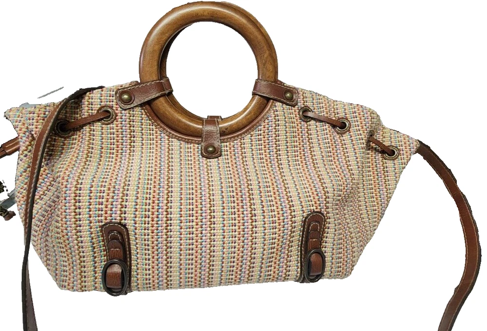 This Fossil satchel bag can be used as a purse tote or cross-body bag Retro sytle with plenty of room to carry your essential items Width 11 inches Height 9 inches Depth of 5 inches. The bag features double wood handles and a detachable leather strap with a 22-inch drop. Multicolor woven pattern The canvas fabric, leather lining, and metal clasp closure provide durability and security. The interior is lined with pockets and an audio pocket to keep you organized. Like New Personal Inventory Used it for a few months after purchasing as NWT. Prefer a full shoulder strap. Personal Inventory purchased NWT last year and used for about 6 months. Time for new home