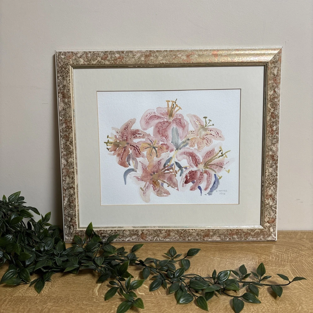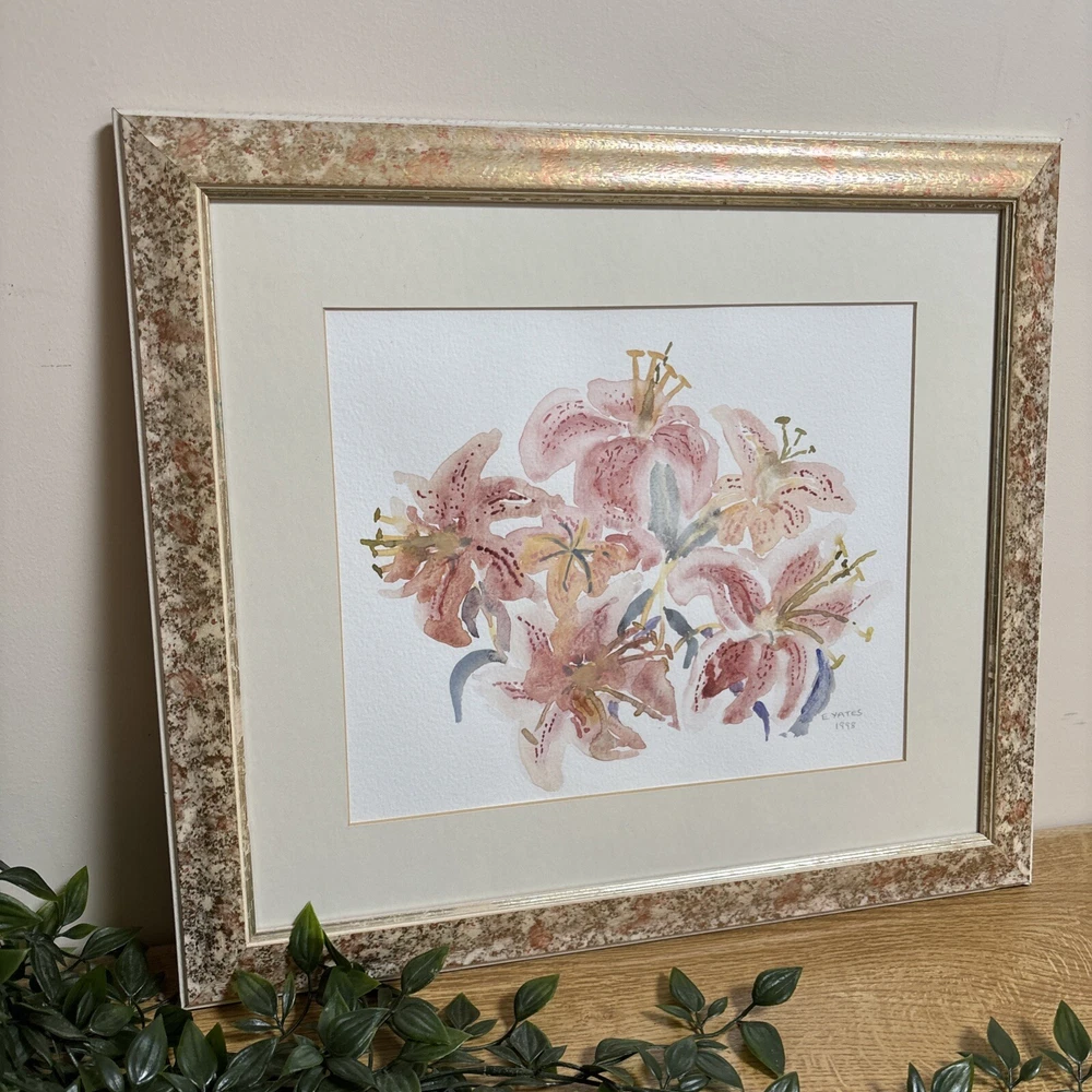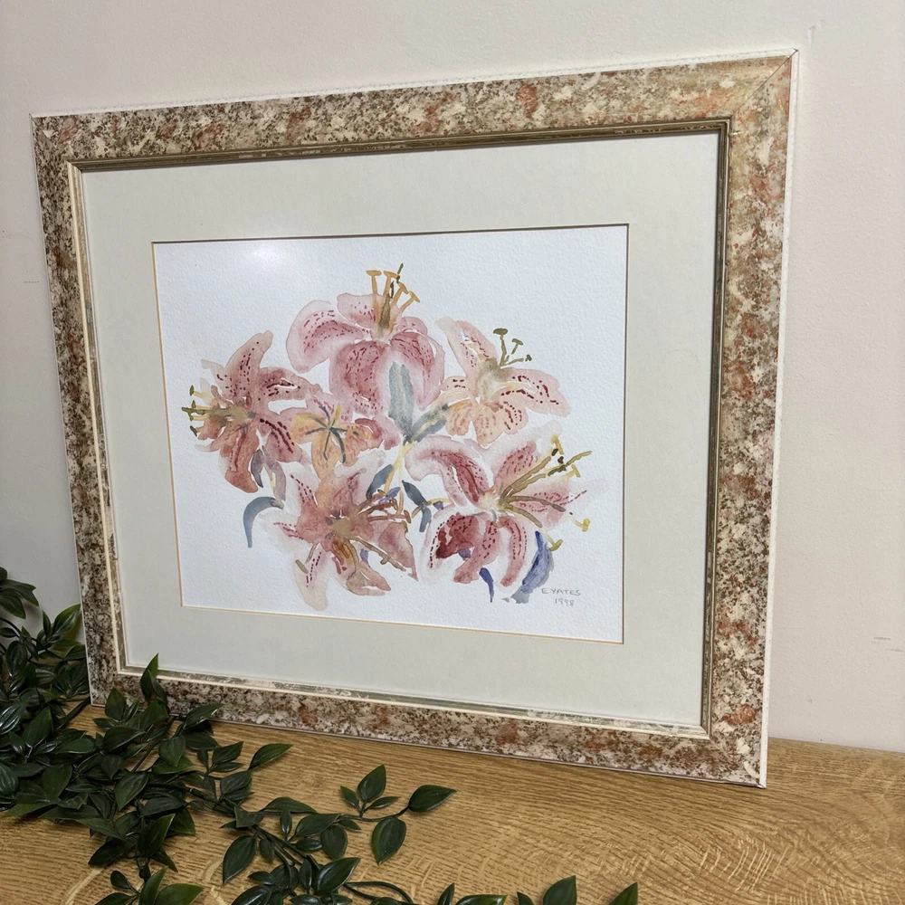 Framed Floral Watercolour by E. Yates – Pink Lilies Artwork 1998 – 44 cm x 39 cm