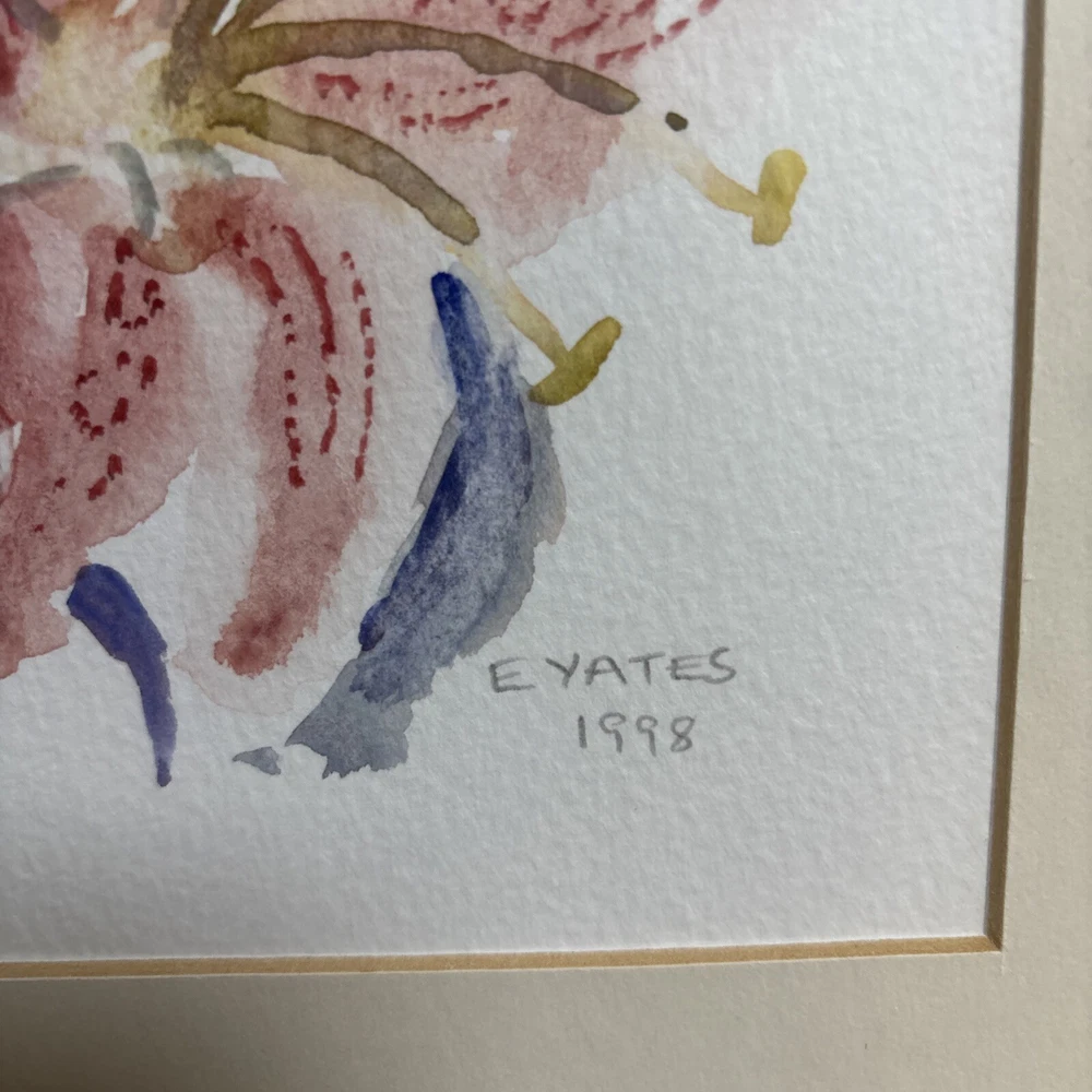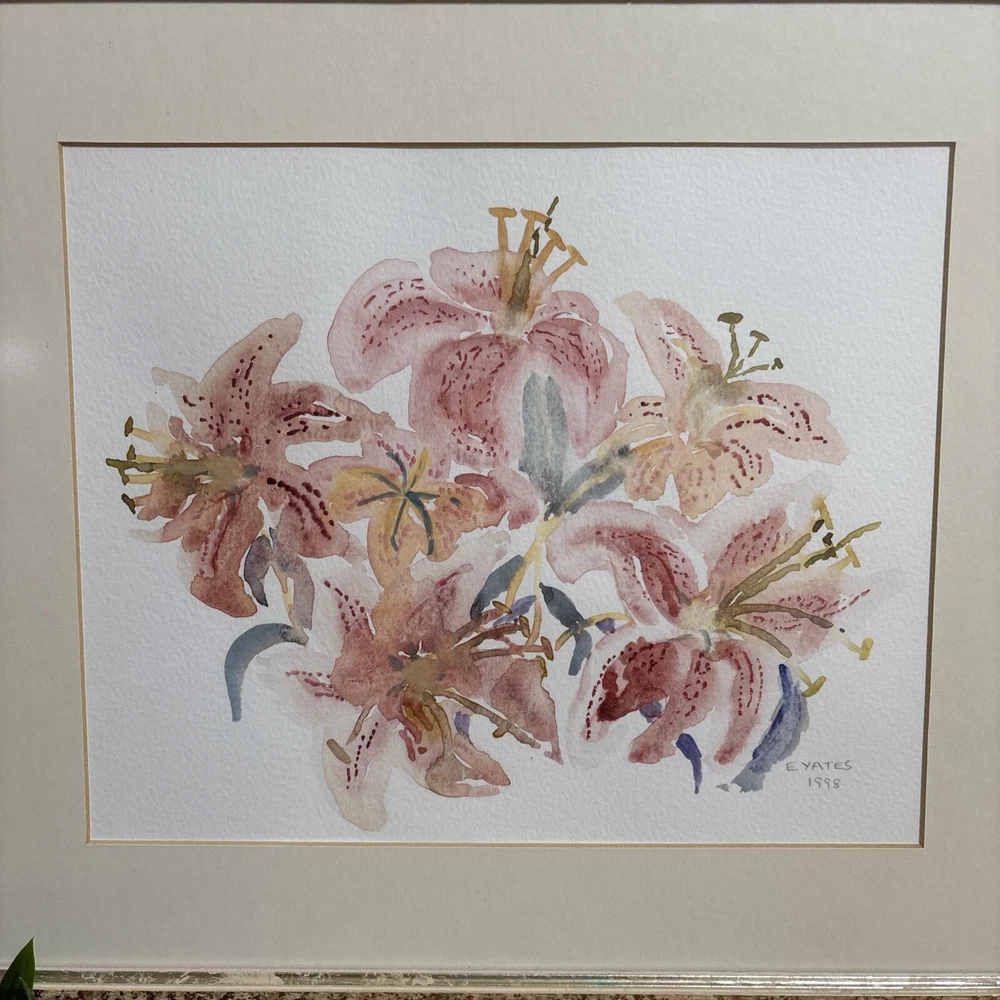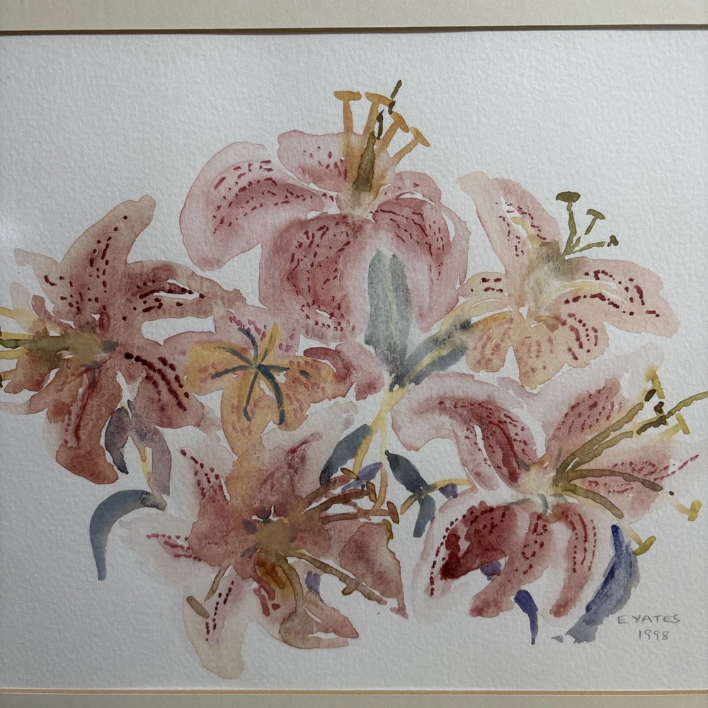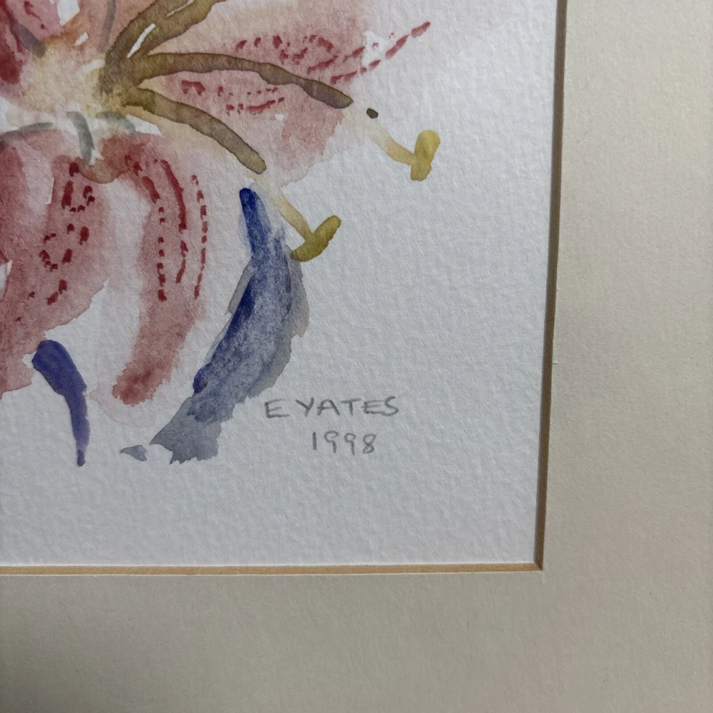 Framed Floral Watercolour by E. Yates – Pink Lilies Artwork 1998 – 44 cm x 39 cm