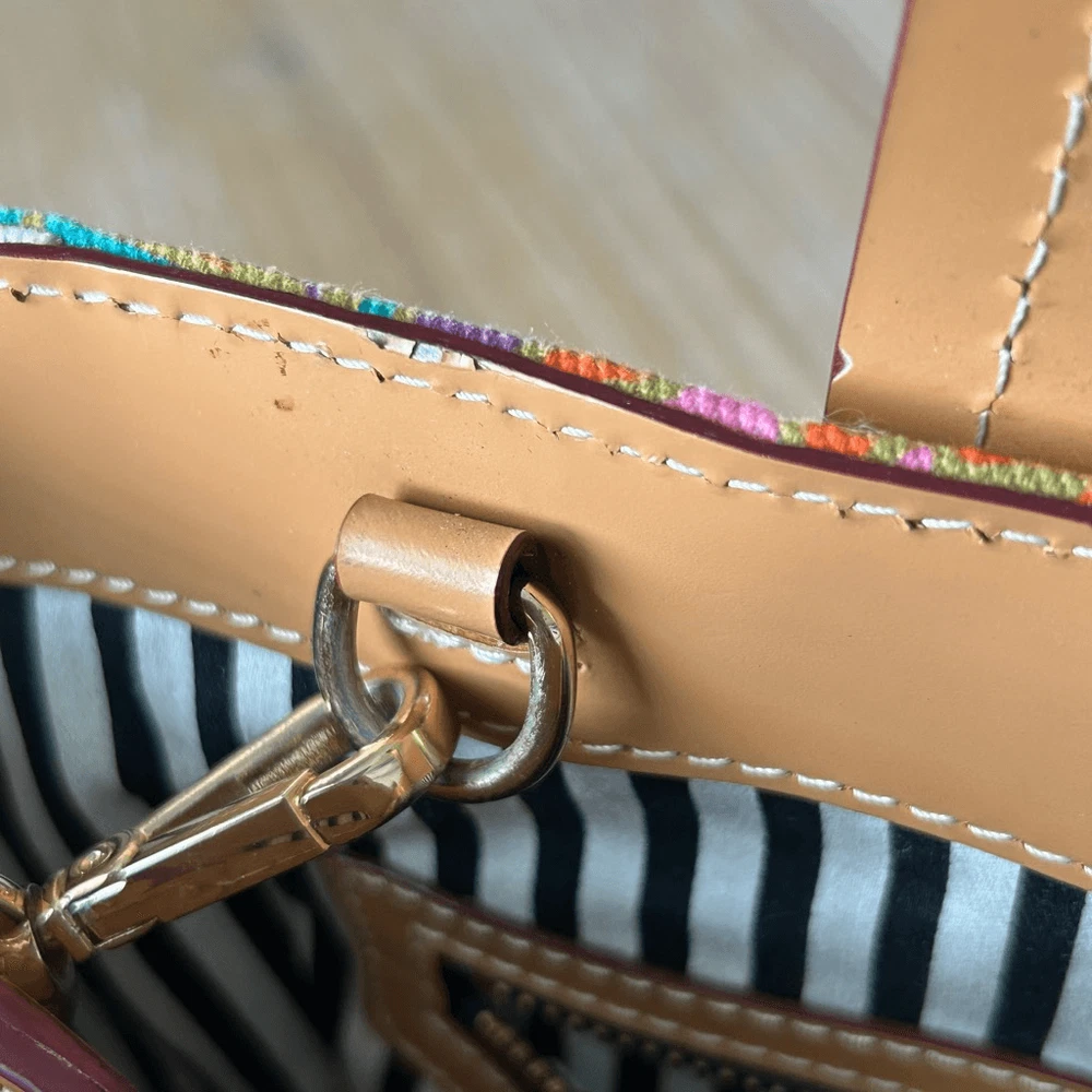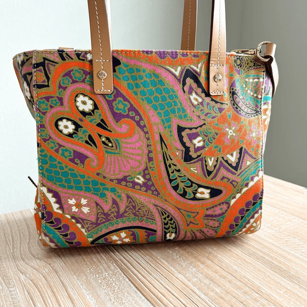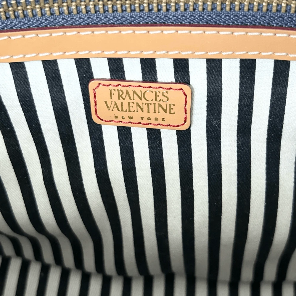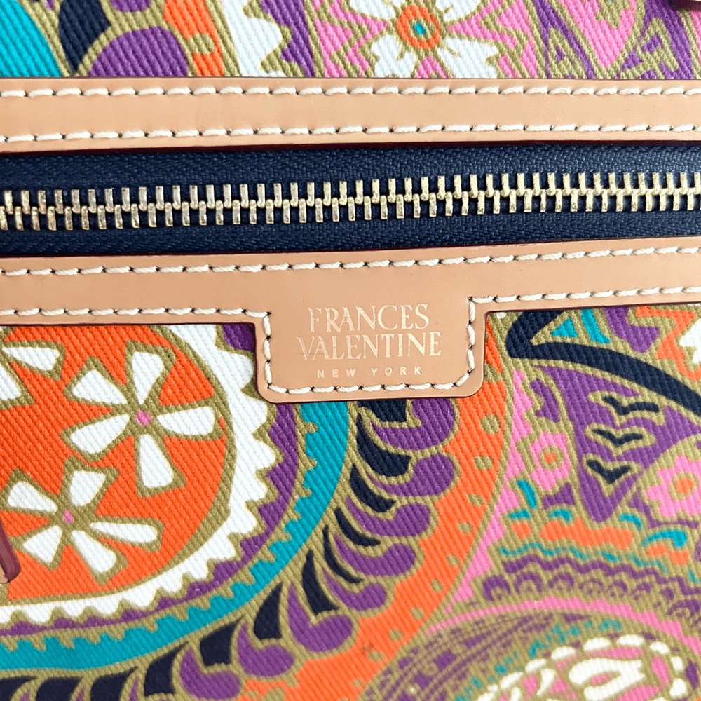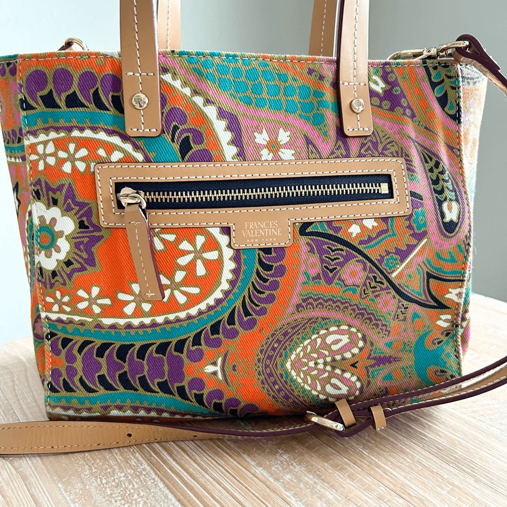 Frances Valentine Henry Canvas Tote Multi Color Print Leather Trim. Excellent used condition with no flaws. This structured bag design is complete with a colorful canvas frame, front zipper details, and interior compartments for organizing. Leather bottom with feet. Interior and exterior zippered pockets. Adjustable and detachable crossbody strap. Brushed cotton twill lining. Made in Italy. Dimensions approx: 10.5''W x 9”H x 5”D Handle Drop: 6''