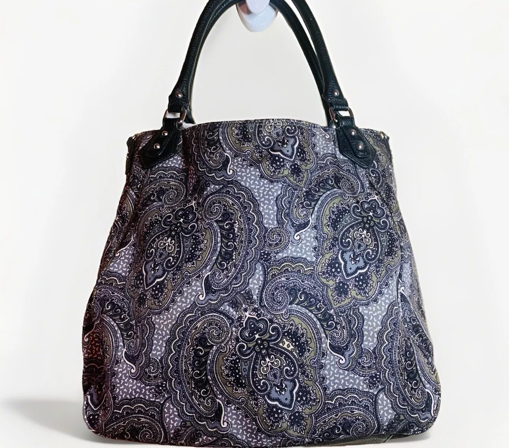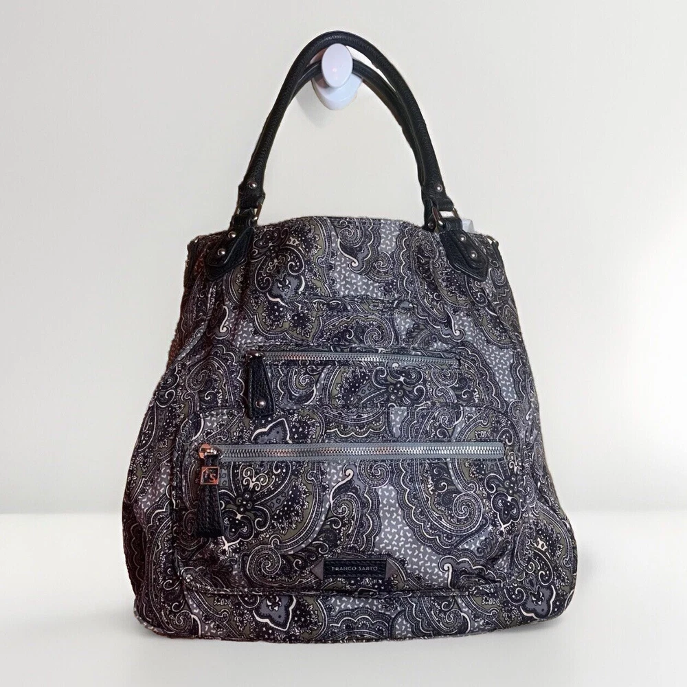 This is a beautiful warm colored shoulder bag, perfect for the cooler weather. There is a small wear spot(pictured) under one handle; not easily spotted. There is no long shoulder strap. It’s so clean and comes from a smoke free home. This stylish Franco Sarto shoulder bag is perfect for any occasion. The beautiful paisley pattern in a mix of black, warm green, grey, and white colors gives it a retro vibe that is sure to turn heads. The bag has a zip and snap closure and features both inner and outer pockets for ample storage space. Measuring 14 inches in width, 12 inches in height(not including handle height), and 5 1/2 This inches in depth, this medium-sized bag is made of durable polyester material and has a black handle/strap color. The hardware color is silver, and the bag's lining color is black With its spacious interior and multiple pockets, this bag is perfect for everyday use or as a purse for a night out. Thank you for visiting my eBay store. Please feel free to reach out if you require further information about this beautiful handbag.
