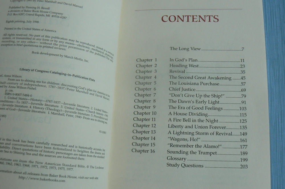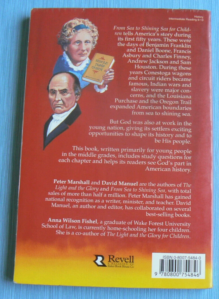 This listing is for a resource from Revell that is titled From Sea to Shining Sea - for Children Discovering God's Plan for America in Her First Half-Century of Independence, 1787-1837 by Peter Marshall & David Manuel with Anna Wison Fishel Synopsis from the back of the book: " ...tells America's story during its first fifty years. These were the days of Benjamin Franklin and Daniel Boone, Francis Asbury and Charles Finney, Andrew Jackson and Sam Houston. During these years Conestoga wagons and circuit riders became famous, Indian wars and slavery were major concerns, and theLouisiana Purchase and the Oregon Trail expanded American boundaries from sea to shining sea. But God was also at work in the young nation, giving its settlers exciting opportunities to shape its history and to be His people. "This book, written primarily for young people in the middle grades, includes study questions for each chapter and helps its readers see God's part in American history." This 208-page softcover is in very nice condition with all pages crisp, clean, and sturdily bound; the laminated cover has a few "wrinkles". I'm listing MANY more books (and other items) and I'm happy to combine shipping. I normally mail ON the day I receive payment if it's received before 1 p.m. central time, and the next day if it's later than 1. ~~~~~~~~~~~~~~~~~~~~~ Please take a look at my other offerings; I'm listing MANY school books (and others) and I'm happy to combine shipping. All items from a smoke-free, pet-free home. Thanks so much for your time!