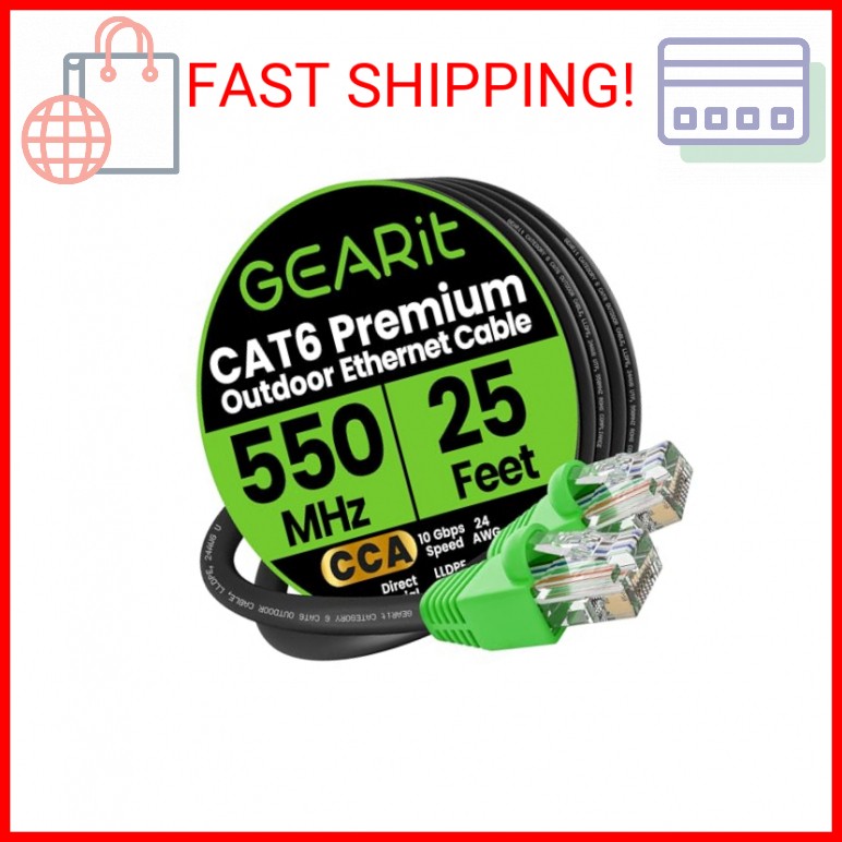 100% Genuine Free Shipping Gift Cards Welcome GEARit RJ45 Cat-6 Ethernet Patch Cable, 10Gpbs Transfer Speed, Gold-Plated Connectors, Copper Clad, Outdoor, UV Resistant, Direct Burial, Waterproof, Durable, 25 Foot (7.6 Meters), Black - GEARit Outdoor Ethernet Cable - This direct burial Cat6 cable combines ruggedness, blazing speed and impressive value to create the perfect Ethernet networking solution for your outdoor router, backyard office, permanent or temporary outdoor installation, or anywhere you need a reliable network connection that can stand up to weather and harsh conditions. - Direct Burial Cat6 Cable - This outdoor Ethernet cable features a durable jacket rated for direct burial. Avoid ugly cable runs and tripping hazards by keeping your connections underground. It's easy to install for homeowners, professional contractors and IT professionals alike, without need for conduits or extra gear. Just dig a trench, bury the cable and you're done. - Copper Clad Aluminum for Quality and Value - This outdoor Ethernet cable offers Cat6 speeds up to 10 Gbps and 550 MHz while remaining affordable, with four twisted pairs of high-quality copper clad aluminum (CCA) wire for a consistent, clean connection over any distance. That means reliable networking for your home or business, minus the unnecessary cost. - RJ45 Connectors With Bubble Boots - The gold-plated RJ45 connectors on this outdoor Ethernet cable are wrapped with flexible PVC "bubble boot" covers. Bubble boots protect the locking connector from wear and tear, prevent breakage and make it easier to detach the cable from the Ethernet jack with a simple press of the thumb, essential for temporary installations. - Choose Your Length for Any Application - Whether you're a contractor who needs to network a new build, homeowner wiring up your home office or an IT pro connecting to an outdoor router, this Cat6 cable lets you choose from multiple lengths without needing to cut your own wire. Get connected and trust GEARit's quality construction to stand up in the long term. Payments We accept the following payment methods PayPal Please pay as soon as possible after winning an auction, this will allow for quicker shipping times! Returns We do not accept returns. Shipping Shipment processing time All orders are processed within 3-5 business days. Orders are not shipped or delivered on weekends or holidays. If we are experiencing a high volume of orders, shipments may be delayed by a few days. Please allow additional days in transit for delivery. If there will be a significant delay in shipment of your order, we will contact you via email or telephone. Shipping rates & delivery estimates Shipping charges for your order will be calculated and displayed at checkout.