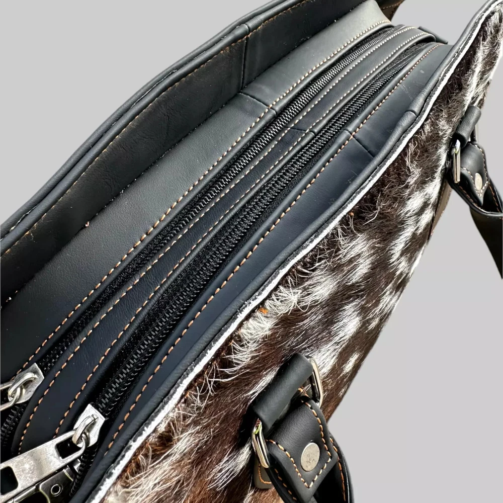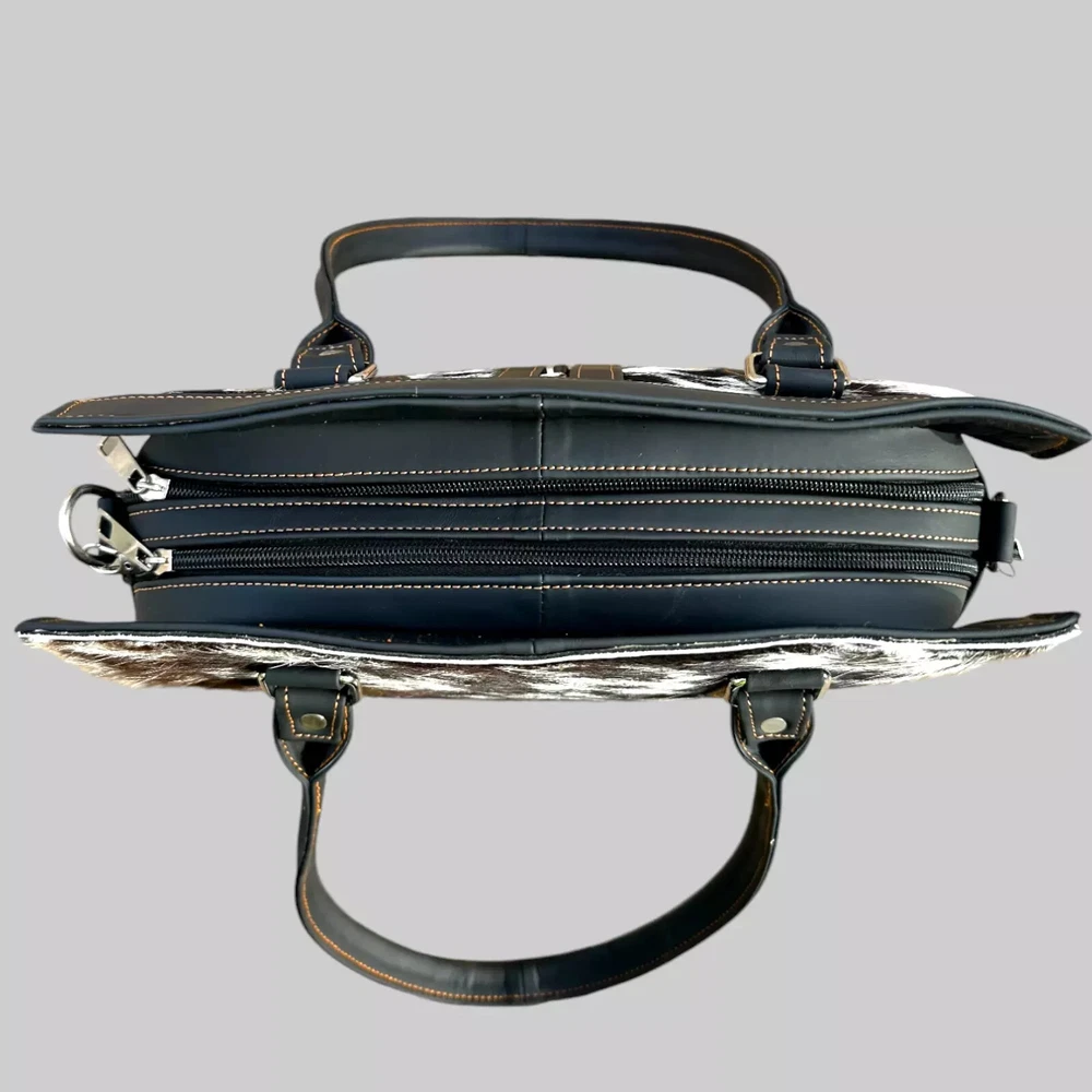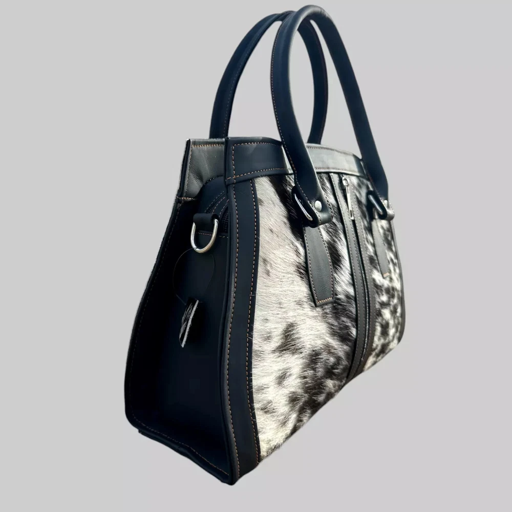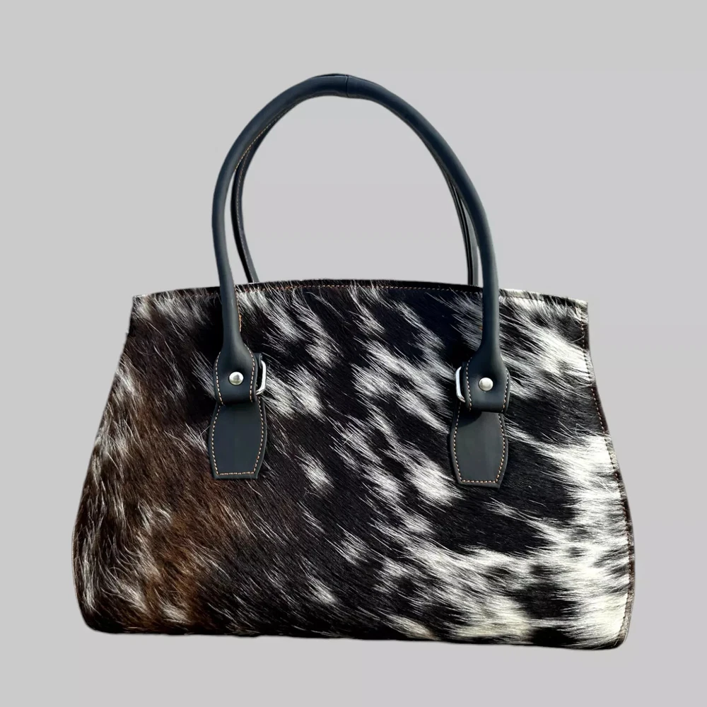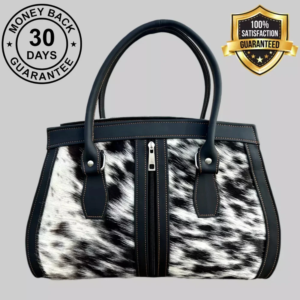Genuine Black Cowhide Leather Tote Bags Women Shoulder Purse Handbags Lady Bag Colors Pattern may vary slightly as it is 100% original Natural Cow Hide Skin. Description Bag size Width: 14 inches Height: 8 inches Depth: 4 inches Flexible Adjustable Strap Main Compartment 2 zipper Pockets 1st Main Compartment (inside 2 Pockets) 2nd Main Compartment (inside 1 zipper pocket) Colors Pattern may vary slightly as it is 100% original Natural Cow Hide Skin. Introducing our Natural Cow Hair on Leather Tote Bag – a stunning blend of style and substance that will elevate your everyday look. Crafted with genuine, high-quality natural leather, this women's handbag exudes timeless elegance while offering exceptional durability. The contrasting mix of cow hair panelling adds a touch of unique sophistication, making it a must-have accessory for fashion-forward individuals. Whether you need a chic shoulder bag or a spacious shopping companion, our lightweight design ensures comfort without compromising on style. Elevate your fashion game with this versatile and eco-friendly natural leather tote bag. Colors Pattern may vary slightly as it is 100% original Natural Cow Hide Skin. Experience the epitome of luxury with our handcrafted Natural Cow Hair on Leather Tote Bag. Created to charm and inspire, this women's handbag is meticulously crafted from premium natural leather, ensuring longevity and a touch of timeless beauty. The exquisite cow hair detailing further enhances its allure, making it an ideal choice for any occasion. The well-designed shoulder straps offer utmost comfort, allowing you to effortlessly carry your essentials in style. Whether you're heading to the office or embarking on a shopping spree, let this lightweight and versatile tote bag be your fashionable companion. NOTE: Colors may vary slightly from original due to individual monitor color settings and/or light conditions when photographed. Colors Pattern may vary slightly as it is 100% original Natural Cow Hide Skin. Delivery: We'll deliver your order via DHL / FEDEX / USPS at your door step. Returns & Exchanges: Hassle Free Returns and Exchanges. Colors Pattern may vary slightly as it is 100% original Natural Cow Hide Skin.