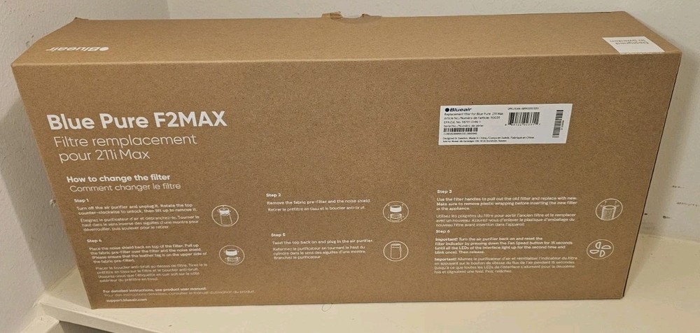 This is a Genuine Blueair Replacement Filter designed for the Blue Pure 211i Max Air Purifier. The filter has a pleated design and is white in color. It has a filter life of approximately 6 months and is sold as a single pack. Made in China, this filter is specifically designed for use in air purifiers and ensures optimal indoor air quality. The product is identified by the model number F2MAX.