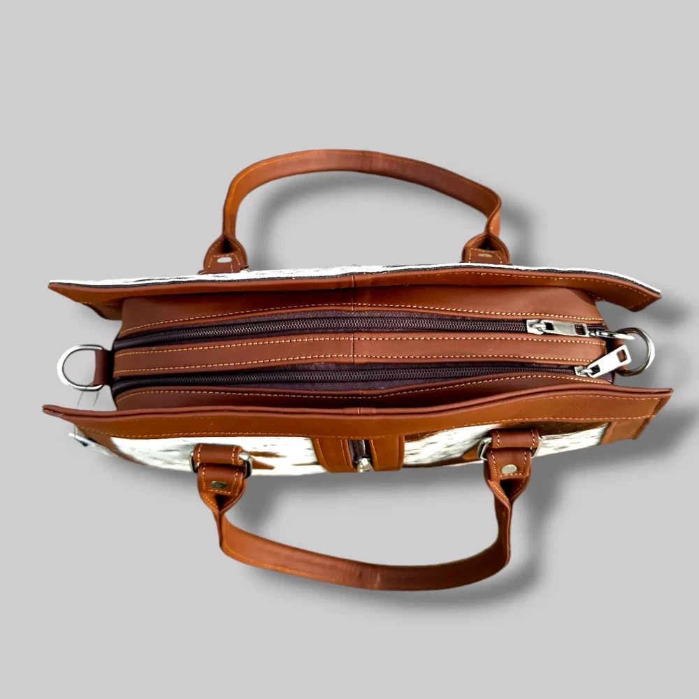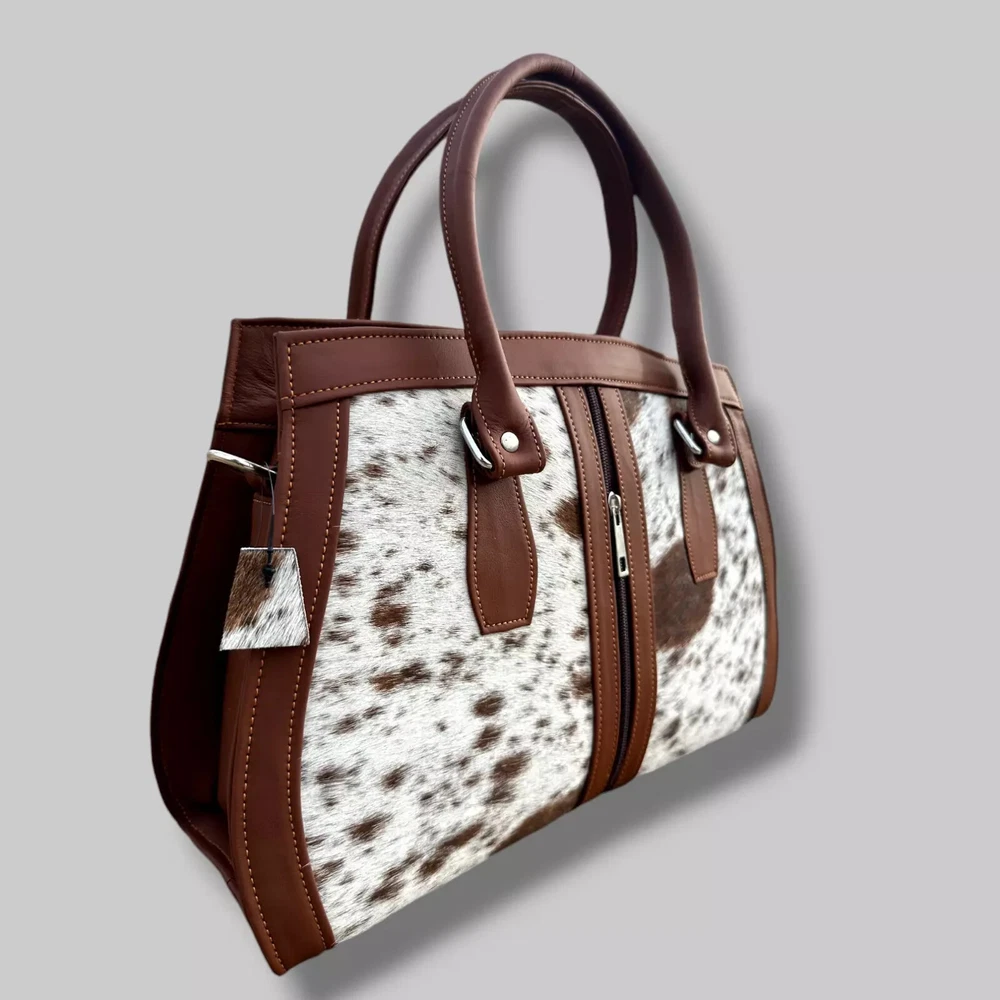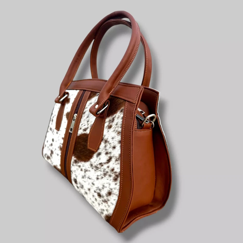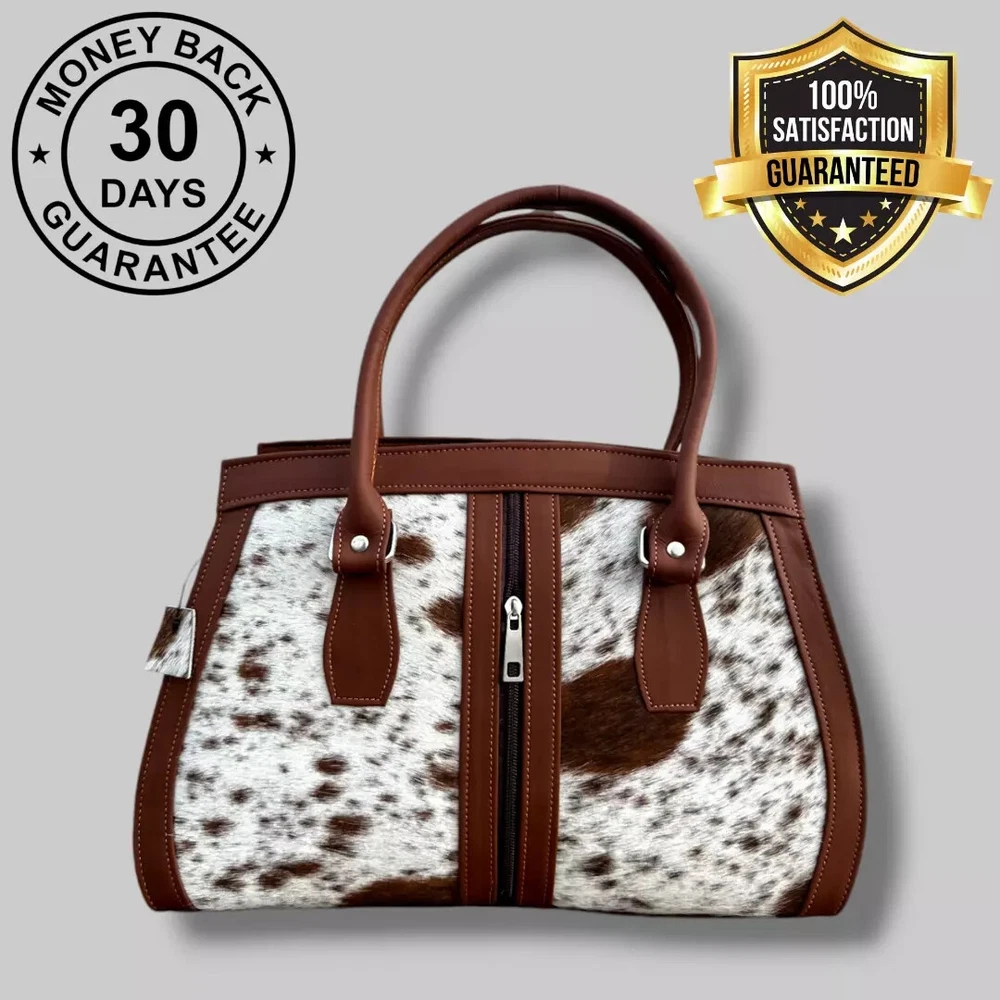 Genuine Black Cowhide Leather Tote Bags Women Shoulder Purse Handbags Lady Bag Colors Pattern may vary slightly as it is 100% original Natural Cow Hide Skin. Description Bag size Width: 14 inches Height: 8 inches Depth: 4 inches Flexible Adjustable Strap Main Compartment 2 zipper Pockets 1st Main Compartment (inside 2 Pockets) 2nd Main Compartment (inside 1 zipper pocket) Colors Pattern may vary slightly as it is 100% original Natural Cow Hide Skin. Introducing our Natural Cow Hair on Leather Tote Bag – a stunning blend of style and substance that will elevate your everyday look. Crafted with genuine, high-quality natural leather, this women's handbag exudes timeless elegance while offering exceptional durability. The contrasting mix of cow hair panelling adds a touch of unique sophistication, making it a must-have accessory for fashion-forward individuals. Whether you need a chic shoulder bag or a spacious shopping companion, our lightweight design ensures comfort without compromising on style. Elevate your fashion game with this versatile and eco-friendly natural leather tote bag. Colors Pattern may vary slightly as it is 100% original Natural Cow Hide Skin. Experience the epitome of luxury with our handcrafted Natural Cow Hair on Leather Tote Bag. Created to charm and inspire, this women's handbag is meticulously crafted from premium natural leather, ensuring longevity and a touch of timeless beauty. The exquisite cow hair detailing further enhances its allure, making it an ideal choice for any occasion. The well-designed shoulder straps offer utmost comfort, allowing you to effortlessly carry your essentials in style. Whether you're heading to the office or embarking on a shopping spree, let this lightweight and versatile tote bag be your fashionable companion. NOTE: Colors may vary slightly from original due to individual monitor color settings and/or light conditions when photographed. Colors Pattern may vary slightly as it is 100% original Natural Cow Hide Skin. Delivery: We'll deliver your order via DHL / FEDEX / USPS at your door step. Returns & Exchanges: Hassle Free Returns and Exchanges. Colors Pattern may vary slightly as it is 100% original Natural Cow Hide Skin.