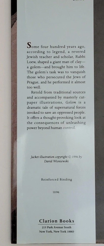 ISBN: 0395726182 Language: English Number of Pages: 32 Pages Item Weight: 15.5 Oz Publisher: Houghton Mifflin Harcourt Publishing Company Topic: Legends, Myths, Fables / General, Fairy Tales & Folklore / Country & Ethnic, Folklore & Mythology Format: Hardcover Color: Brown Author: David Wisniewski Item Width: 9.2 in Publication Year: 1996 Type: Textbook Genre: Juvenile Fiction, Social Science gtin13: 0395726182 Book Title: Golem Item Height: 0.4 in Illustrator: Yes, Wisniewski, David Item Length: 11 in