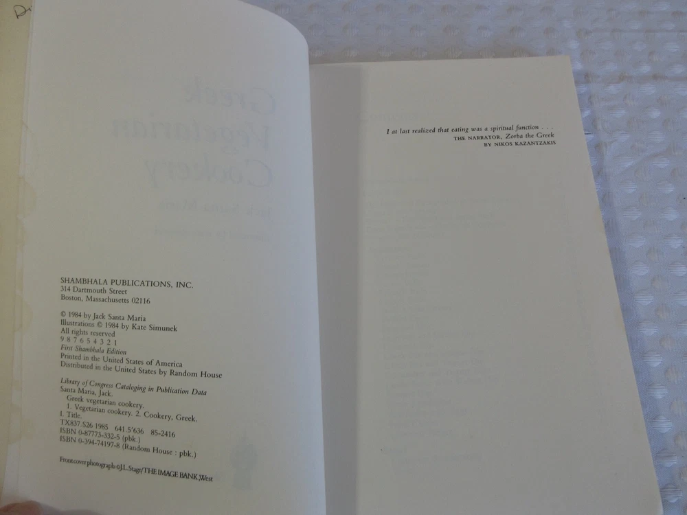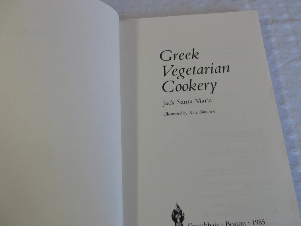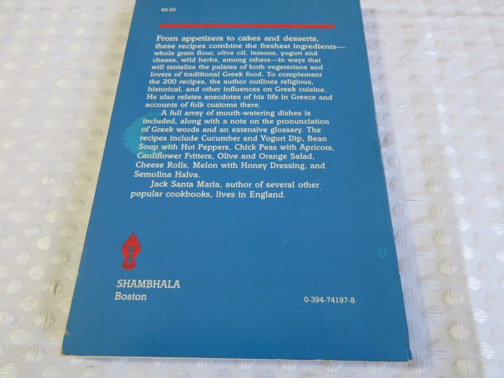 Vintage: Yes Author: Jack Santa Maria Genre: Cookbooks Original Language: English Number of Pages: 160 Pages Format: Trade Paperback Language: English Edition: First Edition Publication Year: 1985 Topic: Greek Cooking gtin13: 0394741978 Publisher: Shambhala Publications, Incorporated Book Title: Greek Vegetarian Cookery ISBN: 0394741978
