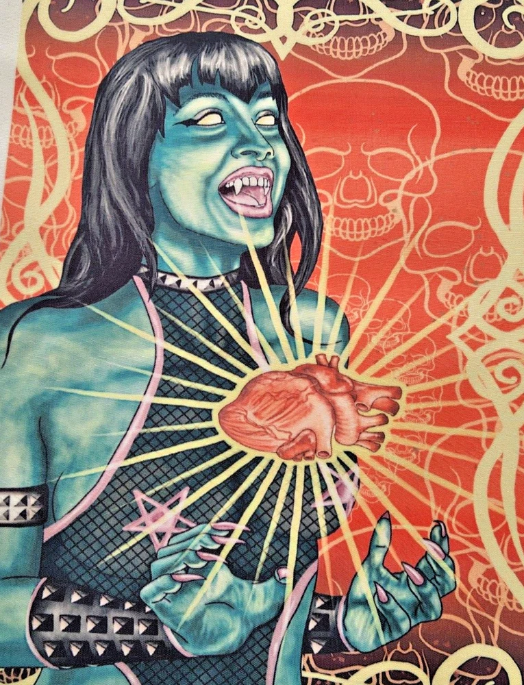 ***Treasure Suite offers you many pieces of my art prints now*** ###This section is for large sized sublimation prints of my digital art. measurements are 15"hx12"w. ### Green sci-fi fantasy vampire type pinup girl manipulating a levitating beating heart. I know some of you would risk it all for a shot with her. You don't have to, just own the print. *Welcome to my unique collection of digital art, where creativity meets craftsmanship! Each piece in this category features my original designs, heat pressed into vibrant sublimation prints on polyester canvas material. These art pieces are not just decorations, they are collectibles that bring a touch of gothic, rock and roll, horror, pin-up, and lowbrow art into your space. *I leave extra fabric border so you can gallery wrap on frame,cut to size, or sew onto clothes. Sublimation printing is what's done on clothing, like all over sweaters,tshirts,banners,etc. So that means it can be used on clothing and washed. If print gets wrinkled, you can steam it. *These pieces are perfect for adding a distinctive edge to your home or office, and they make fantastic gifts for art enthusiasts and collectors alike. Who doesn't enjoy vibrant digital art of out of this world space huntresses, demon witches, cyberpunk vixen cyborgs, spooky mistresses,and so on?