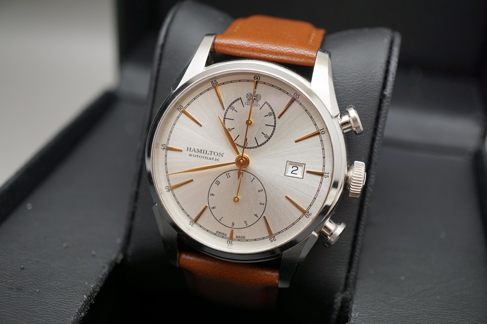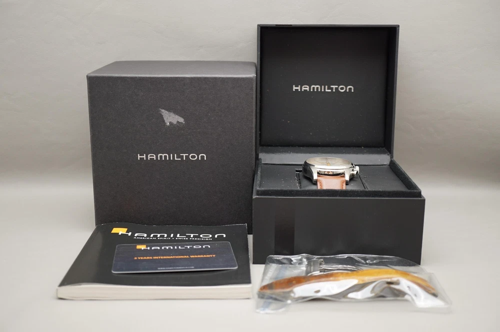For sale is a Hamilton American Classic H32416581 Spirit Of Liberty Automatic Chronograph Watch Movement: Mechanical (Automatic) Condition: Used Strap: Aftermarket leather. Original leather/deployant clasp are included but is deteriorating from age/wear. Box: Original, some deterioration inside from age. Warranty card: Stamped 2014.7.5 Manual: Yes Approximate measurements: Case diameter: 42mm (excluding crown) Lug width: 22mm Lug to lug: 52mm Thickness: 14.75mm Please inspect all product photos in detail prior to purchase. Item does not include accessories beyond what is described and photographed.