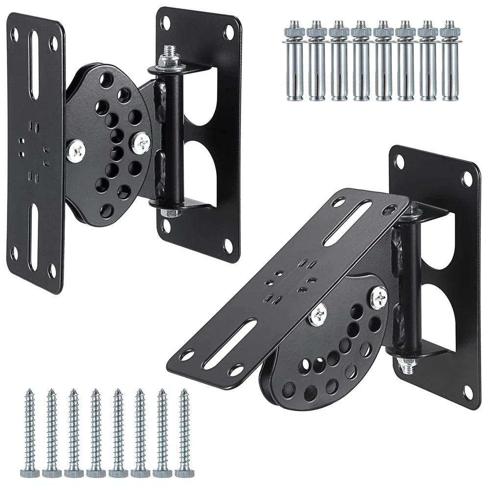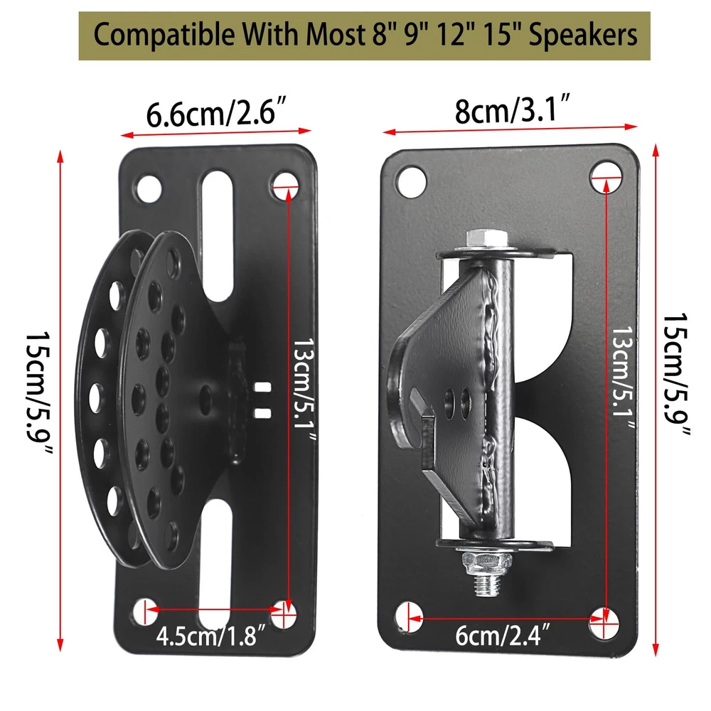 The swivel mounting brackets for speaker can be tilted up and down by 90°, and the swivel angle can be adjusted 180°. The speaker bracket's tilt angle can be quickly and easily adjusted for surround sound replication and ensure safety and optimal performance. Please tighten the screws after adjustment. This wall mount speaker stand bracket is made of solid steel, securely attach any HiFi or home cinema speaker up to 90 pounds in weight to a wall or ceiling. The mounting holes of this loudspeaker bracket compatibility with almost any 8", 10", 12", 15" make of speaker, ideal for home theater, stage, recording studio. Package come with a pair of wall sound box brackets and 2 different type screws for Concrete & Wooden Wall. Please be advised our screws are not suitable for all walls, ff necessary, please purchase screws that are suitable for your wall or ceilling. Please double check that the size and appearance match your speaker before purchasing. Any question please feel free to us.