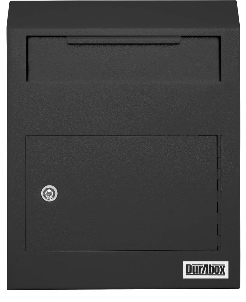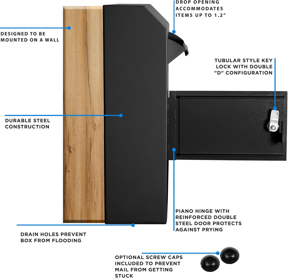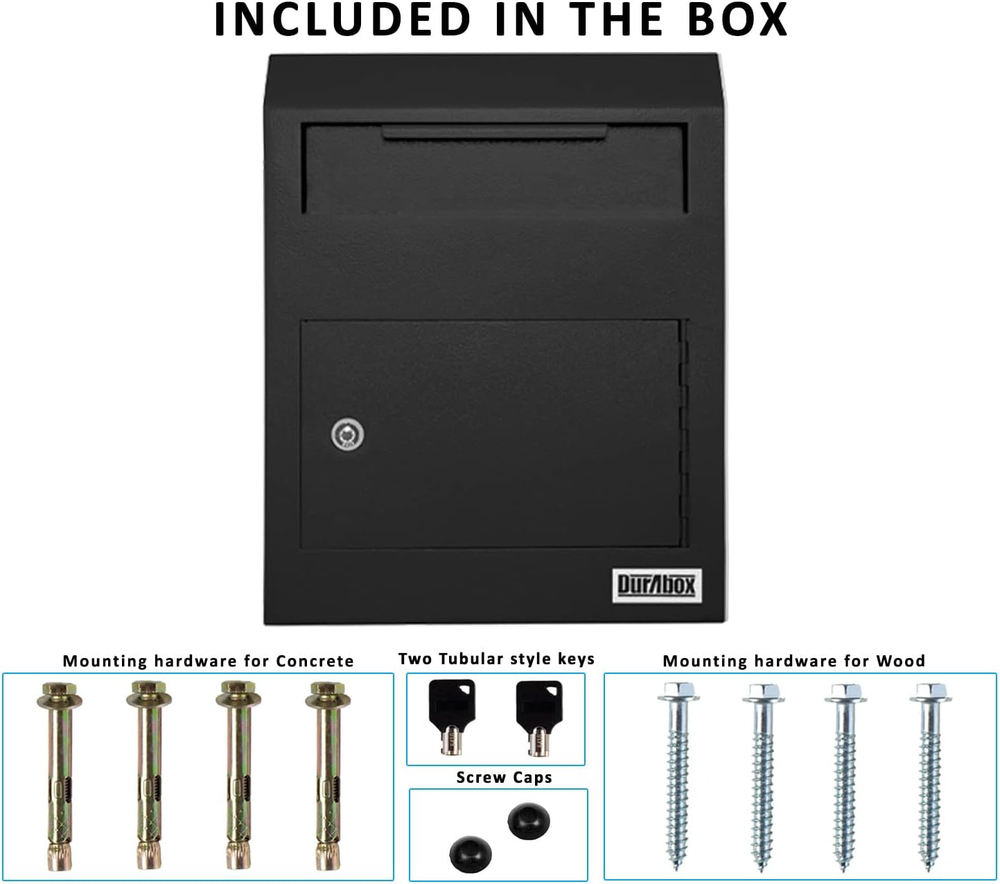 Store New Arrivals Add to Favorite View Feedback Contact Wall Mount Locking Drop Box, Heavy Duty Steel Mailbox for Rent Payments, Mail, Keys, Cash, Checks - Safe Storage Dropbox for after Hours Deposits W500 (Black) Description Control Type Key Control Capacity 496 Cubic Inches Mounting Type Wall Mount; Floor Mount Color Black Product Dimensions 4.25"D x 12"W x 15"H Material Alloy Steel, Metal Water Resistance Level Not Water Resistant Global Trade Identification Number 00860008658005 Item Weight 12 Pounds Item Dimensions D x W x H 4.25"D x 12"W x 15"H Style Number W500 Lock Type Key Special Features Lockable Chamber Width 12 inches Special Feature Lockable Alarm Audible Included Components Keys QUALITY DESIGN – Durable steel construction provides secure all-day depositing of valuables or private items such as cash, checks, car keys, remotes, small envelopes, and more. Made from rust resistant powder-coated steel. Perfect for daily residential and commercial use SECURE – Comes with a tubular style key lock and 2 keys that are difficult to copy. The security baffle prevents fishing from the drop-slot, and a continuous piano hinge on the retrieval door prevents prying. Keep your packages and mail organized and secure MOUNTING HARDWARE INCLUDED - Designed to be mounted on a wall. Includes mounting hardware for wood and concrete. Also comes with 2 screw caps to place on the lower screws to prevent mail from getting stuck as it is deposited. EFFICIENT DESIGN - The deposit slot opening is 9-3/8" wide and accommodates items up to 1.2" thick. This unit is not ideal for receiving large mail items such as books, magazines, catalogs, manila envelopes, and other larger mail because of the anti-phishing baffle DIMENSIONS - Exterior dimensions: 15" H x 12" W x 4-1/4" D. Retrieval door clearance of 5-1/4" H x 9-1/2" W. Product weight 12 lbs Product Description Secure The locking mail drop box features a continuous piano hinge which makes it difficult to pry the retrieval door open, and a metal baffle inside the mail box to protect against fishing. The tubular style key (2 included) and lock are difficult to replicate. Quality, Durable Design Constructed using heavy duty powder coated steel the drop box is built to last! Powder-coated finish protects the drop box from rusting and scratching. Easy Installation with Hardware Included Includes mounting hardware: 4 hex sleeve anchors for concrete and 4 Philips head wood screws. Comes with two screw caps to stop mail from getting stuck. Two pre-drilled mounting holes on the drop box align with the door making it easier to install. ABOUT US We offer the best prices around on high quality products. Our E-store includes media such as books, movies, music and games while offering electronics, toys, sporting apparel, clothing, tools, general home, garden items and more. SHIPPING We are always working hard to ensure your package arrives as soon as possible. Please understand that some factors like weather, high postal traffic, and the performance of shipping companies are outside of our control. We offer free shipping to the lower 48 states and ship within 2 business days of payment, usually sooner. We do not accept P.O. Boxes. Please provide a physical address. For shipping outside of the continental USA, we only use eBay's Global Shipping Program.The item is shipped to KY and then sent to the rest of the world. International customers are responsible for all duties and taxes. Continue to check out in order to calculate costs for shipping the item to your country. Messages regarding eBay's Global Shipping Program MUST be directed at eBay EXCLUSIVELY. RETURNS We offer a 30-Day Return Policy on items which you are not completely satisfied with. You have the option for a full-refund or an exchange of the item. No returns are available on items shipped outside of the USA. PAYMENT We accept PayPal. CONTACT US This page content is yet to come Please ad us to your favorite seller and visit again later Thank You CUSTOMER SATISFACTION We try our very best to make sure every customer is completely satisfied. If there's a problem, message us! We're happy to help.