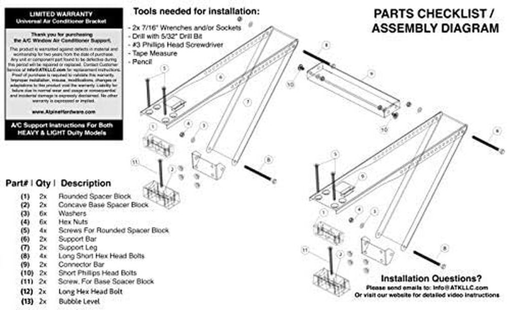 The window AC bracket adapts to any window style, with a wall thickness from 3" to 12" and fits window openings 16" or larger. Drilling Is required. All Weather Steel Construction & Easy Indoor Installation - Our bracket support eliminates exterior work with no drilling of outside wall or siding, but DRILLING into the window sill is still required. Safe, Durable & Convenient - Dual AC brackets relieves stress on the window and allows for maximum sturdiness and weight allowance (200lbs) All necessary Air Conditioner mounting bracket hardware included & Works With All Brand Name Air Conditioners Including: Aros, Casement, Fridgidare, Frost King, SPT, Koldfront, Arctic King, GE, Kenmore, LG and many more. Indoor Installation - Install easily from indoors without having any exterior work, just drilling into window sill. Product Description Alpine Hardware offers 3 types of Window AC Brackets. There are 2 Different Models of Window AC Brackets that require drilling where the difference is 1 arm of support or 2 arms of support. Both the one arm and two arm models have a light/medium duty and heavy duty size. For a further look at the sizes, look down below. We offer 1 type of Window AC Bracket that is Drill-Less and does not need to be drilled into the window sill. What's needed for this to work? The window AC bracket adapts to most window styles, and will work with a wall thickness from 3" to 12". Do I need to drill for this model? Alpine Hardware's ac brackets are all weather steel construction with an easy indoor installation. Our window support brackets eliminates exterior work with no drilling of outside wall or siding. Our one arm and two arm models require DRILLING into the WINDOW SILL . The Drill-Less Model does not require drilling into the Window Sill. See below for further specs. These 4 Options Need Drilled into the Window Sill Light/Med Duty 1 Arm This supports up to 85lbs and is a light/medium duty 1 arm bracket. Heavy Duty 1 Arm This supports up to 160lbs and is a heavy duty 1 arm bracket. Light/Med Duty 2 Arm This supports up to 105 lbs and is a light duty 2 arm bracket. Heavy Duty 2 Arm This supports up to 180lbs and is a heavy duty 2 arm bracket. Drill-Less Support Option This supports well over 200lbs and is a heavy duty bracket that is Drill-Less. This means it does not need drilled into the window sill.