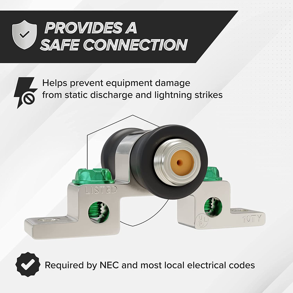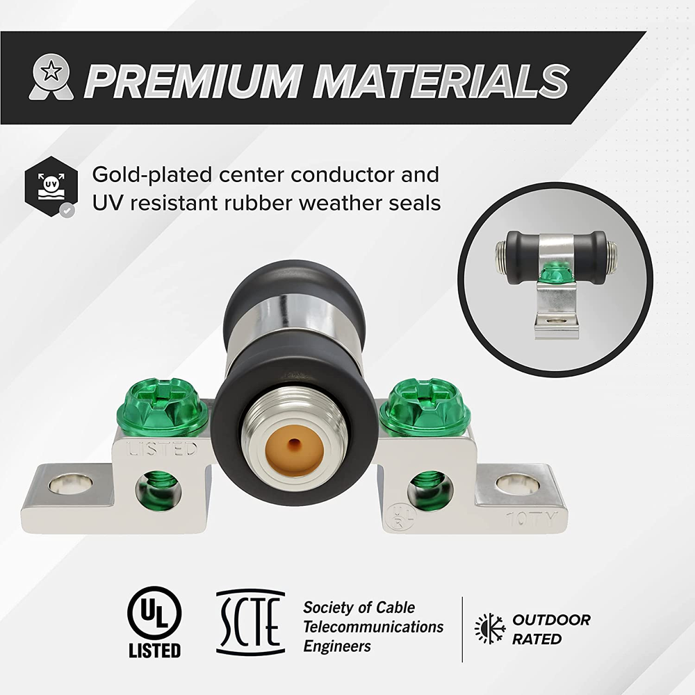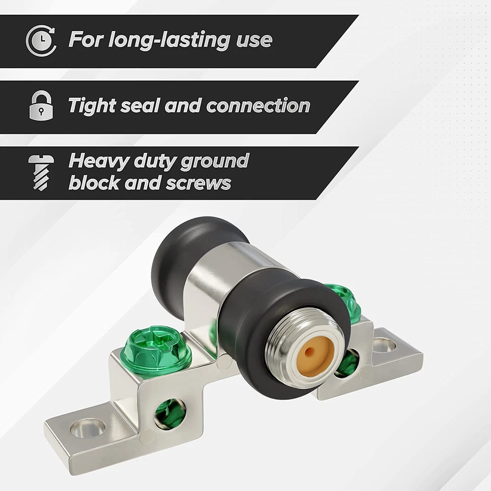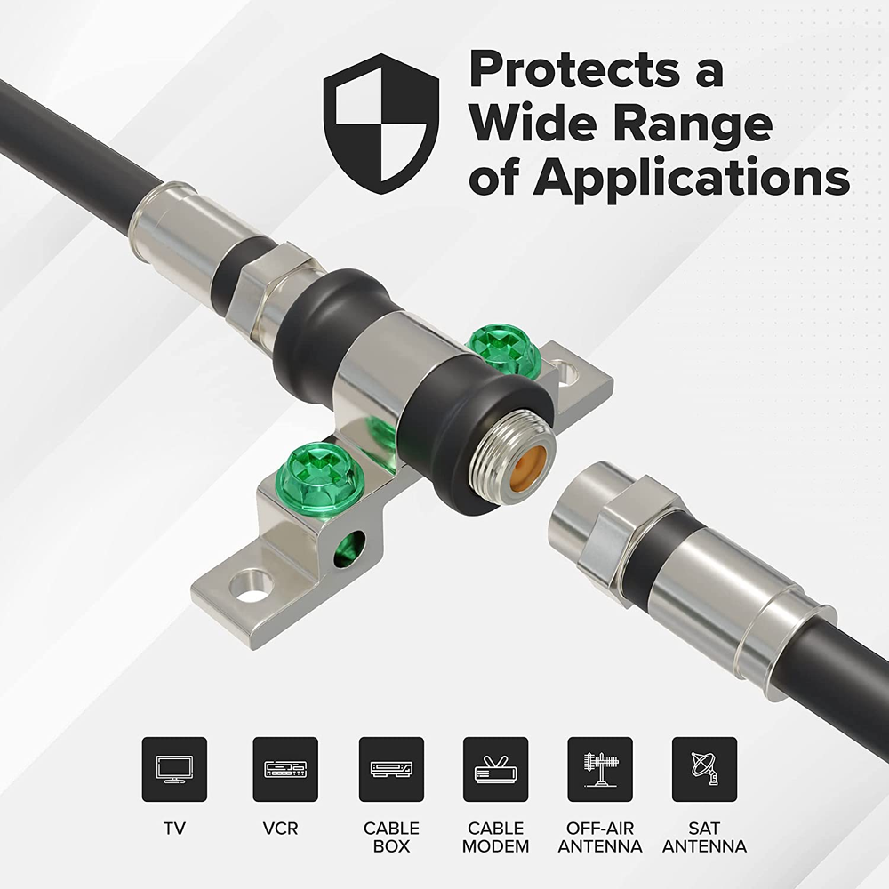Works With: Satellite, broadband, antennas, and many other devices. Creates Clearer Signal: Removes noise and static from coaxial cable (often caused by wind, interference, dry weather (static build-up), and DC ground loops). Required For: Satellite, cable TV, off-air, FTA, RV, antenna, and many other installations by NEC and/or most local electrical codes. Long-Lasting Features: Gold-plated center conductor, UL listed, rated from 0 MHz to 3 GHz, UV-resistant rubber weather seals, high frequency, low insertion loss (< 0.2 dB 2 MHz - 3 GHz). Includes: Single-port grounding block, weather seals, and mounting screws. Product Description