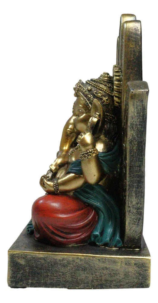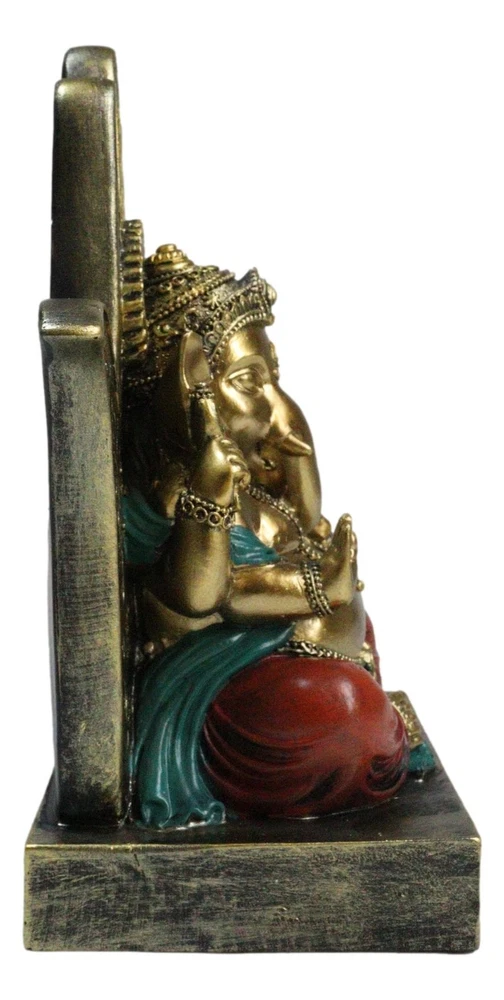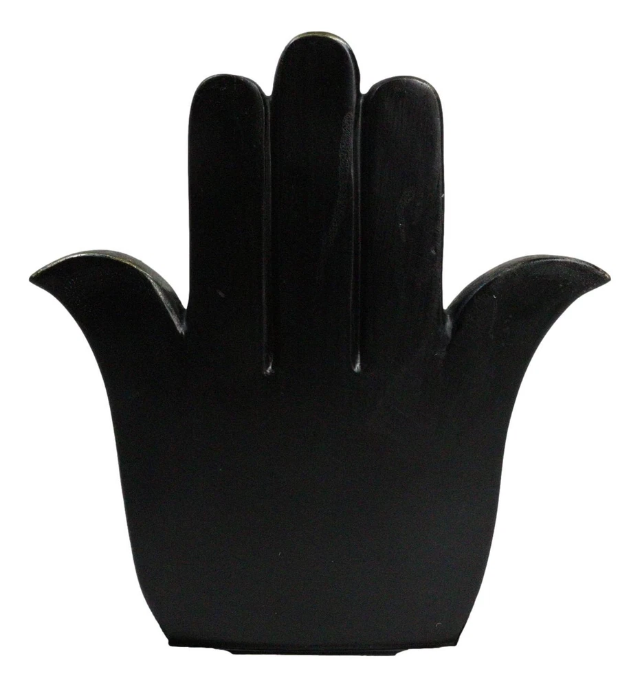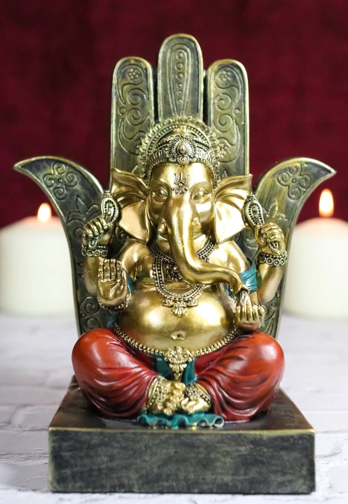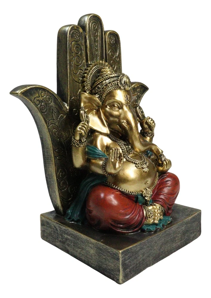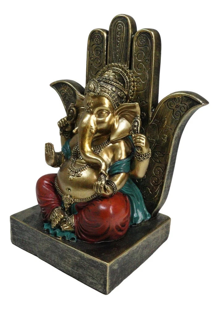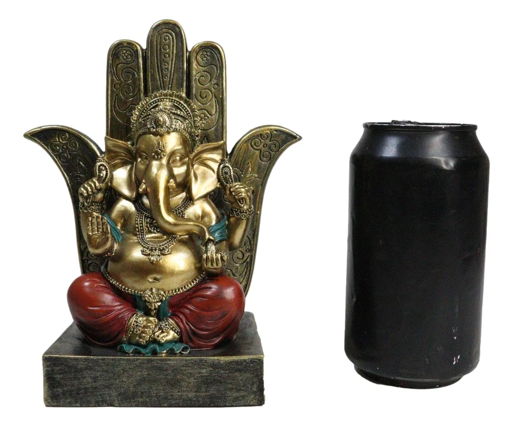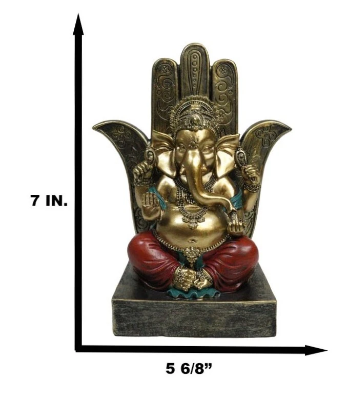 • This Ganesha With Hamsa Palm is made of designer composite polystone resin, hand painted and polished. Polystone which is composed of polyurethane, resin, and mixed with powdered stone additives that give it added weight and a porcelain or "stone-like" feel. Polystone is very durable and delivers a cleaner, more substantial representation of an original sculpture than other common materials. • This Ganesha With Hamsa Palm Figurine measures 7" tall, 5.75" wide and 3.5" deep approximately. It weighs about 1.25 pounds. • Immerse yourself in the divine energy with our Ganesha seated on a Hamsa Palm Figurine. This exquisite piece captures the essence of Hindu spirituality, featuring Lord Ganesha, the remover of obstacles, seated in regal splendor on a Hamsa palm throne. This figurine is a symbol of wisdom, prosperity, and divine grace. The Hamsa hand represents protection and blessings from the divine. Ideal for collectors, spiritual practitioners, or those seeking a touch of sacred art.