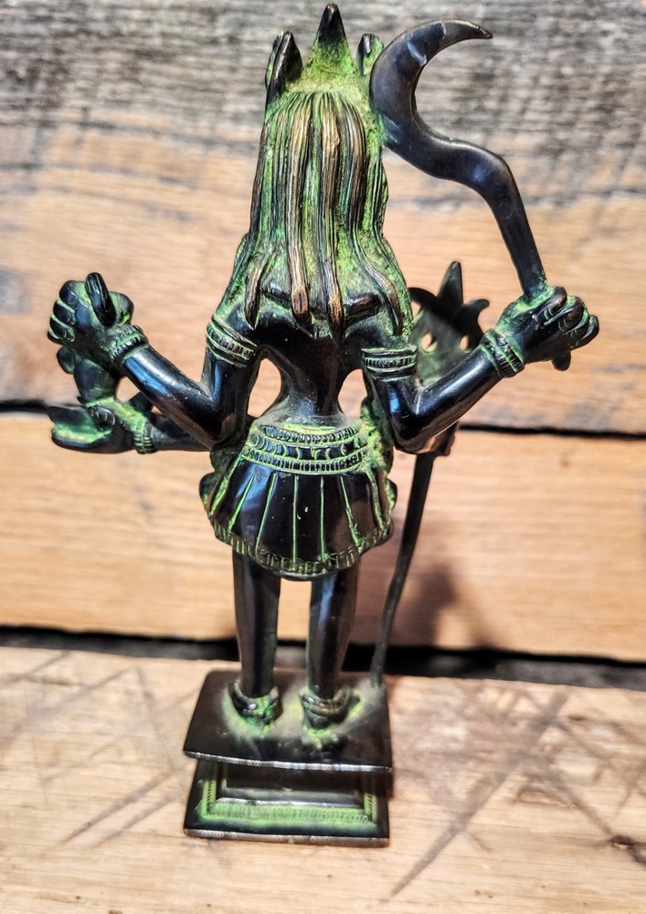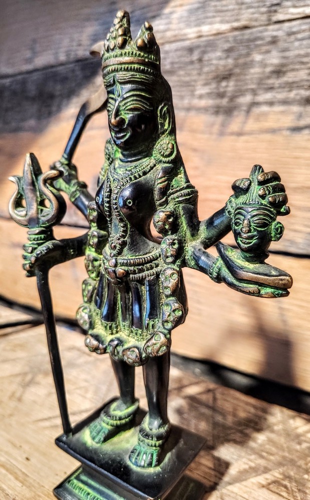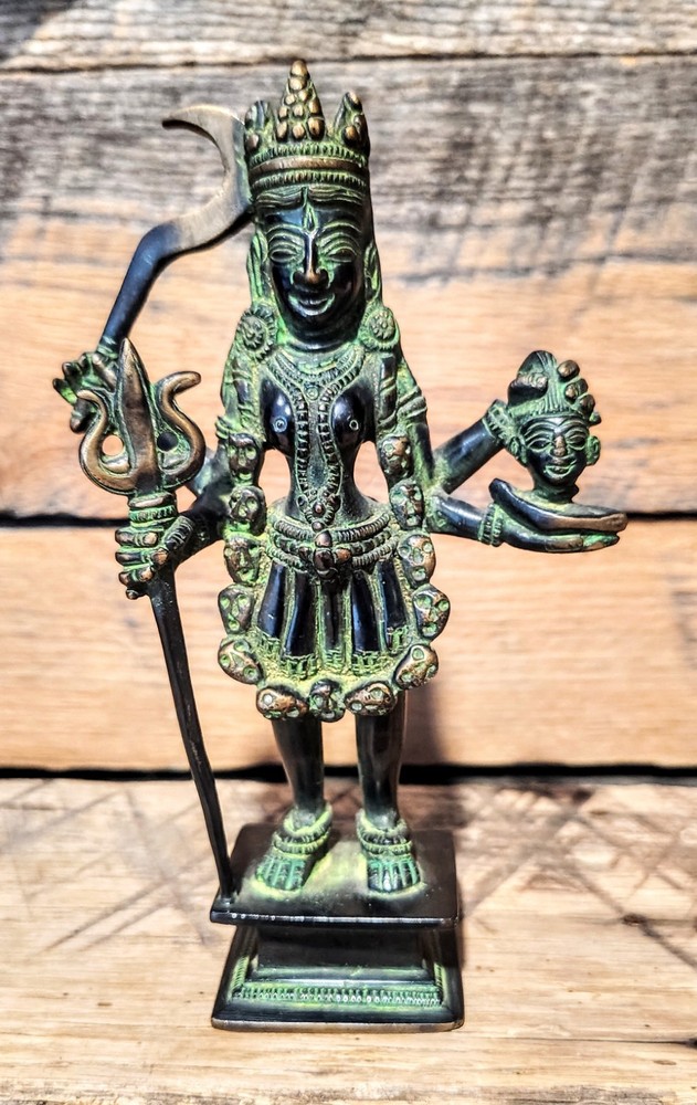 Material: Brass Statue Dimensions: 7.8 inch Height x 4.7 inch Width x 2 inch Depth Approx. Weight: 1.1 kg (2.4 lbs) The Product Is Handcrafted So There Might Be Some Difference Come In Color Or Size As you can see the image, It is in excellent condition, and was created by skilled craftsmen in traditional style with fine handcrafts . This is a great piece of valuable collection, a valuable personal alter or a very good present. the handwork is very fine with incredible detailing. Don't miss out this chance to get it The Hindu Goddess Kali Maa Bronze Finish Statue, made by Nikur essence in India, is a beautifully handcrafted collectible piece standing at a height of 7.8 inches. This statue represents the powerful Hindu goddess Kali Maa, known for her role as the goddess of destruction. The bronze antique finish adds a unique touch to the piece, making it a visually stunning addition to any collection or religious shrine.