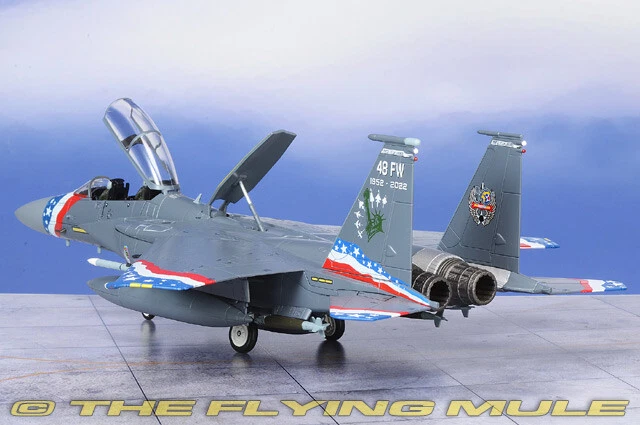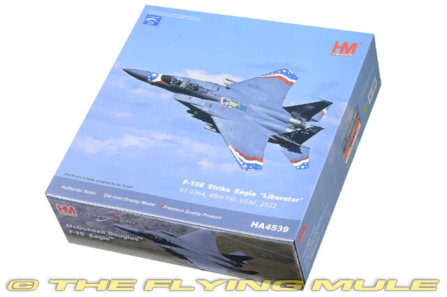 Hobby Master 1:72 Air Power Series HA4539 Boeing F-15E Strike Eagle Diecast Model USAF 48th FW, #92-0364 Liberator, RAF Lakenheath, England, 48th FW 70th Anniversary 2022 Limited Edition 1:72 Scale Length Width Boeing F-15E Strike Eagle 10.75" 7.25" The 48th Fighter Wing is part of the United States Air Force's Third Air Force, assigned to Headquarters Air Command Europe and United States Air Forces in Europe (USAFE). It is based at RAF Lakenheath, England. The 48 FW is the only F-15 wing based in Europe which hosts two F-15E Strike Eagle squadrons. The wing also hosts two F-35A Lightning II squadrons. The 48 FW was given the name "Statue of Liberty Wing" on 4 July 1954 and remains the only U.S. Air Force unit with both a name and a numerical designation. Boeing F-15E Strike Eagle Designed to meet US Air Force requirements for an air superiority fighter to replace the F-4 Phantom, the F-15 Eagle first flew on July 27, 1972. Following reviews of proposals, the United States Air Force selected McDonnell Douglas's design in 1969 to meet the service's need for a dedicated air superiority fighter. Since entering service in 1976, it is among the most successful modern fighters, with over 100 victories and no losses in aerial combat, with the majority of the kills by the Israeli Air Force. © Copyright 2003-2024 The Flying Mule, Inc. Hobby Master's 1:72 scale F-15 is produced with a high metal content using state-of-the-art manufacturing techniques. The model features near seamless construction as seen on all Hobby Master products, and this is particularly evident with the tight-fitting conformal fuel tanks present on the F-15E variant. Separate open and closed canopy and speed brakes are included, yielding uncompromising detail that functional hinges would lack at this scale. Other fine features include a detailed cockpit interior, a variety of ordnance and drop tanks appropriate to the paint-scheme and landing gear that constructed as completed subassemblies for easy installation. © Copyright 2003-2024 The Flying Mule, Inc. Hobby Master 1:72 Air Power Series The Hobby Master "1:72 Air Power Series" range presents detailed, ready-made diecast models of military aircraft. Hobby Master "1:72 Air Power Series" diecast airplanes feature: Diecast metal construction with some plastic components. Realistic panel lines, antennas, access panels and surface details. Pad printed markings and placards that won't fade or peel like decals. Opening canopies, revealing detailed cockpit interiors. Interchangeable extended/retracted landing gear. Presentation stand to display the aircraft "in flight". Authentic detachable ordnance loads complete with placards. Accurately detailed underside with concealed screwheads. © Copyright 2003-2024 The Flying Mule, Inc.