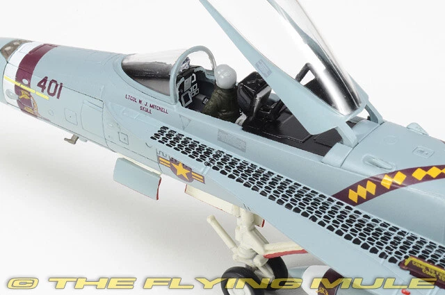 Hobby Master 1:72 Air Power Series HA3583 McDonnell Douglas F/A-18C Hornet Diecast Model USMC VMFA-323 Death Rattlers, NA401, USS Nimitz, 2021 Limited Edition 1:72 Scale Length Width McDonnell Douglas F/A-18C Hornet 9.25" 6.25" Marine Fighter Attack Squadron 323 (VMFA-323) is an aircraft carrier-based aviation squadron of the United States Marine Corps. The squadron is equipped with the McDonnell Douglas F/A-18C Hornet and is based at Marine Corps Air Station Miramar, California, United States. McDonnell Douglas F/A-18C Hornet Designed as a replacement for the A-4 Skyhawk and the A-7 Corsair II and as a complement to the F-14 Tomcat, the F/A-18 first flew on November 18, 1978. Perhaps best known as the aircraft of the US Navy's Blue Angels, this carrier-capable, supersonic, all-weather fighter has many roles, including fighter escort, fleet air defense and close air support. The F/A-18 is a versatile aircraft: it can operate from carriers or land bases and a single switch converts it from fighter to strike mode. During Operation Desert Storm, the F/A-18 proved that, on a single mission, one aircraft could serve as both fighter and a bomber. © Copyright 2003-2024 The Flying Mule, Inc. Hobby Master's 1:72 scale F/A-18 Hornet is a quality model with many fine features, skillfully designed and manufactured with modern techniques. The canopy can be removed for an unobstructed view of the cockpits pad-printed instrument panel and interior features. A separate canopy with a fixed actuator is included for display in the open position. The speed brake can be configured in the deployed position, and the landing gear and gear doors are constructed as subassemblies for quick and easy ground configuration. The series includes the single-seat F/A-18C and the two-seat F/A-18D. Each release is fitted with removable ordnance appropriate to its mission (see photos). © Copyright 2003-2024 The Flying Mule, Inc. Hobby Master 1:72 Air Power Series The Hobby Master "1:72 Air Power Series" range presents detailed, ready-made diecast models of military aircraft. Hobby Master "1:72 Air Power Series" diecast airplanes feature: Diecast metal construction with some plastic components. Realistic panel lines, antennas, access panels and surface details. Pad printed markings and placards that won't fade or peel like decals. Presentation stand to display the aircraft "in flight". Accurately detailed underside with concealed screwheads. © Copyright 2003-2024 The Flying Mule, Inc.