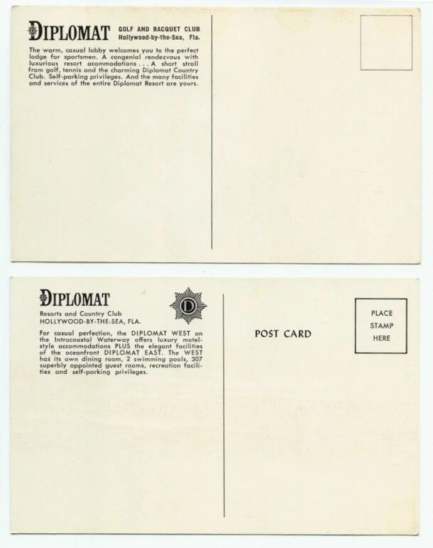 Hollywood FL The Diplomat Resort Lot of 2 Postcards ~ Florida Our Inventory #m42101 We Combine Shipping On Multiple Item Purchases....Please Wait for or request an invoice with combined shipping Powered by SixBit's eCommerce Solution