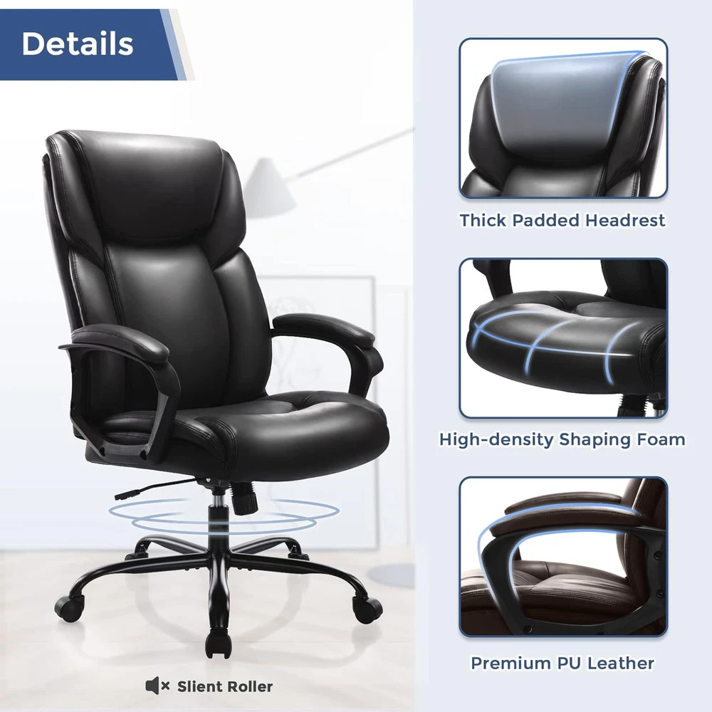 Store New Arrivals Add to Favorite View Feedback Contact Home Office Executive Desk High Back Computer Adjustable Height and Swivel Task Lumbar Head Support Chair, Leather Black Description Item model number ZU-NO39-BK Style Modern Cushion Style Boxed Edge Pattern Solid Age Range (Description) Adult Country of Origin China Is Electric No Theme Office/Gaming Frame Material Nylon Seat Material Type Faux Leather Material Nylon, Leather Item Weight 20 Pounds Unit Count 1.0 Count Room Type Office, Classroom, Library, Study Room Is Customizable No Tilting Yes Maximum Weight Recommendation 250 Pounds Model Name Home office chairs Arm Style With arms Finish Type Brushed Included Components Caster Indoor/Outdoor Usage Indoor Chair Backrest Width 22 Inches Back Style Solid Back Item Weight 20 pounds Fill Material Foam Surface Recommendation Hard Floor Is Foldable No Special Feature Adjustable Height, Arm Rest, Ergonomic, Rolling Furniture base movement Swivel Color Leather Black Form Factor Upholstered Furniture Finish Leather Shape L-Shaped Recommended Uses For Product Office, Relaxing, Reading, Gaming Product Dimensions 30"D x 22"W x 48"H Seat Depth 19 inches Size 30D x 22W x 48H in Improves Productivity -- The brown leather executive office chair with a height adjuster allows a height range from 19.5" to 23.4", adapting to various desks. This rolling desk chair with double upholstered seat cushions allows comfortable sitting at your desk while working, studying, or entertaining. The large, wide, comfortable high-back computer chair with wheels can maximize your efficiency at home or in the workplace. Built For Comfort -- This home office desk chair is designed to improve the sitting posture while working in the office and help avoid stiffness, pain, and discomfort in the neck and back. This big, tall office chair features an ergonomic S-shaped arch-back design that provides optimal support for the lumbar and neck. The tilt tension knob underneath the seat adjusts the flexibility of the lumbar support office chair to rock backward, with a tilt angle range of 90° to 110° to help relax back muscles. Luxury Look Of Leather -- The high-quality PU leather headrest, breathable backrest, thick seating cushion, and high resilience foam material allow you to sit comfortably for a long time. Soft leather cushion for armrests is durable and easy to clean. It is resistant to corrosion, stains, water, fading, and scratches, making it a top choice for upscale conference room office chairs. The elegant, modern, stylish leather office chair is an ideal gift for office workers, friends, gamers, or students. Sturdy & Durable -- Our modern desk chair with arms has a heavy-duty and durable nylon base, a safety gas lift, and rolling casters, which can support adults up to 250 pounds. The high back office chair matches other high-quality office accessories and strictly meets BIFMA Standards to maximally ensure your safety. 360-degree swivel multi-directional wheels ensure smooth rolling for long periods, providing freedom of movement and the convenience of communicating with people nearby. Easy To Install -- The tall adjustable office chair comes with all the necessary hardware and tools. With an uploaded video, most installations can be finished in about 15-20 minutes. This heavy-duty office chair suits various occasions like offices, game rooms, living rooms, bedrooms, dens, etc. It will make your space more modern and elegant. Product Description A Great Executive Office Chair for You! If you are looking for a computer desk chair at home or office, ZUNMOS PU leather office chair may be your best choice. It can hold 250 lbs for max weight, extra padded backrest for more comfort, and chair wheels are super smooth for movement. Meanwhile, the high resilience foam and ergonomic design can support your hours of working with no fatigue. This is a great executive swivel task chair! Thick & Wide Headrest Thickened & comfortable headrest can better reduce fatigue and protect the cervical vertebra while working or have a rest. Overfilled Lumbar Support Big and thick backrest, padding lumbar, close to the curve of the back, relax your waist and back while working and resting. Padded Armrest Soft armrest pads to provide your arms a comfortable experience. Soft & Flat Seat A double padded thickened comfort seat relaxes the hips, and bears the pressure of sitting for a long time working. Ergonomic Design The double-layer ergonomic backrest consists of soft elastic cotton and a native sponge that can fit the human spine and support the lumbar. BIFMA Certification Gas Lift High-quality gas lift withstands more pressure and lasts longer Smooth Rolling Casters Quiet rolling, flexible operation, office chair with the 360-degree swivel and smooth-rolling casters ABOUT US We offer the best prices around on high quality products. Our E-store includes media such as books, movies, music and games while offering electronics, toys, sporting apparel, clothing, tools, general home, garden items and more. SHIPPING We are always working hard to ensure your package arrives as soon as possible. Please understand that some factors like weather, high postal traffic, and the performance of shipping companies are outside of our control. We offer free shipping to the lower 48 states and ship within 2 business days of payment, usually sooner. We do not accept P.O. Boxes. Please provide a physical address. For shipping outside of the continental USA, we only use eBay's Global Shipping Program.The item is shipped to KY and then sent to the rest of the world. International customers are responsible for all duties and taxes. Continue to check out in order to calculate costs for shipping the item to your country. Messages regarding eBay's Global Shipping Program MUST be directed at eBay EXCLUSIVELY. RETURNS We offer a 30-Day Return Policy on items which you are not completely satisfied with. You have the option for a full-refund or an exchange of the ite
