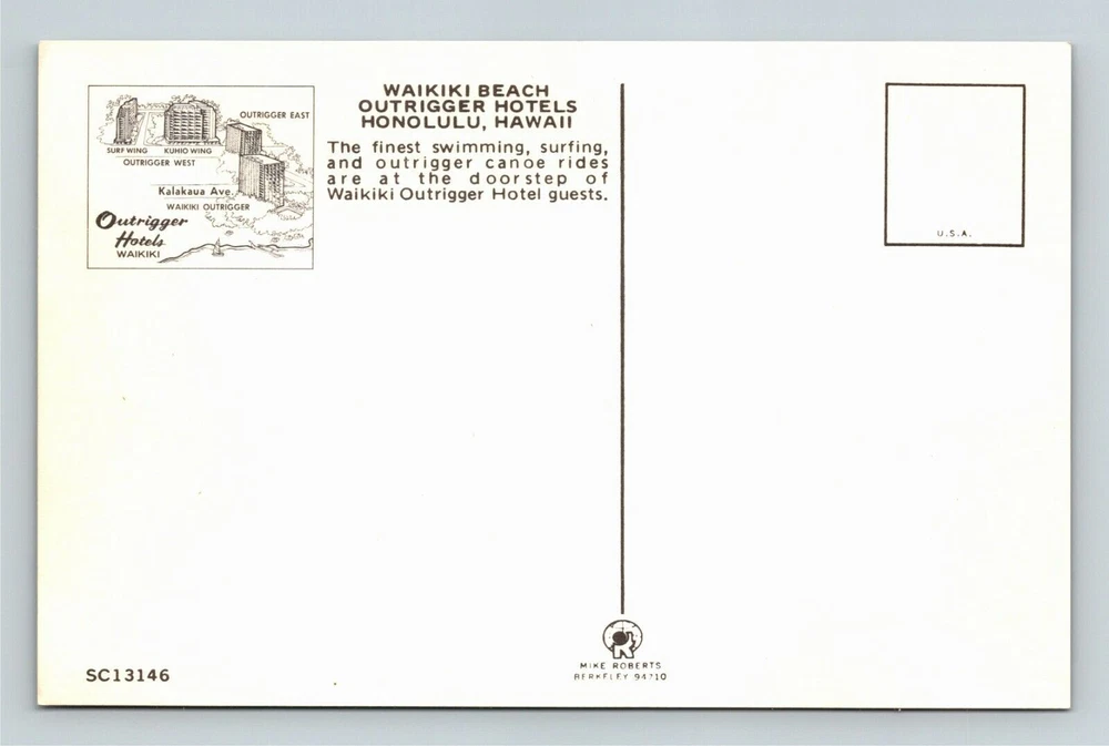 Honolulu HI-Hawaii, Waikiki Beach, Outrigger Hotels, Antique Vintage Postcard