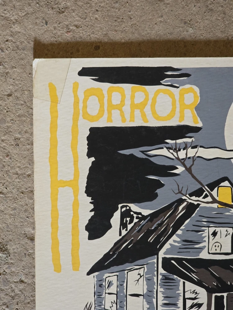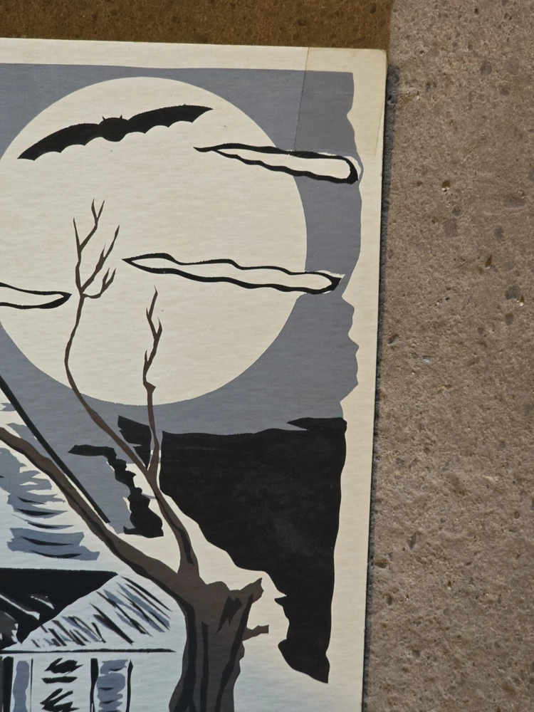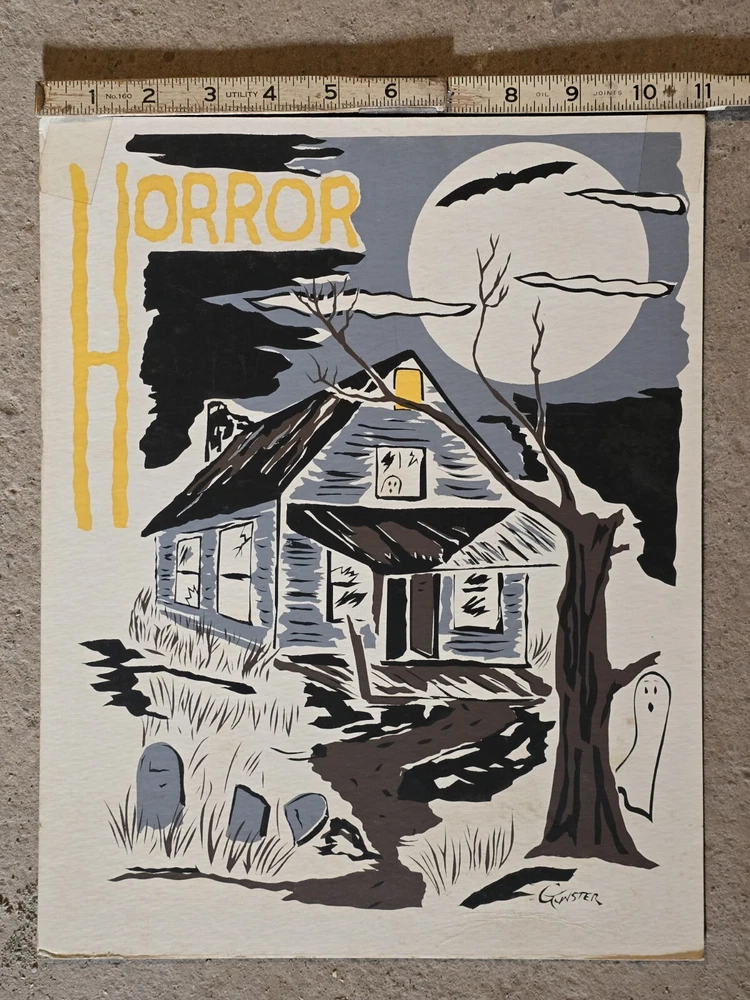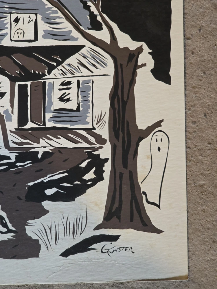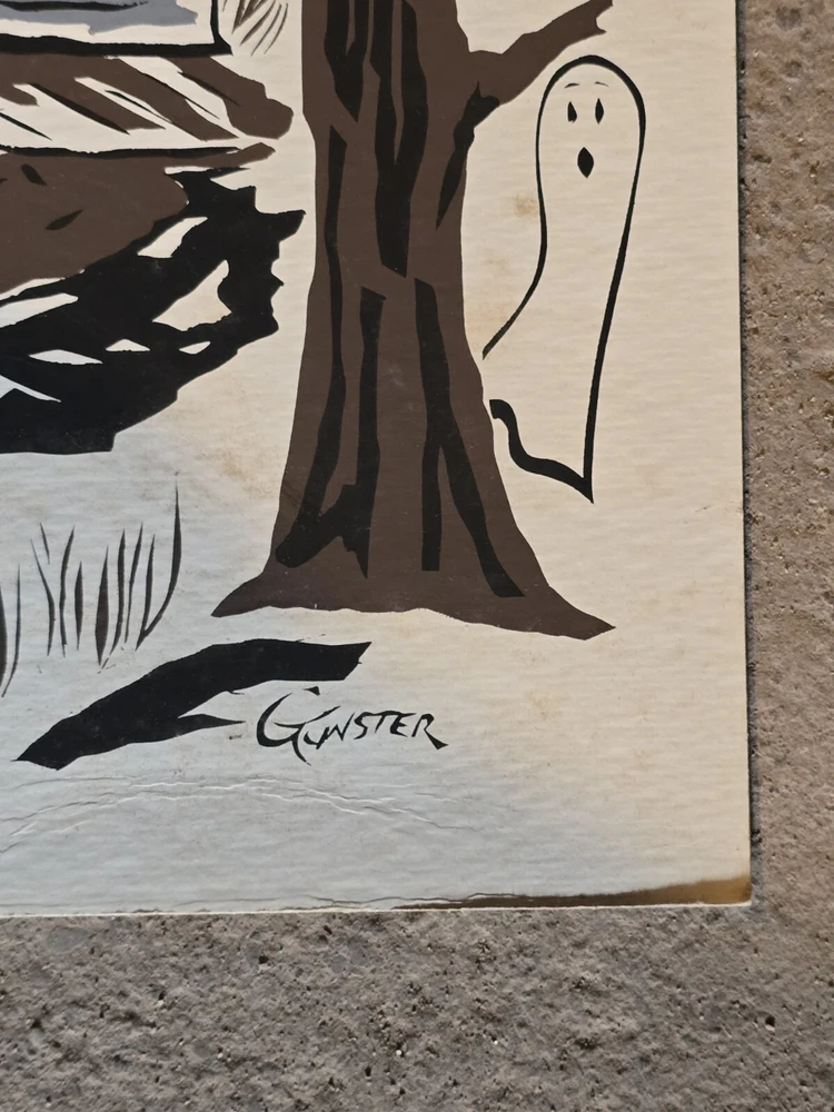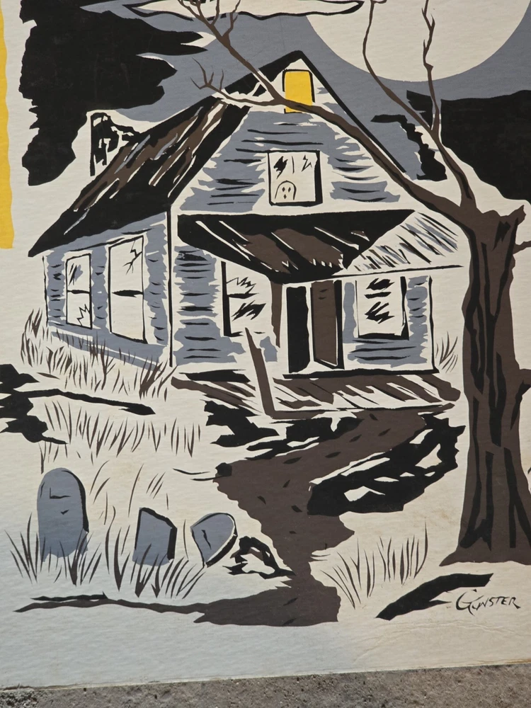 For your consideration is this silkscreen on Cardboard art print. Signed Gunster. Horror themed with a haunted house, ghost, graveyard, and topped off with bats. A piece of tape adornes each top corner. Small crease. From the Jim Sotet collection. Sotet was a Mercury Records Executive from the 1970s until his retirement in the mid 2000s. See photos for exact item condition and measurements. Check out our ebay store for more rare and rad collectibles!
